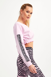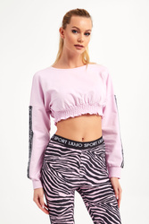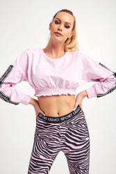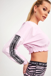Bluza marki Liu Jo Sport w kolorze cukierkowego różu. Fason typu cropped. Obniżona linia ramion. Długie rękawy z sygnowanym, ozdobnym lampasem wykończonym cyrkoniami. Długie rękawy, dół i okrągły dekolt typu o-neck zakończone elastycznym ściągaczem. Dół marszczony. Model z linii "Liu Jo Better", która wspiera zrównoważona modę. Wykonana z elastycznej bawełny.