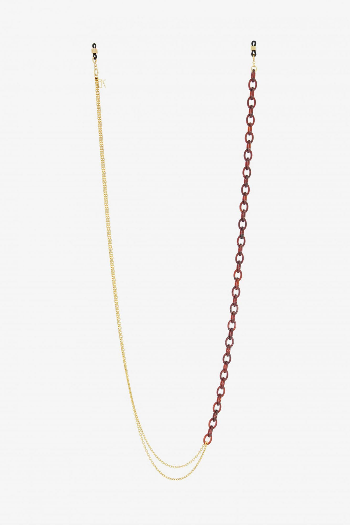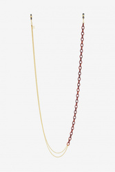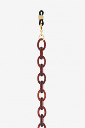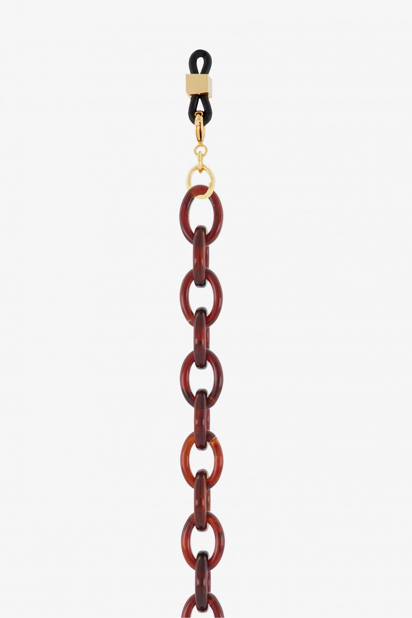Biżuteryjny łańcuszek do okularów w złoto-brązowym kolorze. Połączenie fasetowego łańcuszka wplecionego w akrylowe grubsze pierścienie. Doskonały dodatek do okularów, wzbogacający każdą stylizację.