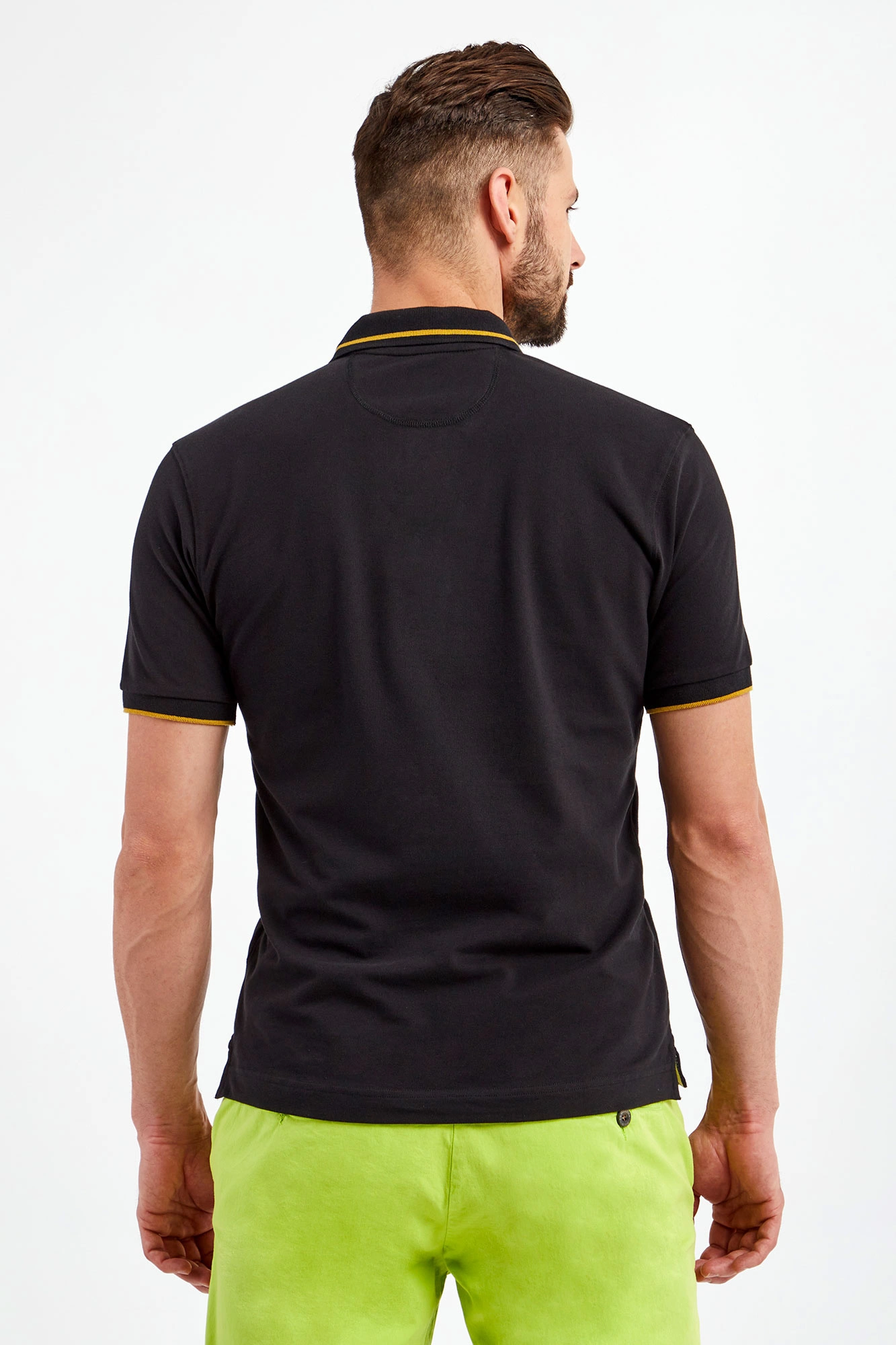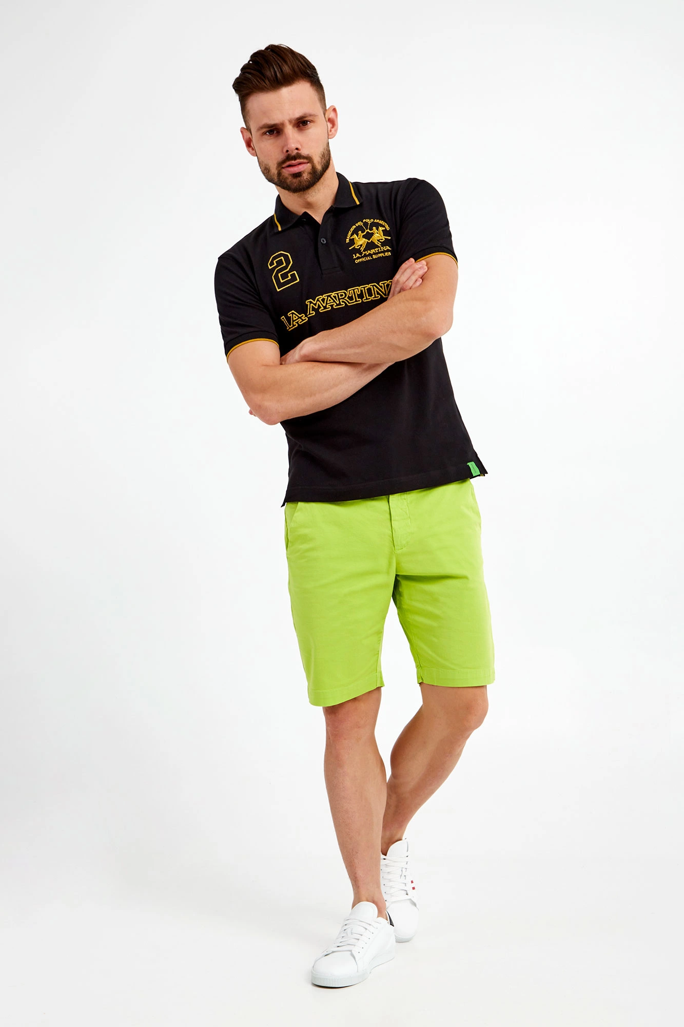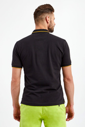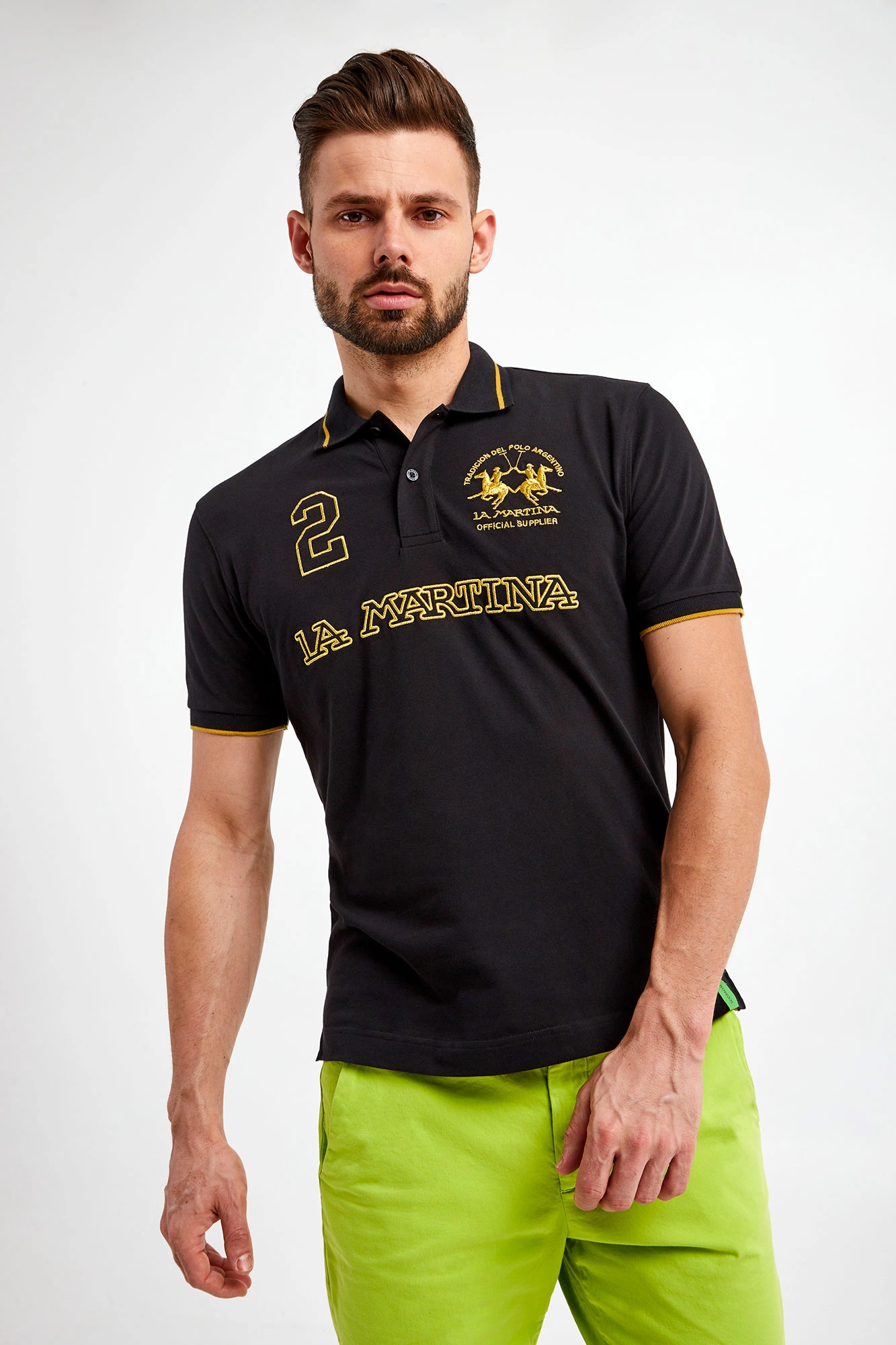 Polo marki La Martina w czarnym kolorze. Fason typu regular fit. Z klasycznym kołnierzem ze złotym lampasem, zapinanym za pomocą sygnowanych guzików. Z przodu duże hafty z logo i nazwą marki w złotym kolorze. Krótkie rękawy wykończone elastycznym ściągaczem z lampasem. Po bokach ozdobne rozcięcia. Wykonane z elastycznej bawełny.