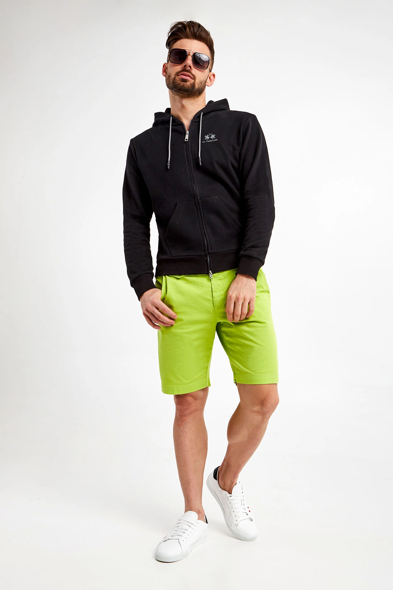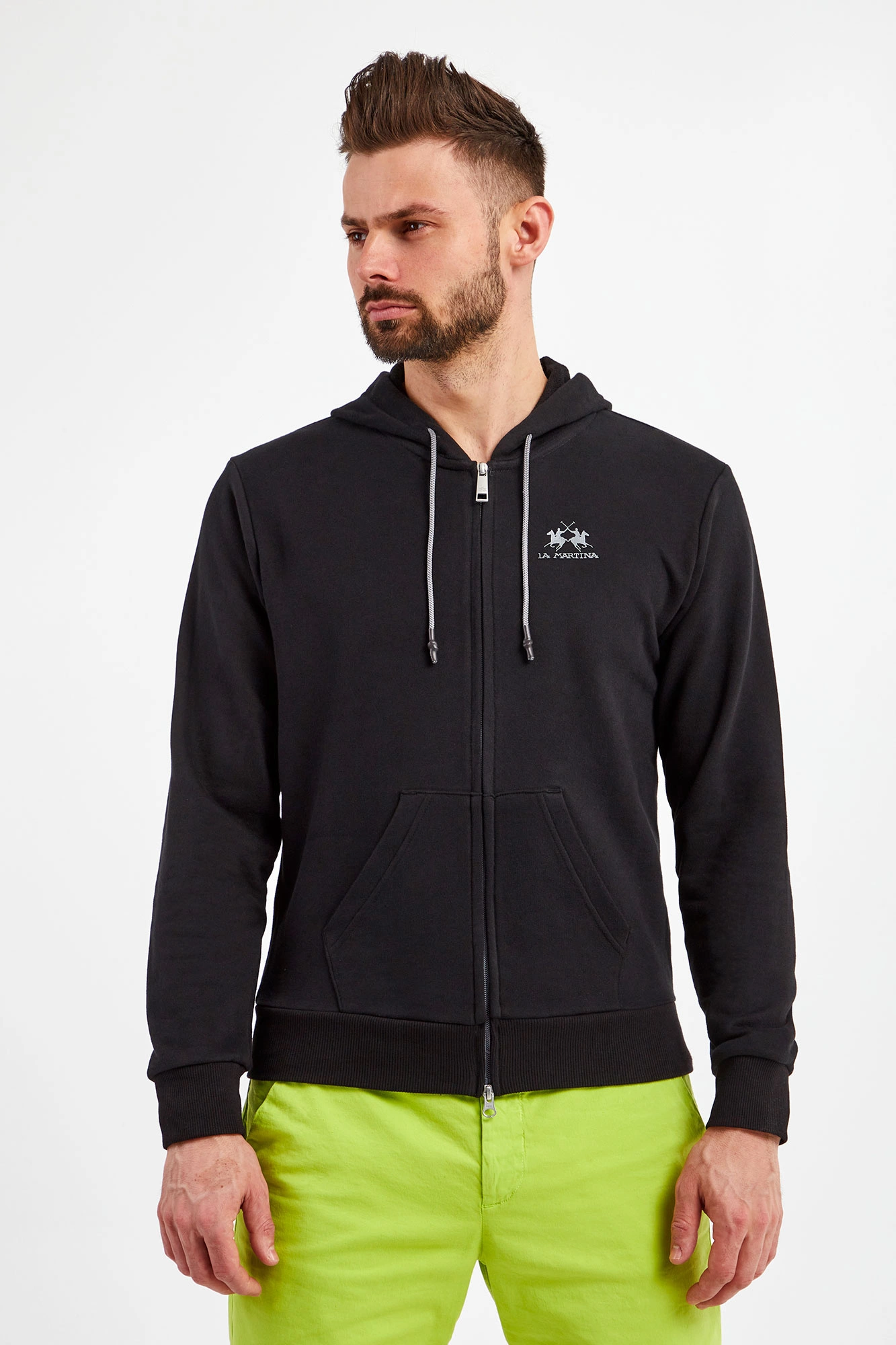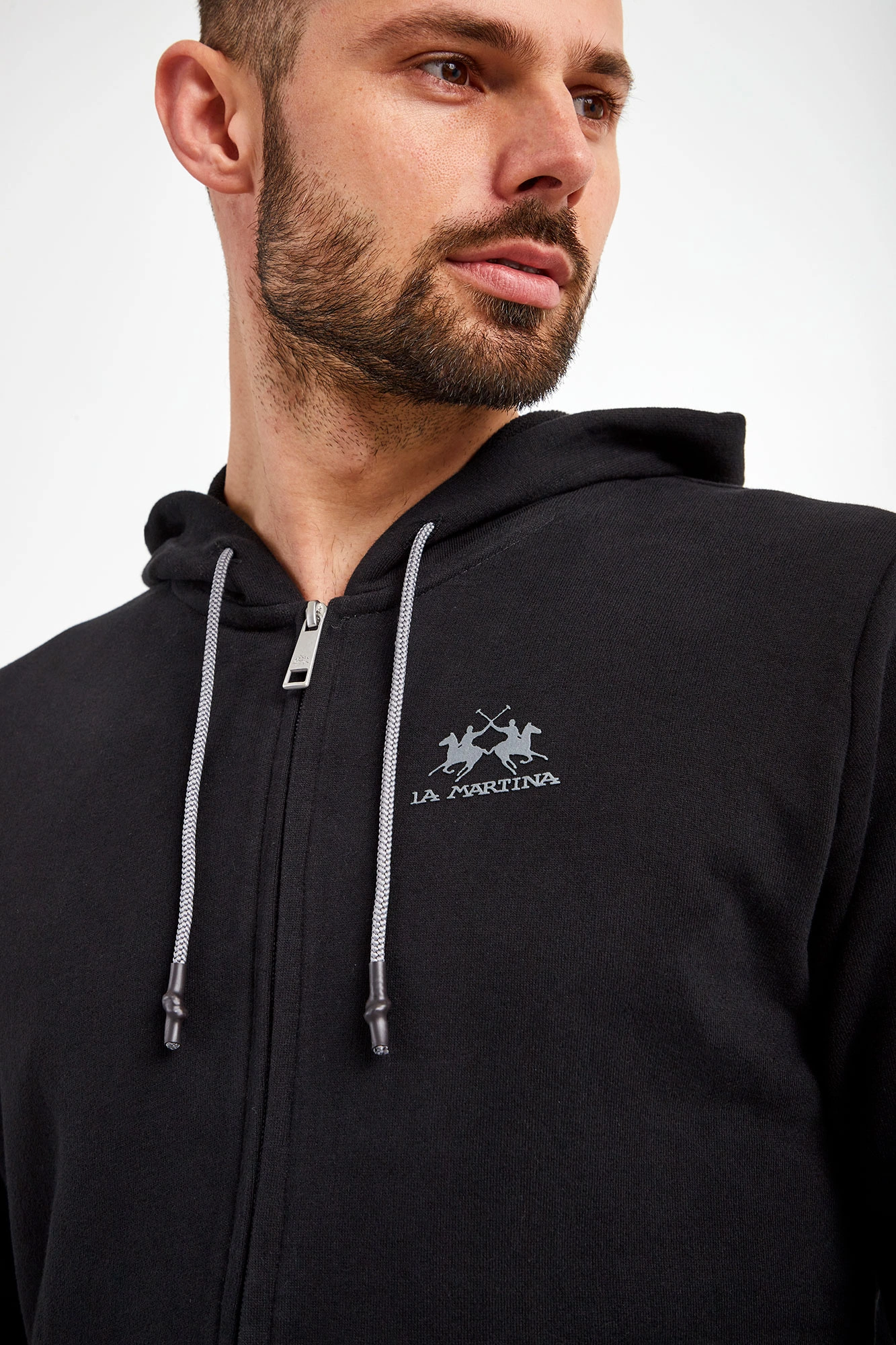 Bluza marki La Martina w czarnym kolorze. Fason typu regular fit. Z kapturem regulowanym za pomocą troczków w szarym kolorze. Zapinany za pomocą dwukierunkowego zamka błyskawicznego z sygnowanymi suwakami. Z przodu kieszeń typu kangurek i gumowany nadruk z logo i nazwą marki w szarym kolorze. Długie rękawy i dół wykończone elastycznym ściągaczem. Wykonana z czystej, mięsistej bawełny.