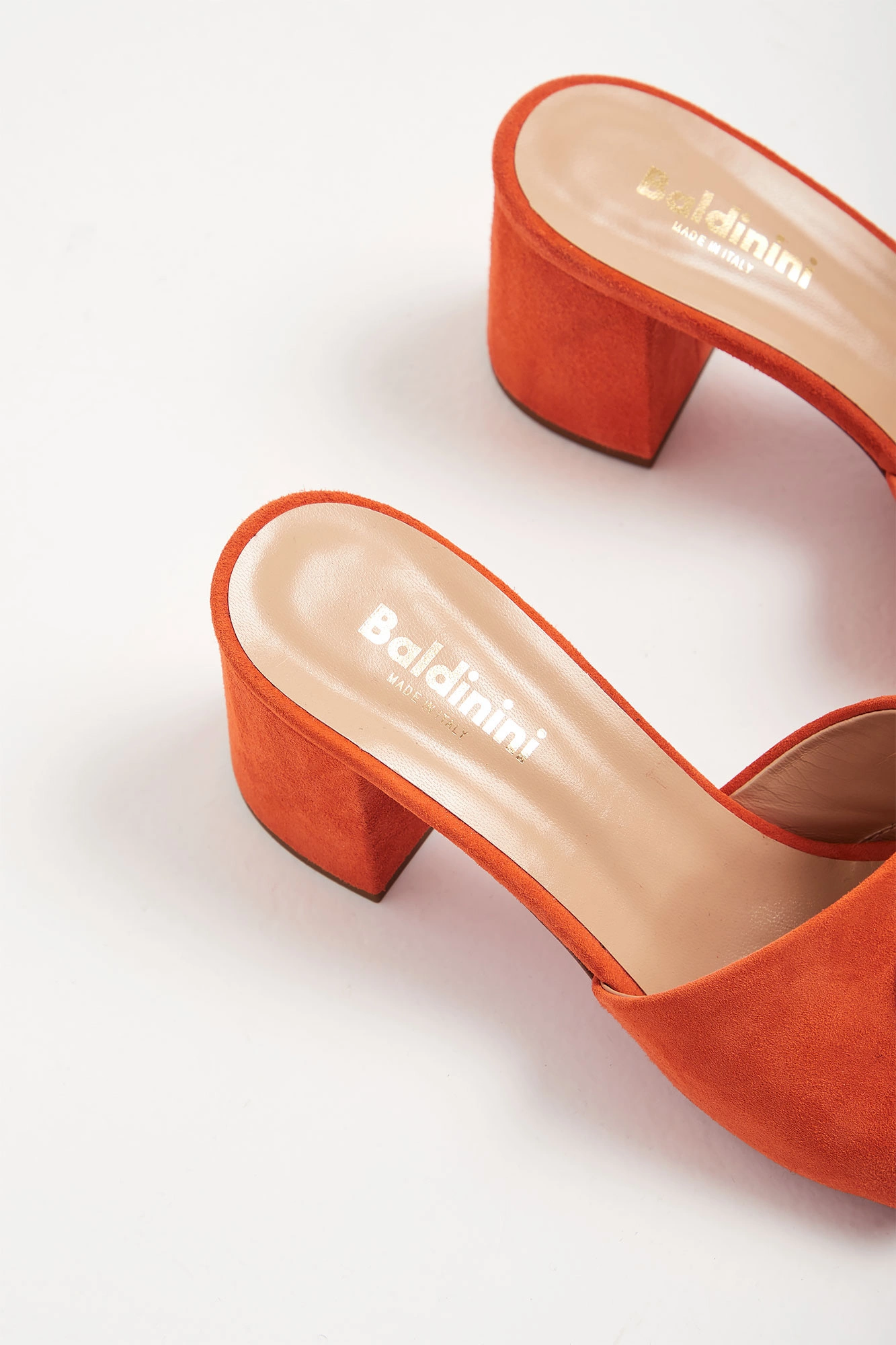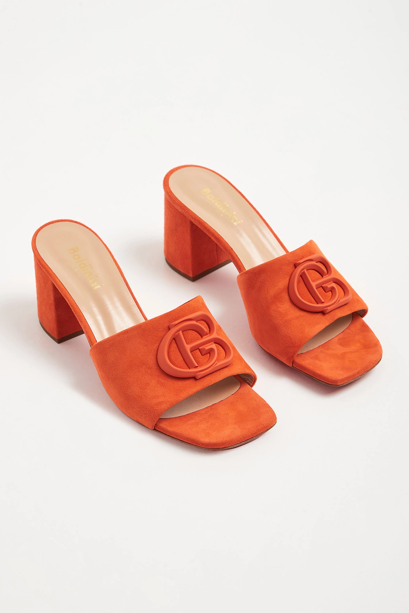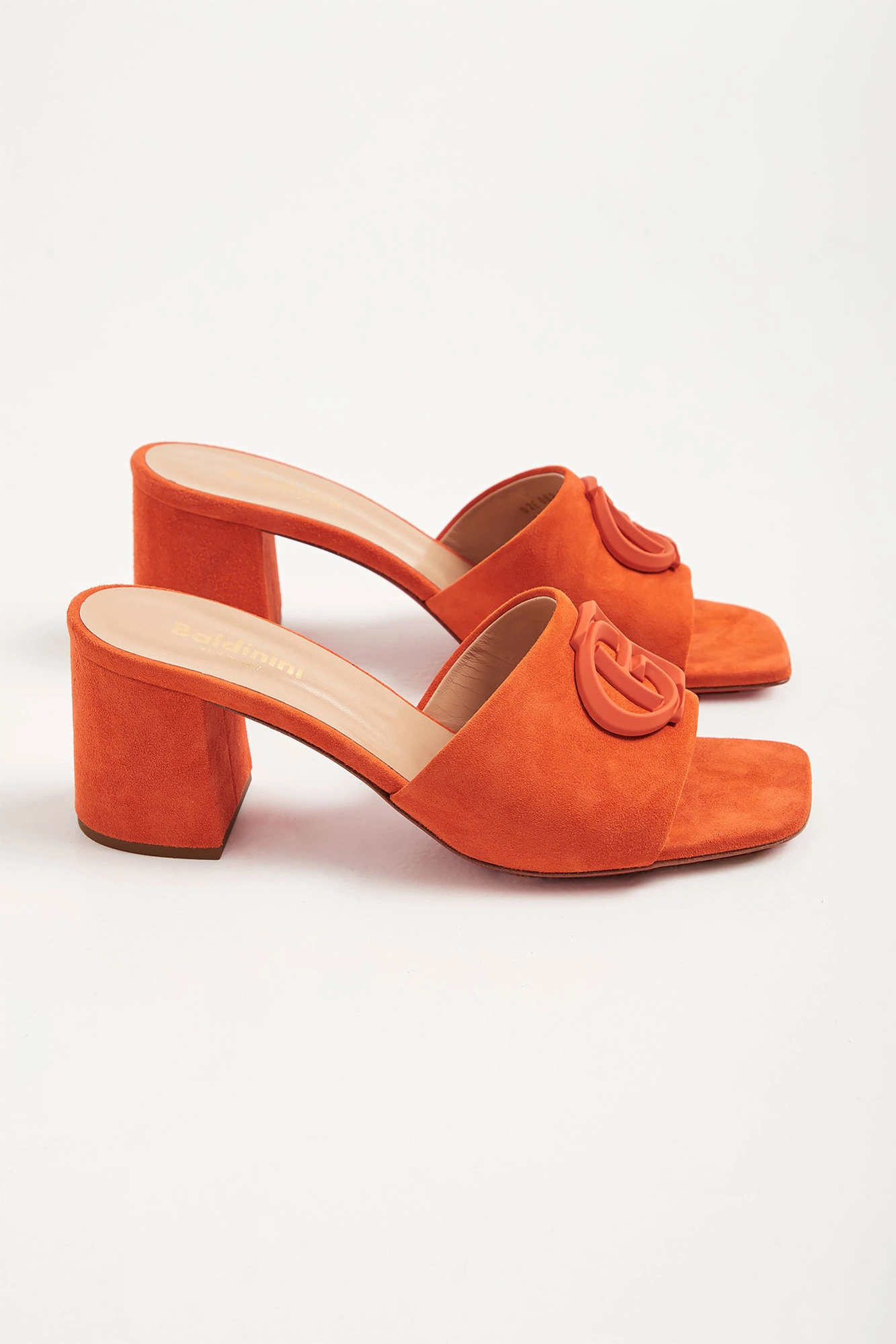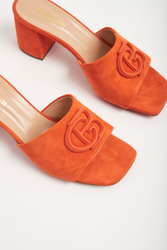 Pomarańczowe klapki marki Baldinini. Wykonane ze skóry zamszowej. Z przodu szeroki pas z dużym tłoczonym logo marki. Wyściółka beżowa z tłoczoną nazwą marki w złotym kolorze.