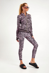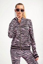 Bluza marki Liu Jo Sport. Na całości różowo-czarny wzór z motywem zebry. Fason regular fit. Ze stójką. Z przodu zapinana za pomocą zamka błyskawicznego w złotym kolorze z sygnowanym suwakiem. Długie rękawy i dół wykończone elastycznym ściągaczem. Z przodu metalowa aplikacja z nazwą marki. Model z dwoma kieszeniami. Wykonana z elastycznej wiskozy.