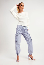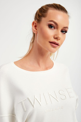Sweter marki Twinset w kolorze złamanej bieli. Fason typu oversize. Okrągły dekolt typu o-neck wykończony ściągaczem. Z przodu duży haft nazwy marki w kolorze swetra. Obniżona linia ramion. Długie rękawy i dół wykończone szerokim ściągaczem. Wykonany z elastycznej wiskozy.