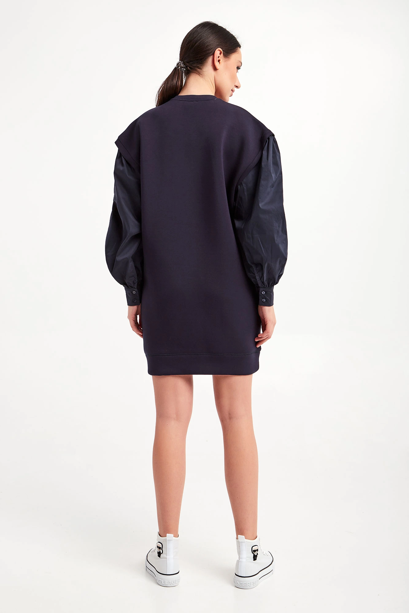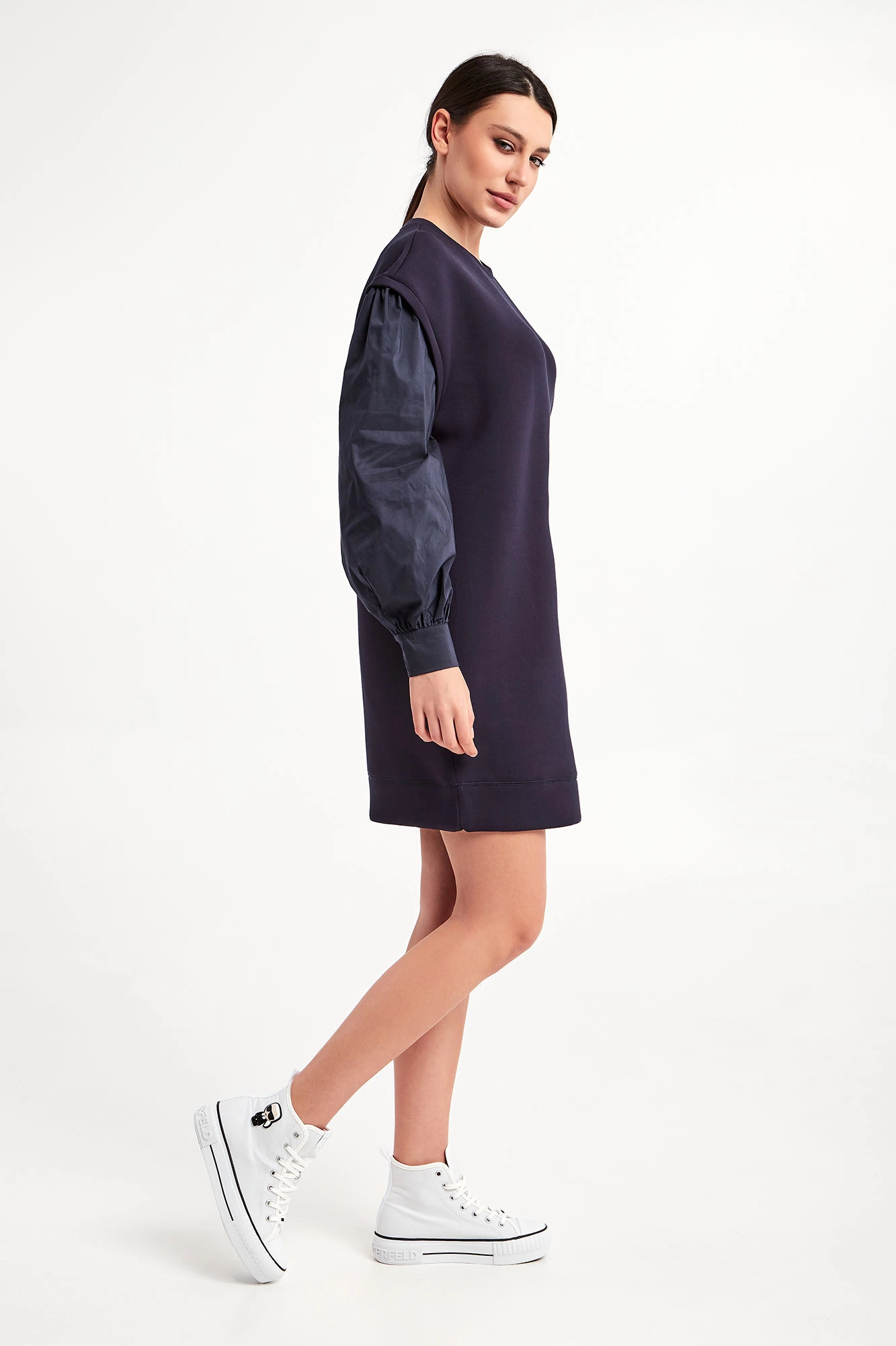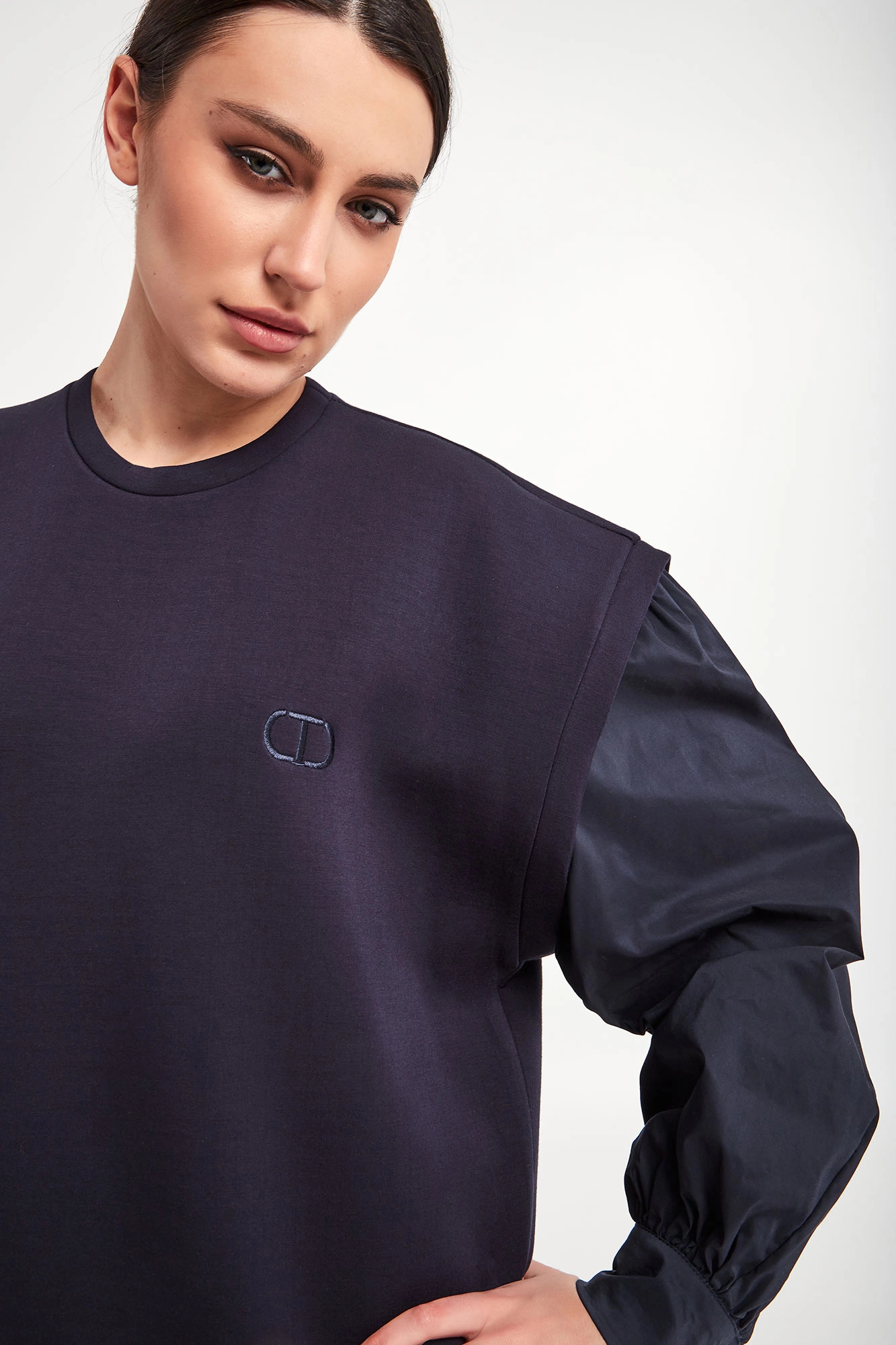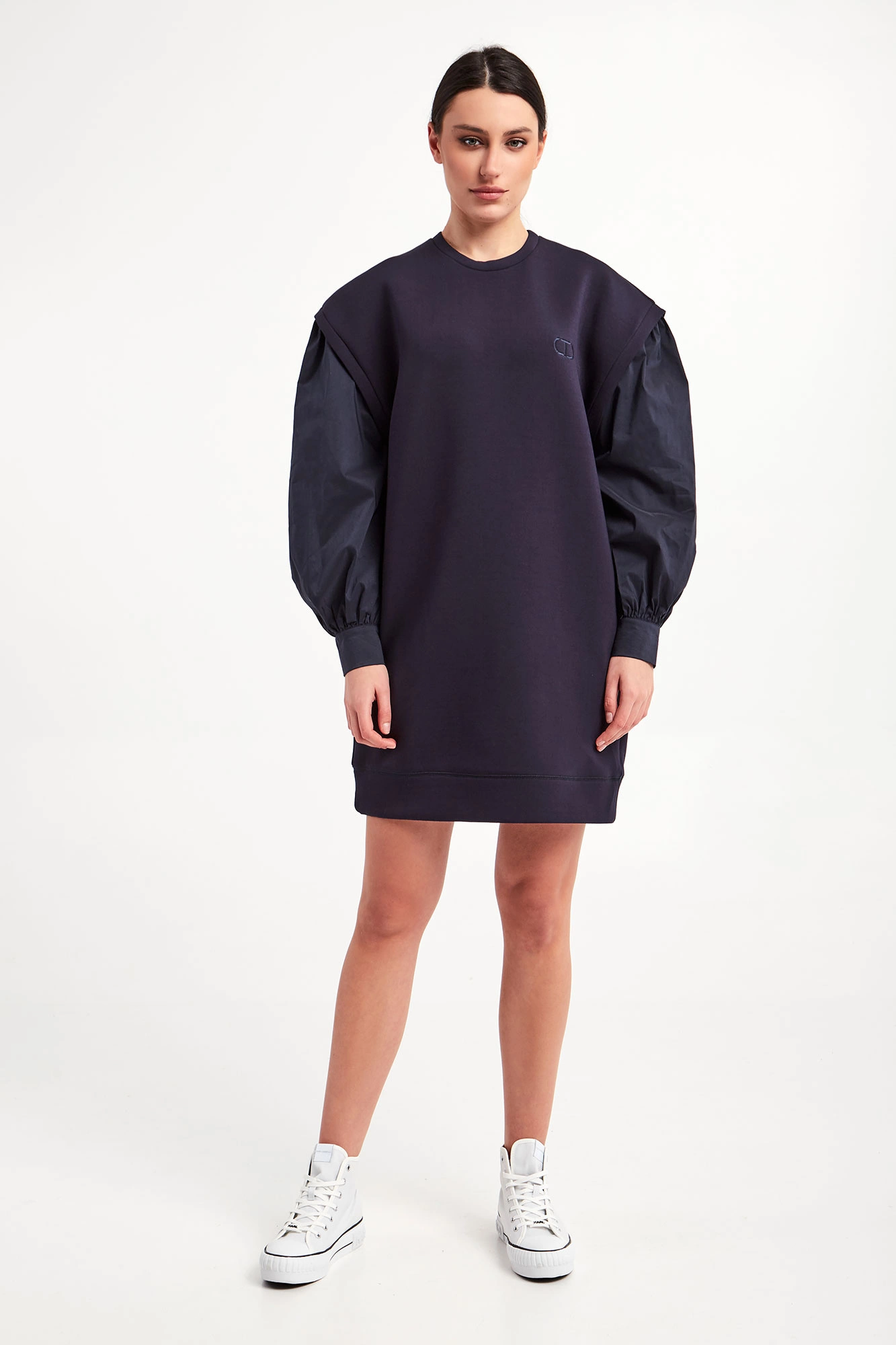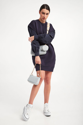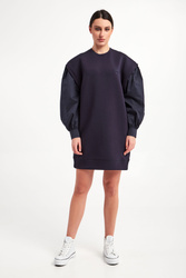 Sukienka marki Twinset w granatowym kolorze. Fason typu relaxed fit. Obniżona linia ramion. Balonowe rękawy wykończone mankietami zapinanymi za pomocą guzików. Z przodu haft z logo marki. Długość mini. Dekolt typu o-neck i dół wykończone ściągaczem. Wykonana z elastycznej wiskozy.