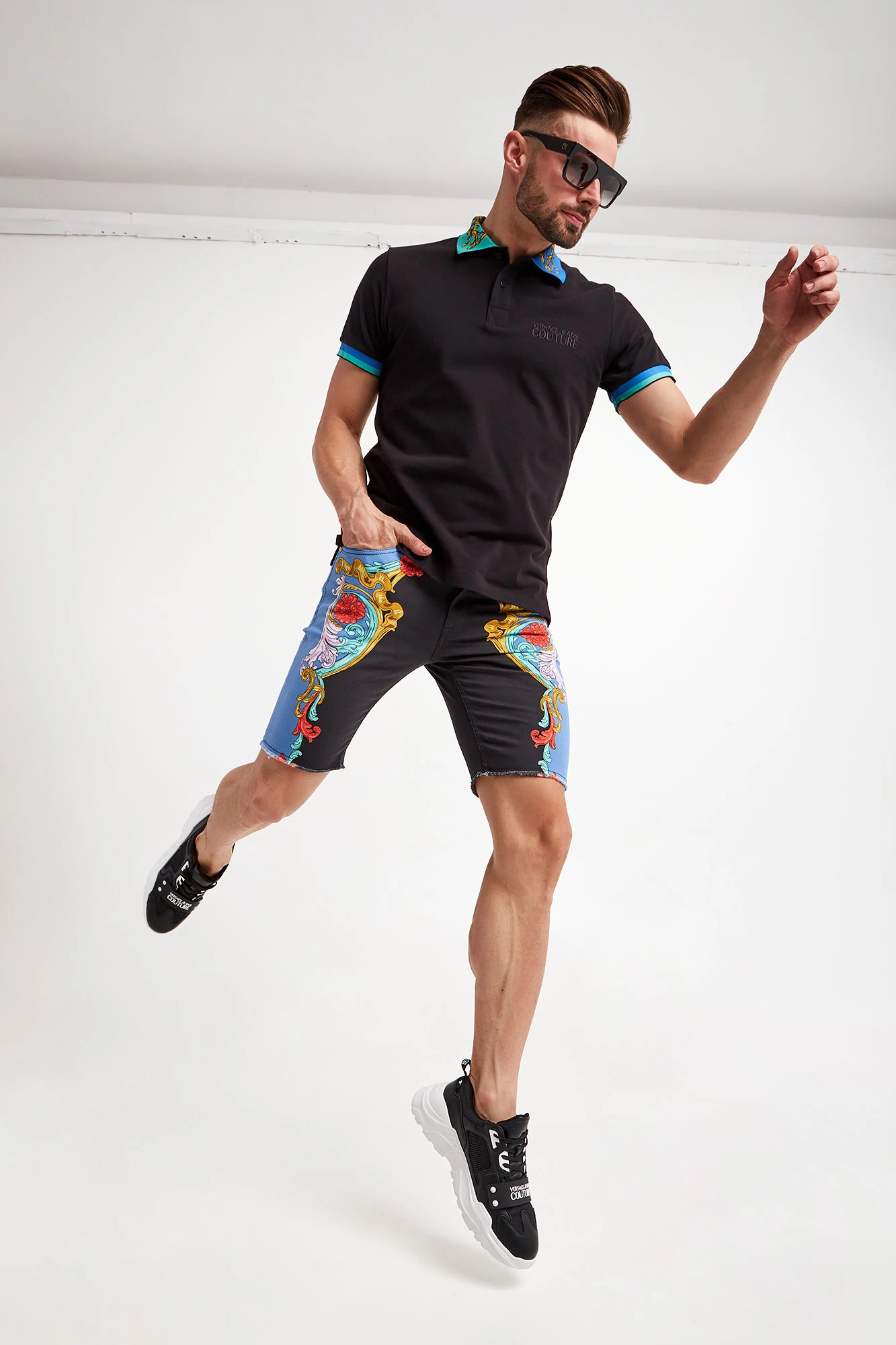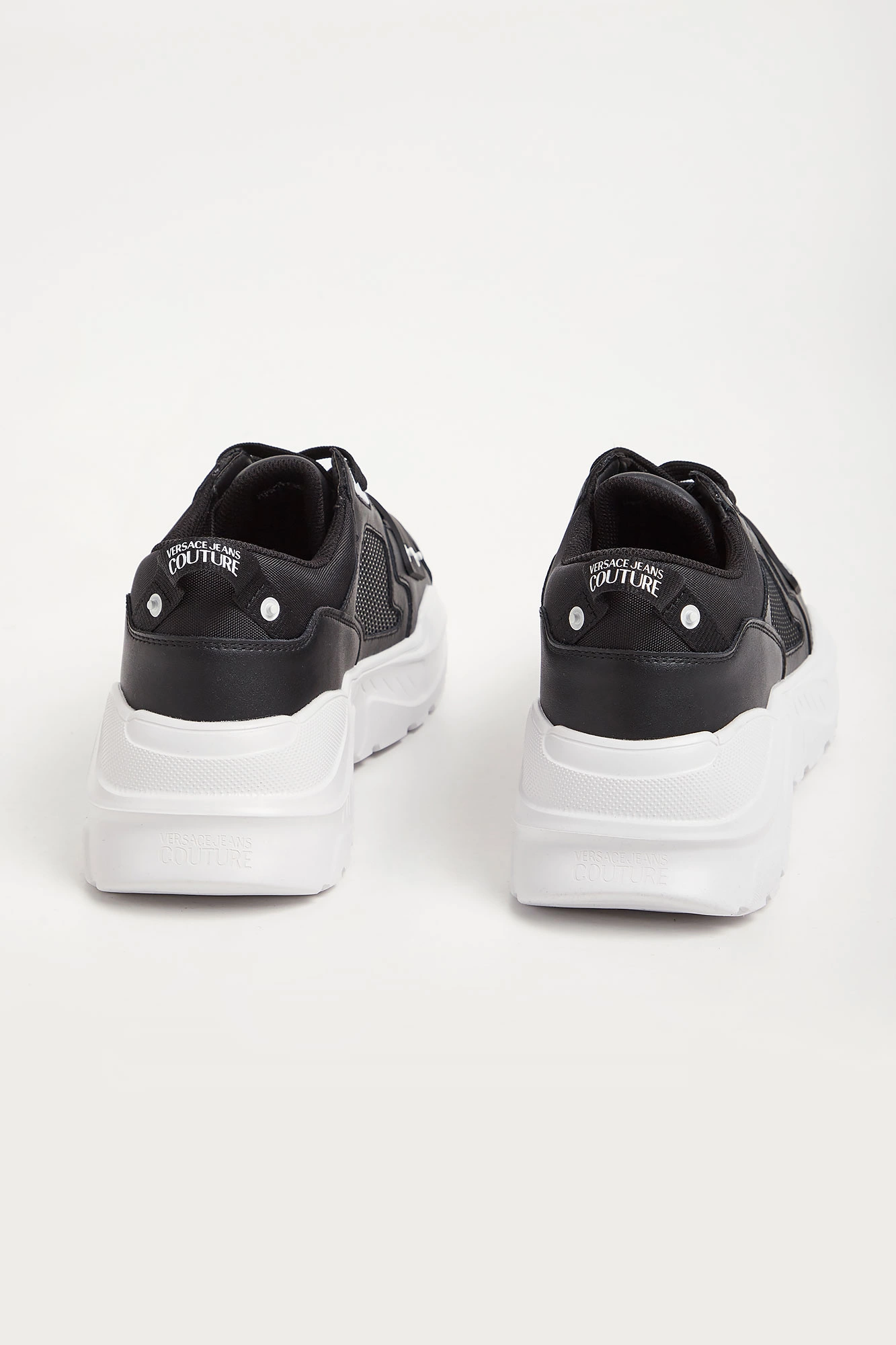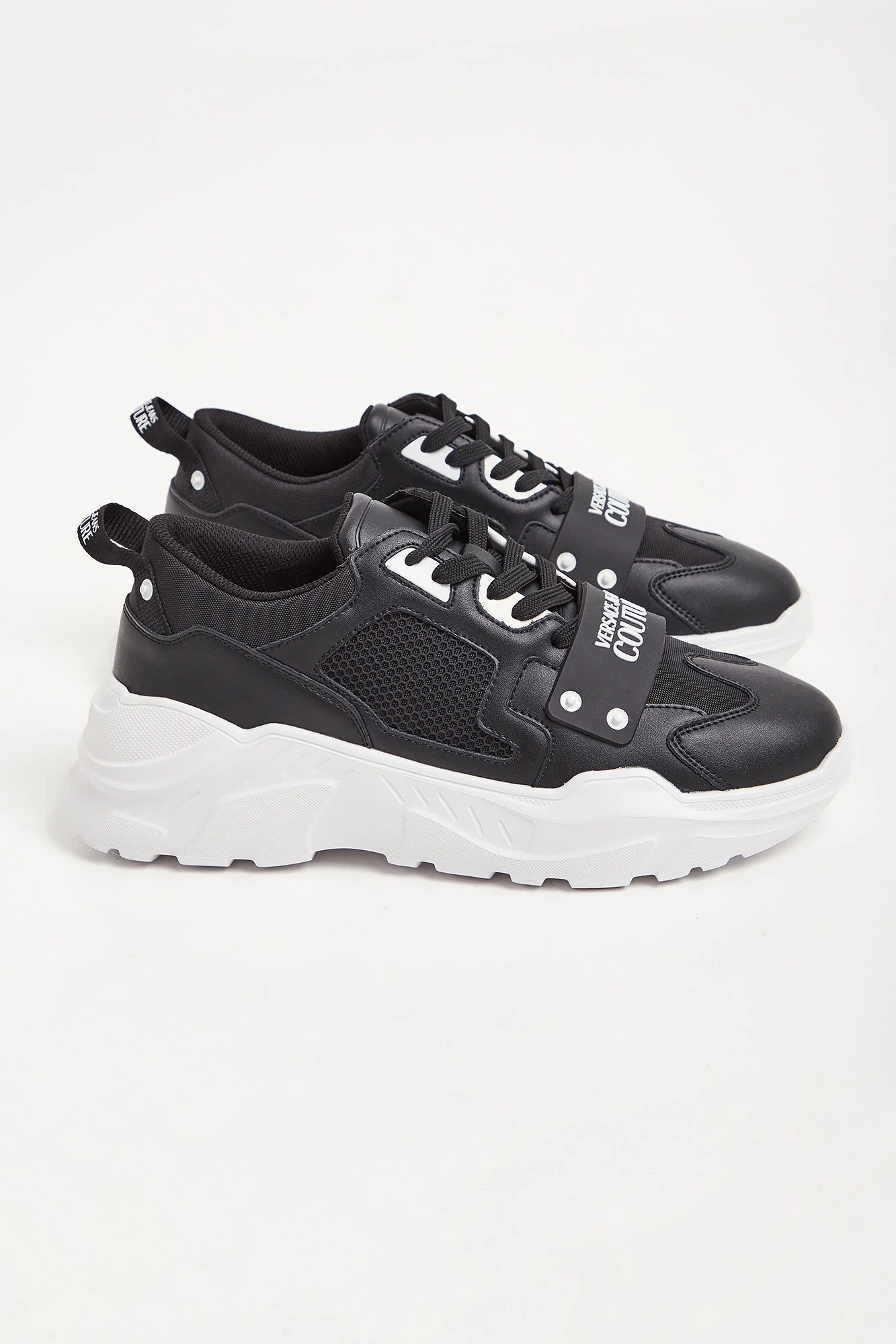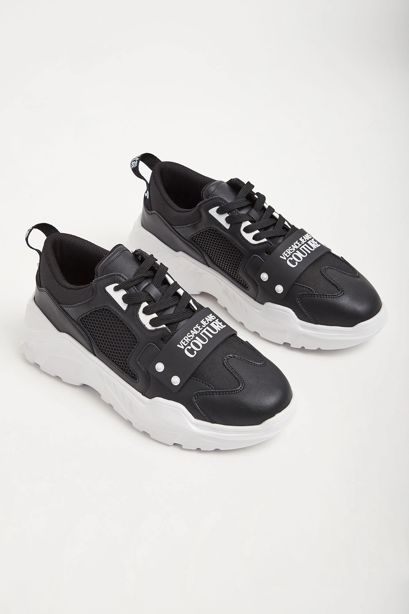 Sneakersy marki Versace Jeans Couture w czarnym kolorze. Z przodu gumowany pasek z tłoczoną nazwą marki. Na całości wstawki siatki. Wiązane za pomocą sznurówek. Z tyłu sygnowana tasiemka ułatwiająca zakładanie w czarnym kolorze. Wyściółka sygnowana. Wysoka, tłoczona podeszwa w białym kolorze.