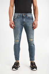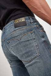Jeansy marki Versace Jeans Couture w niebieskim kolorze. Fason typu slim fit. Model z pięcioma kieszeniami. W talii szlufki. Na całości efekt sprania, przetarcia i ozdobne rozdarcia. Zapinane za pomocą zamka błyskawicznego i sygnowanego guzika w złotym kolorze. Z tyłu skórzana naszywka w czarnym kolorze ze złotym tłoczeniem nazwy marki. Wykonane z elastycznej bawełny.