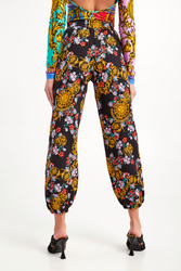 Spodnie dresowe marki Versace jeans Couture w czarnym kolorze. Na całości charakterystyczny dla marki wielokolorowy nadruk z motywem baroku. Fason typu jogger. Nogawki i talia wykończone elastycznym ściągaczem. Model z dwoma kieszeniami. Wykonane z czystej, mięsistej bawełny.