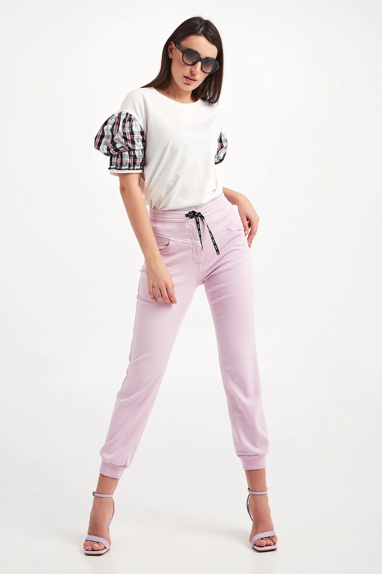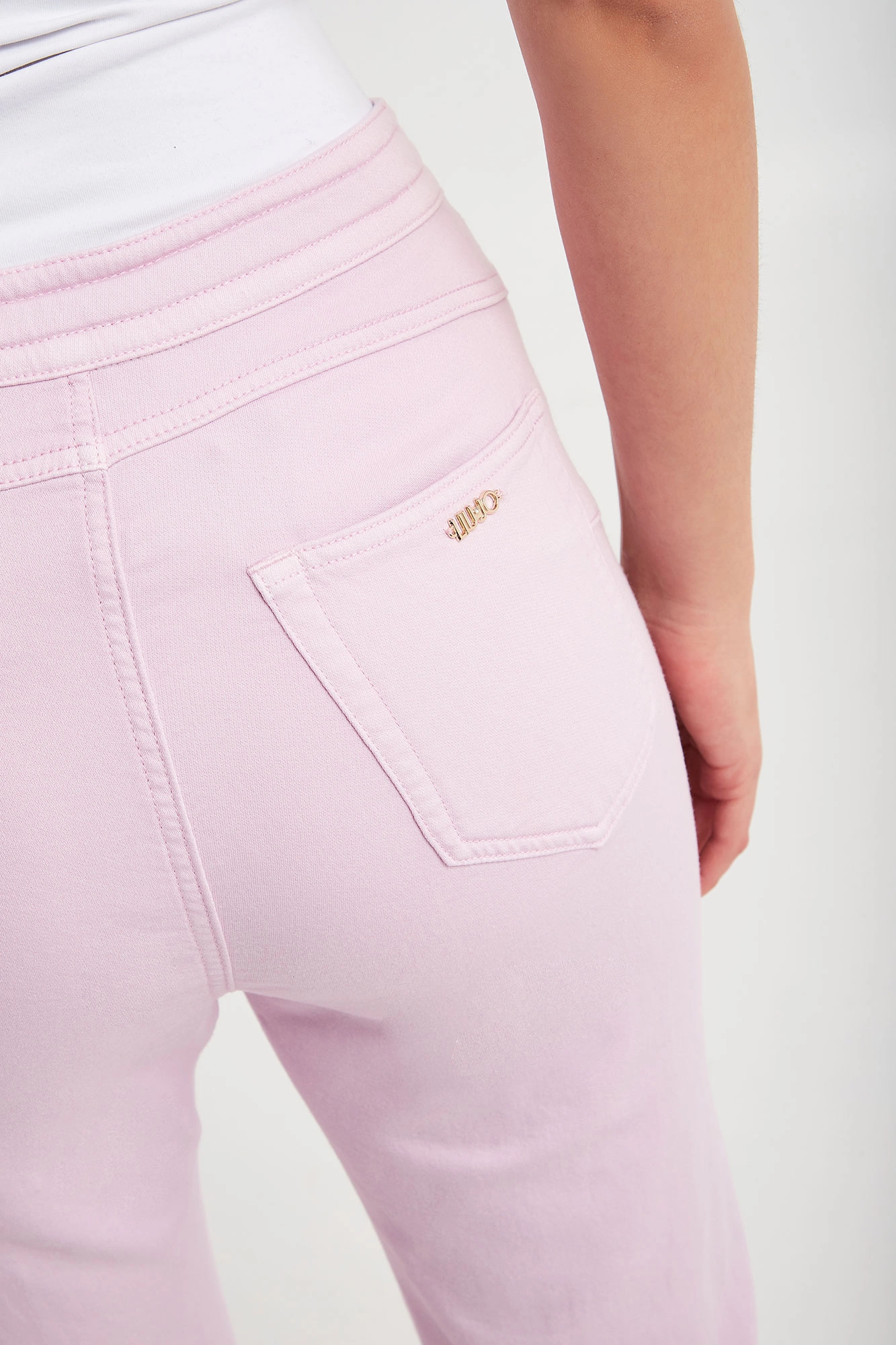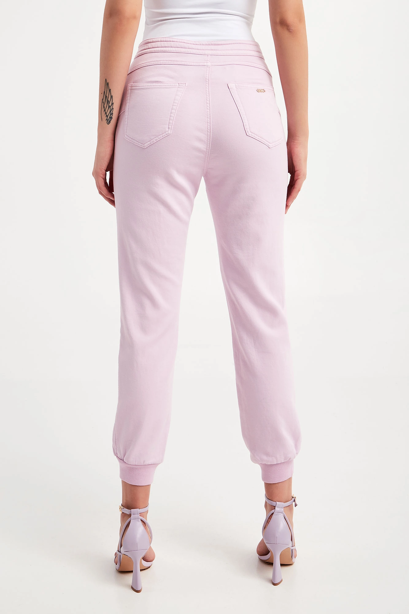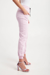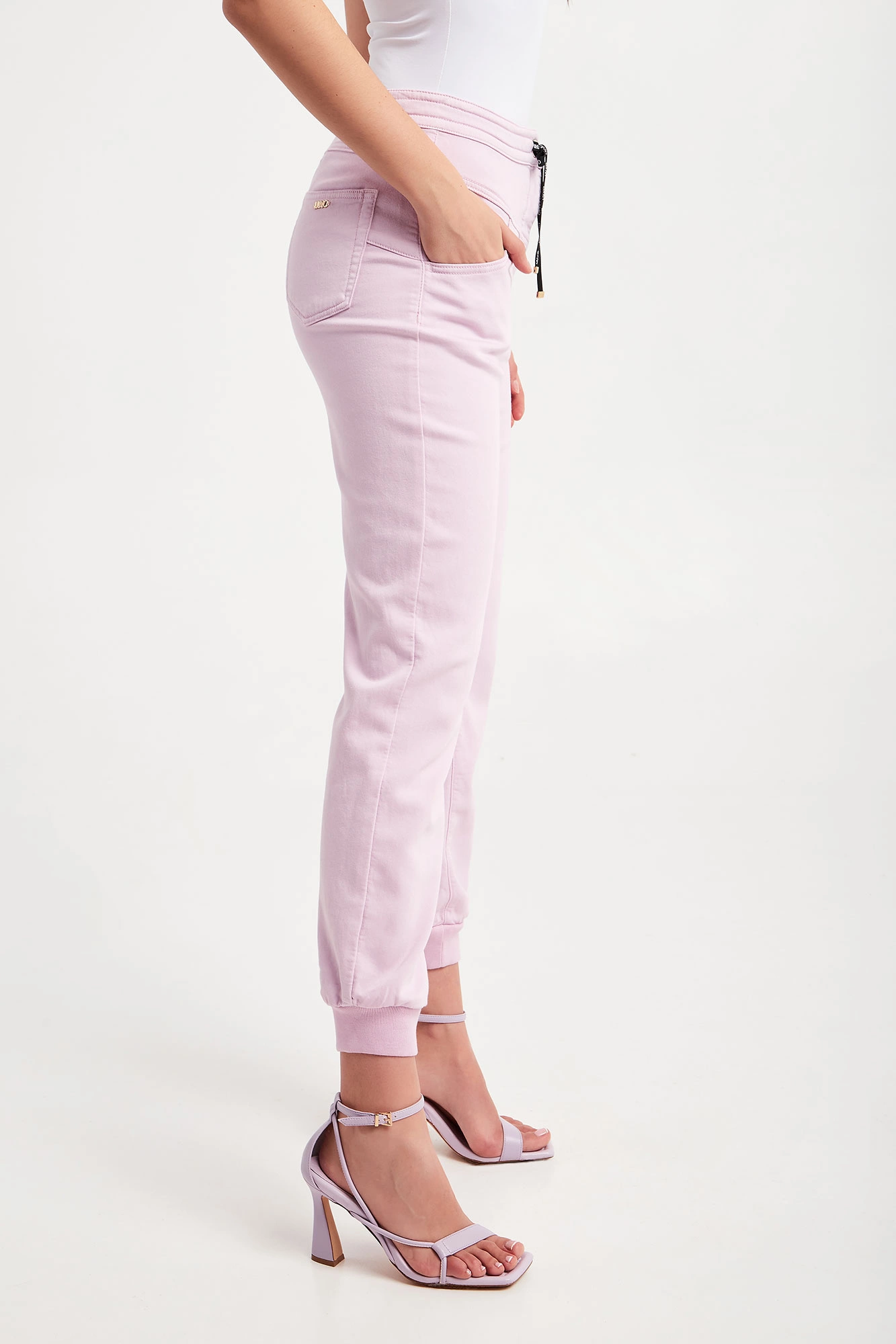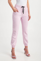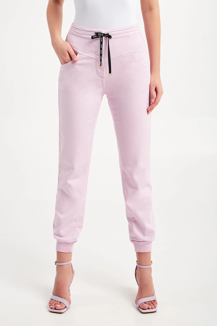 Spodnie dresowe Liu Jo Sport w liliowym kolorze. Model z dwoma kieszeniami. Fason typu jogger. Zapinane za pomocą zamka oraz sygnowanej, złotej napy oraz w talii regulowane za pomocą czarnych, sygnowanych troczków. Nogawki wykończone ściągaczem. Wysoki stan. Wykonane z elastycznej bawełny.
