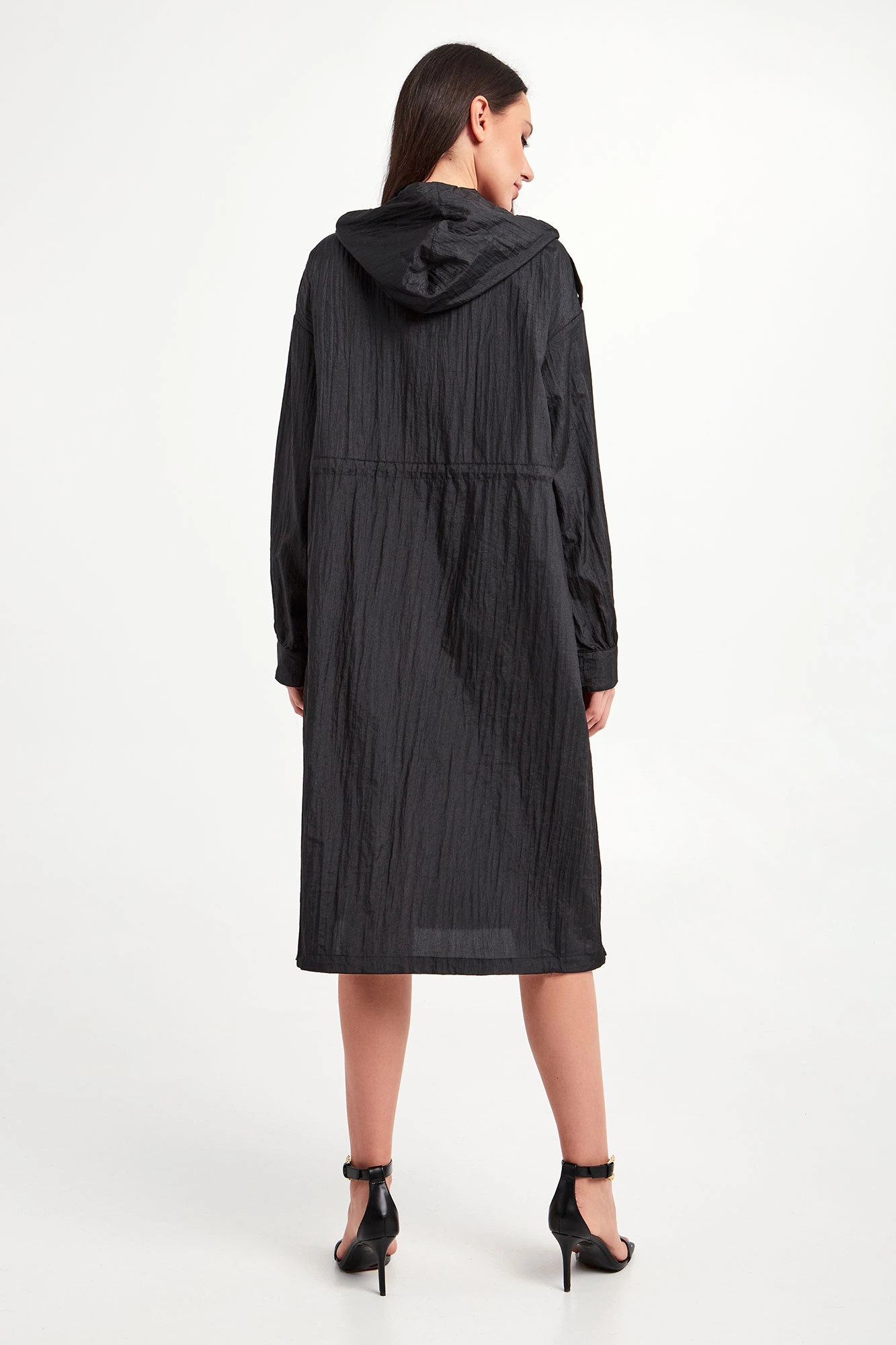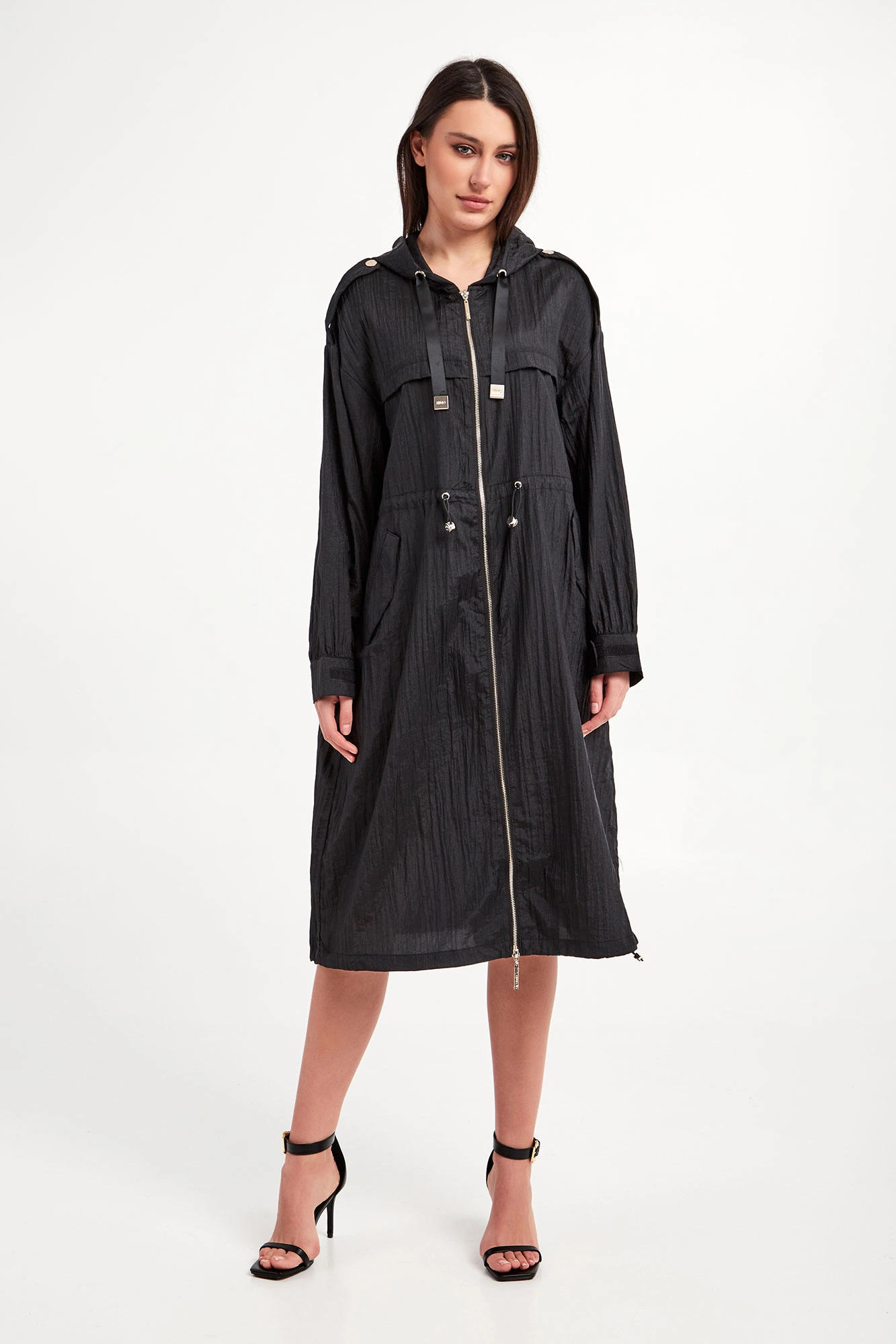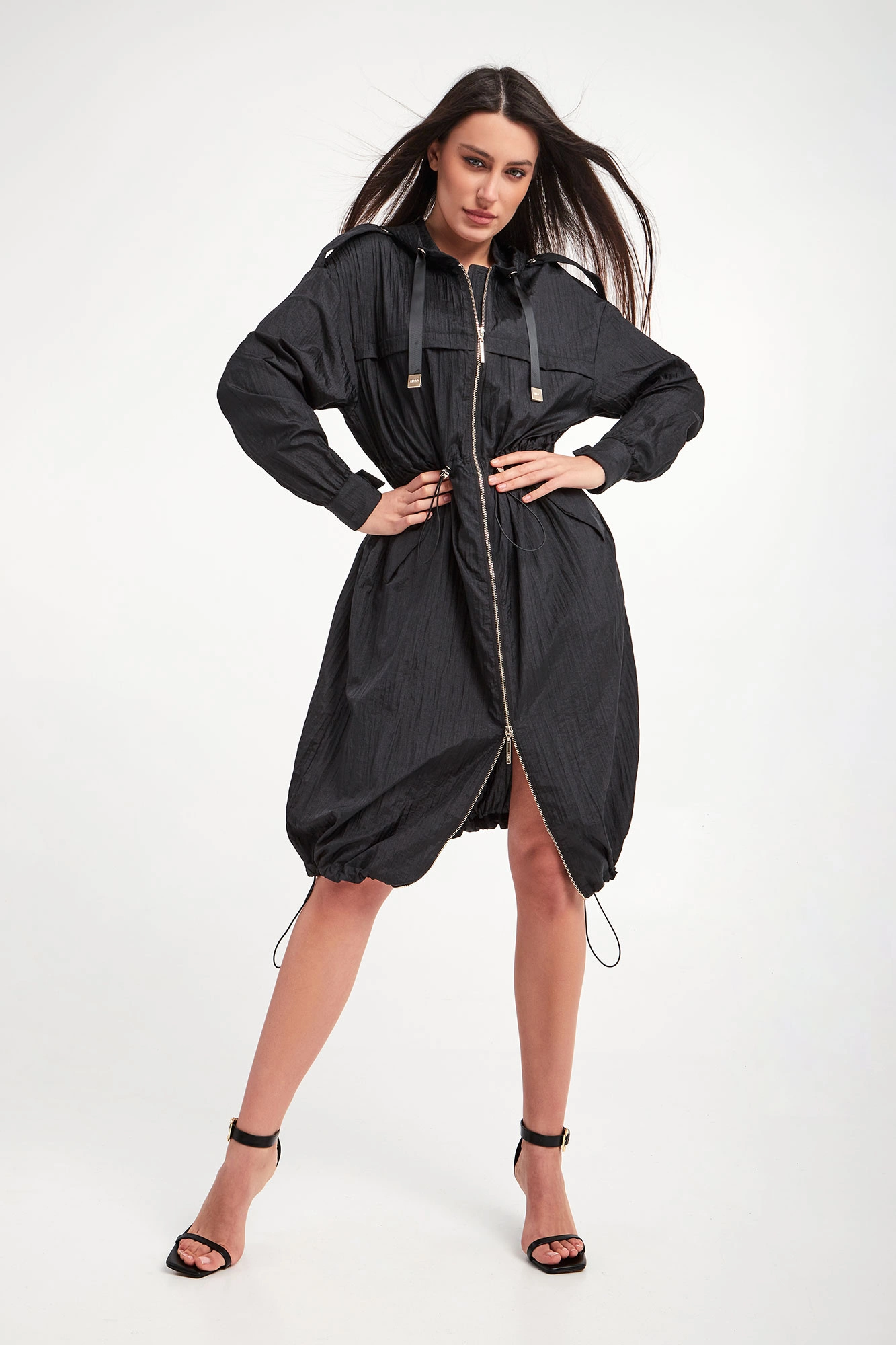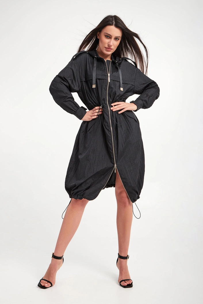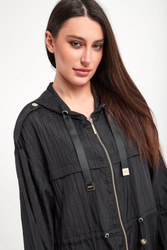 Kurtka z kapturem typu parka marki Liu Jo Sport w czarnym kolorze. Fason oversize. Kaptur regulowany za pomocą tasiemek zakończonych złotymi, sygnowanymi blaszkami. Zapinana za pomocą dwustronnego zamka z sygnowaną zawieszką. W talii oraz na dole regulowana za pomocą troczków ze stoperami w złotym kolorze. Po bokach dwie kieszenie z patkami zapinanymi na napy. Na ramionach pagony. Rękawy zakończone mankietami regulowanymi za pomocą rzepu.