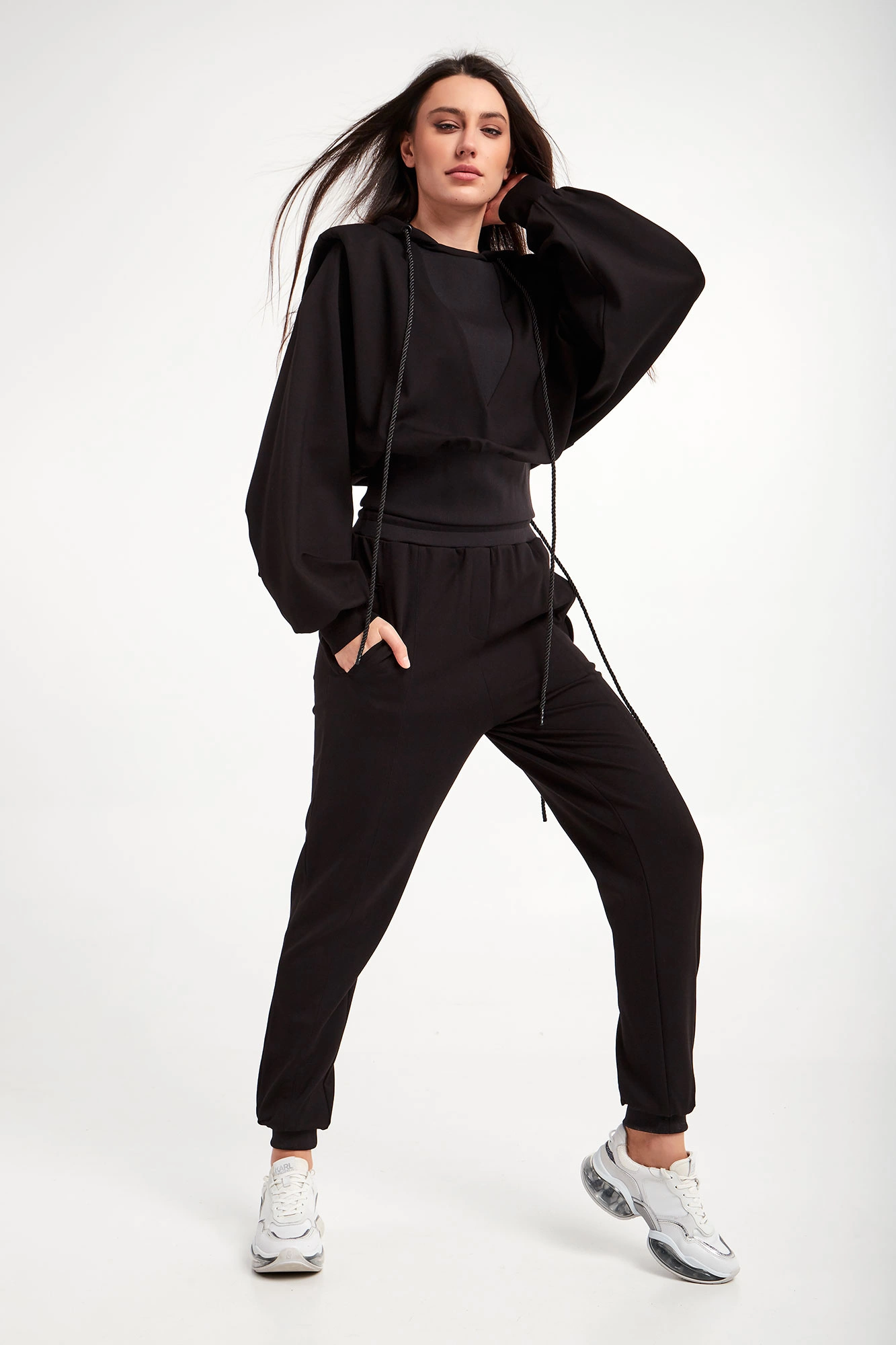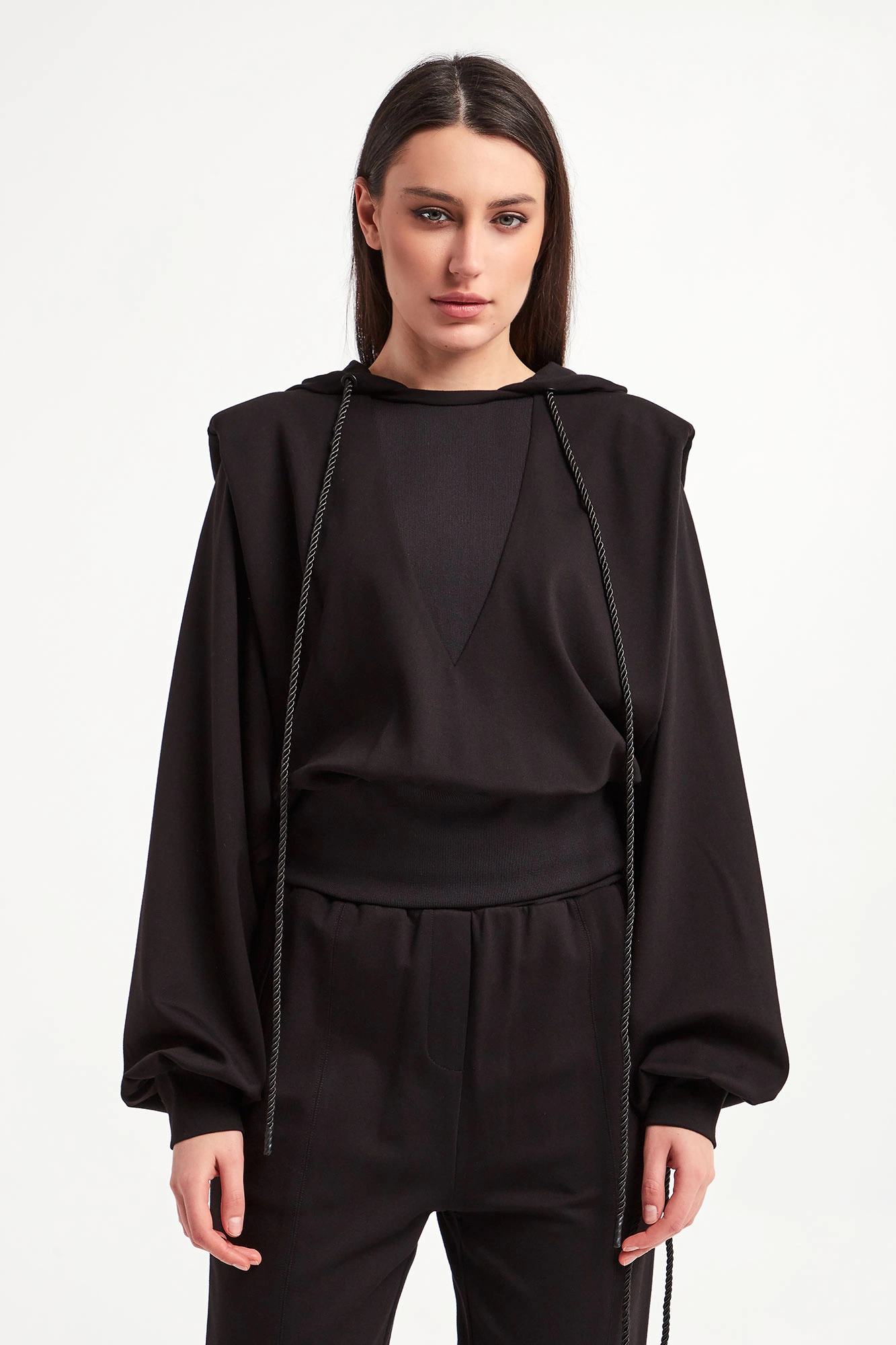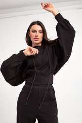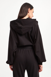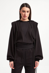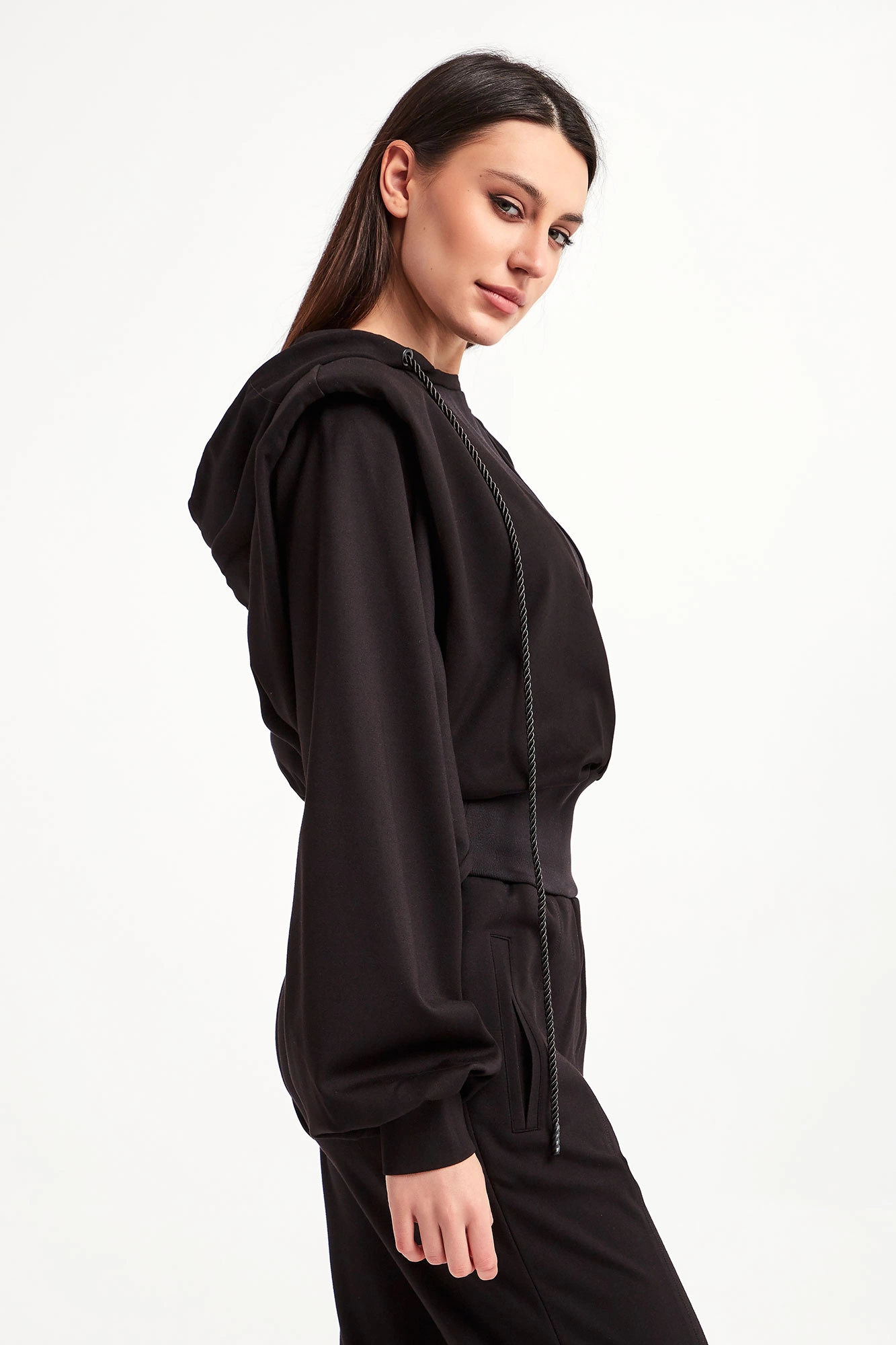 Bluza z kapturem marki Twinset w czarnym kolorze. Fason regular fit. Kaptur regulowany za pomocą grubych, długich troczków. Dół oraz szerokie rękawy wykończone ściągaczem. Na ramionach poduszki. Dekolt typu o-neck oraz bufiaste rękawy zakończone ściągaczami. Przy dekolcie wstawka ze ściągacza. Na boku gumowa wstawka w postaci nazwy marki w różowym kolorze. Wykonana ze stuprocentowej bawełny.