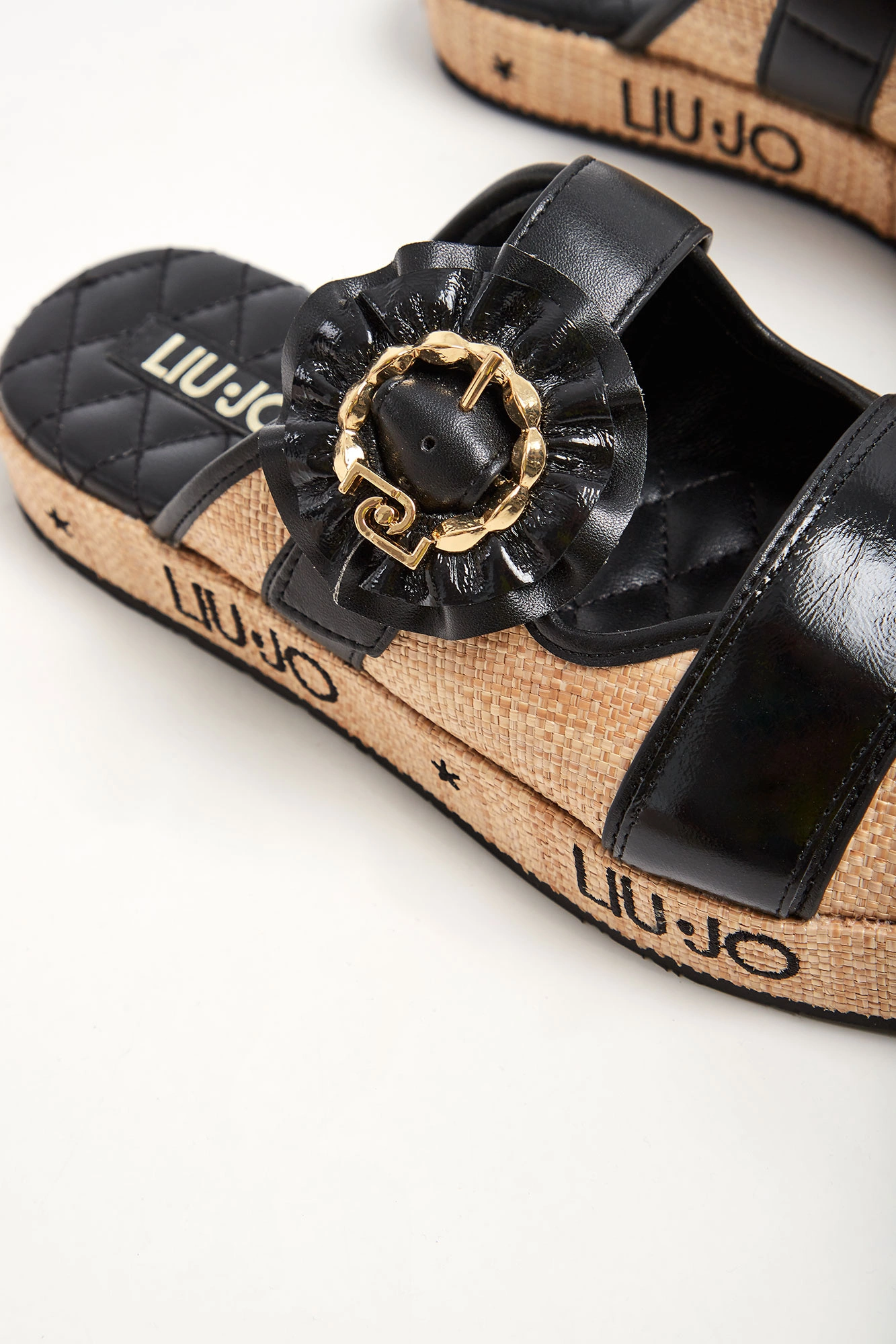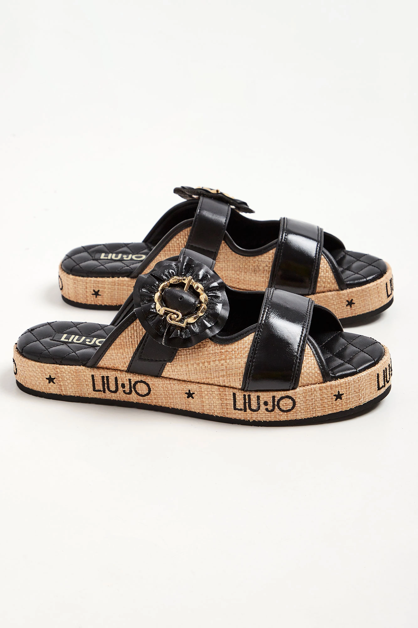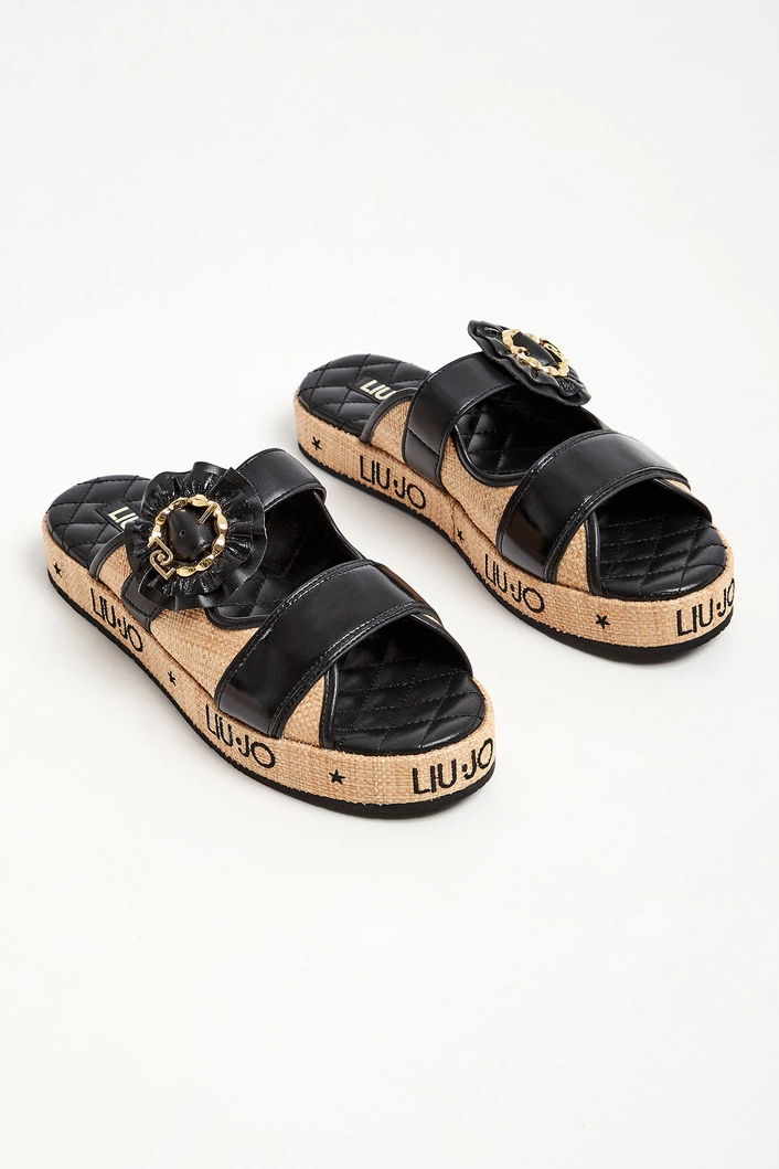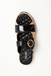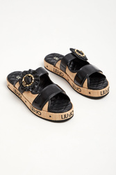 Klapki marki Liu Jo w czarnym kolorze. Z przodu dwa paski z czego jeden regulowany za pomocą ozdobnej klamry. Wygodna wyściełana, sygnowana i pikowana wkładka. Podeszwa w beżowym kolorze z haftowanym napisem w postaci nazwy marki w czarnym kolorze.