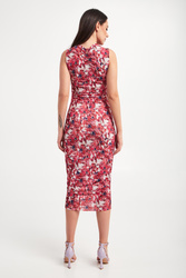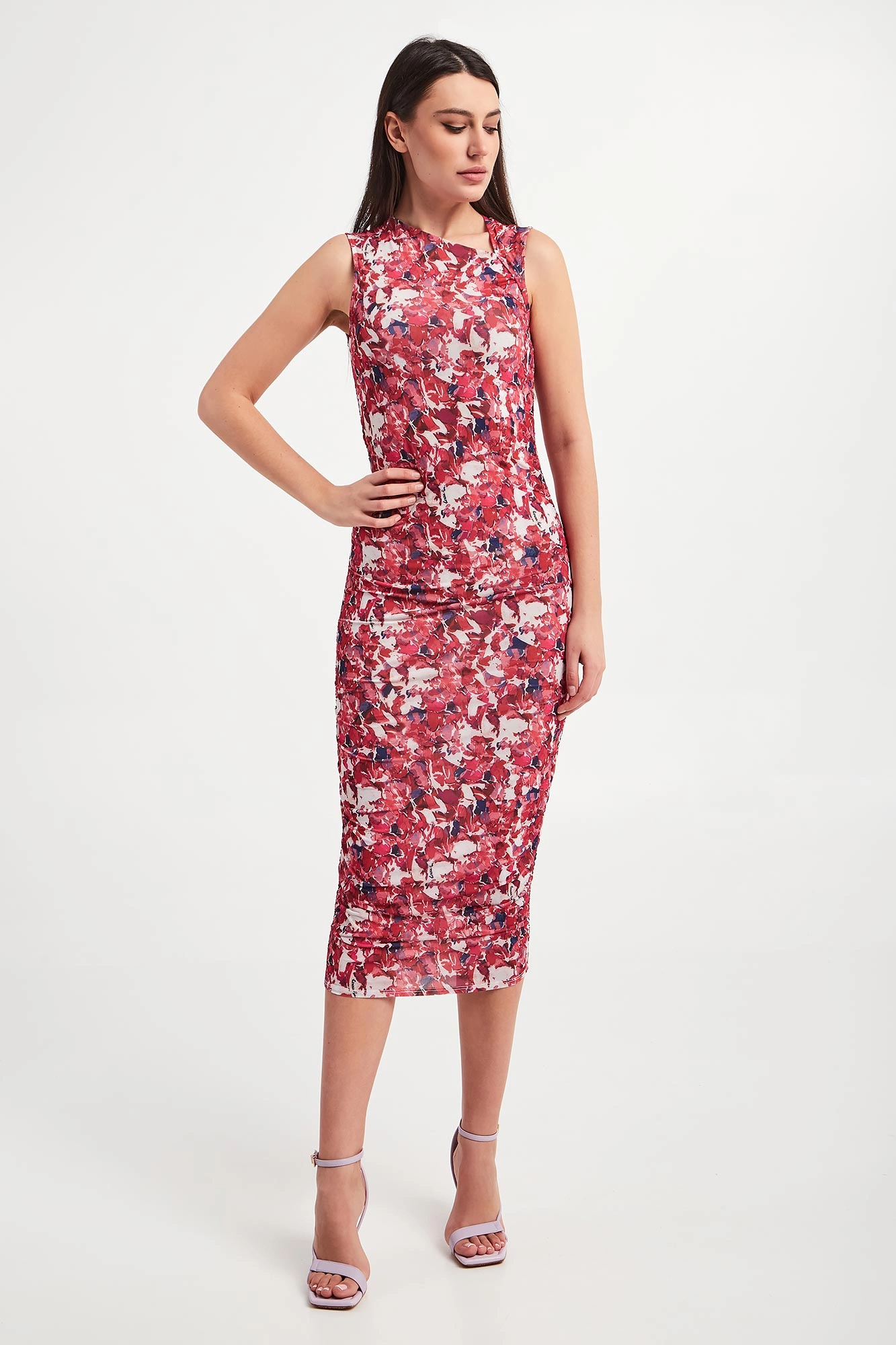 Sukienka marki Parizia Pepe w różowym kolorze. Fason typu slim fit. Asymetryczny dekolt. Po bokach drapowania. Bez rękawów. Wykonana z elastycznego i delikatnego materiału. Posiada halkę wykonaną z siateczki w białym kolorze. Z tyłu na linii karku złota zawieszka w postaci logo marki.