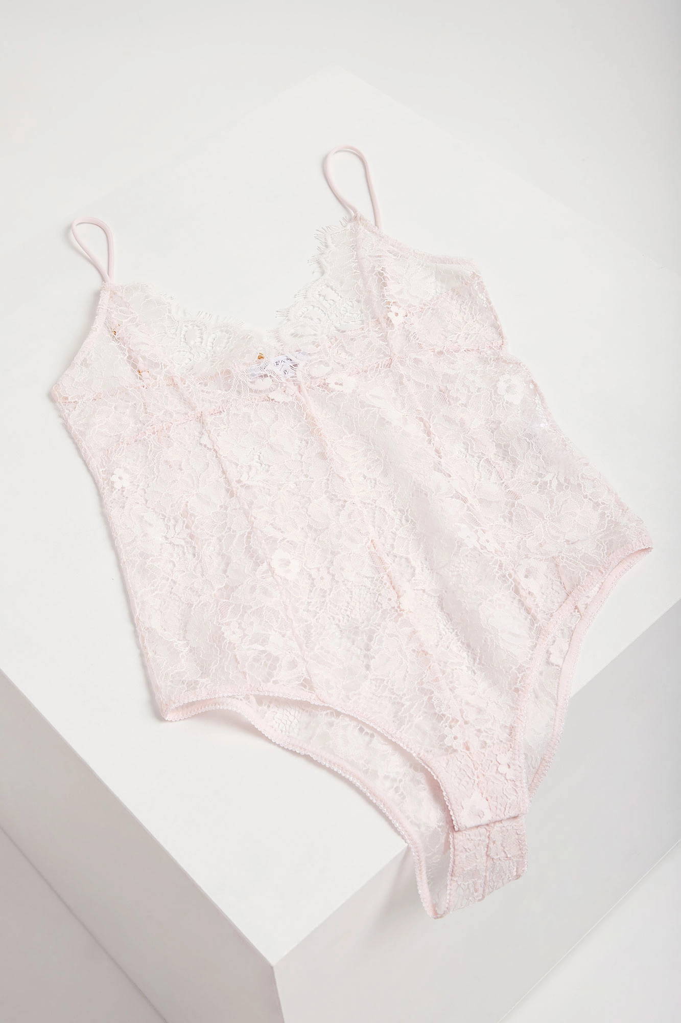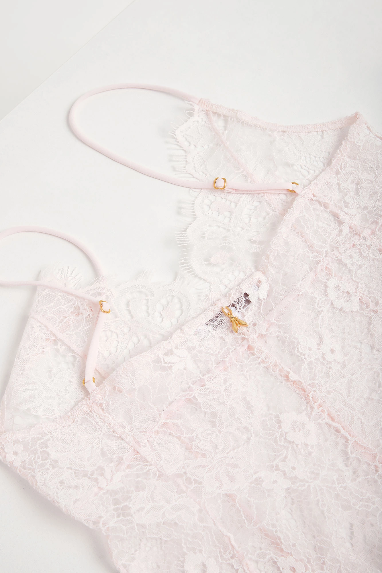 Body marki Patrizia Pepe w różowym kolorze. Dopasowany fason slim fit. Na całości ażurowe wzory z kwiatowym motywem. Dekolt typu v-neck zakończony ściągaczem. Ramiączka regulowane.