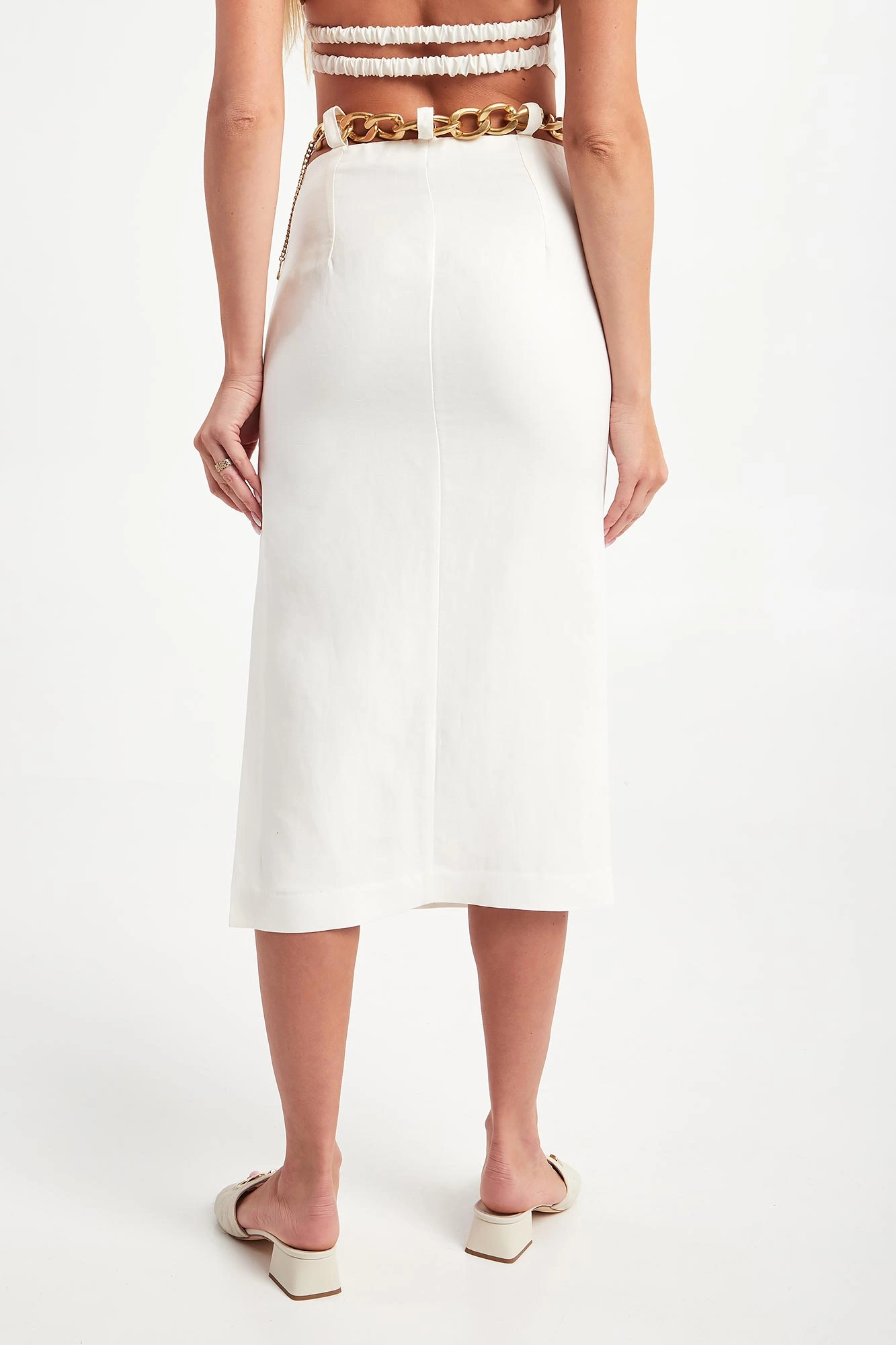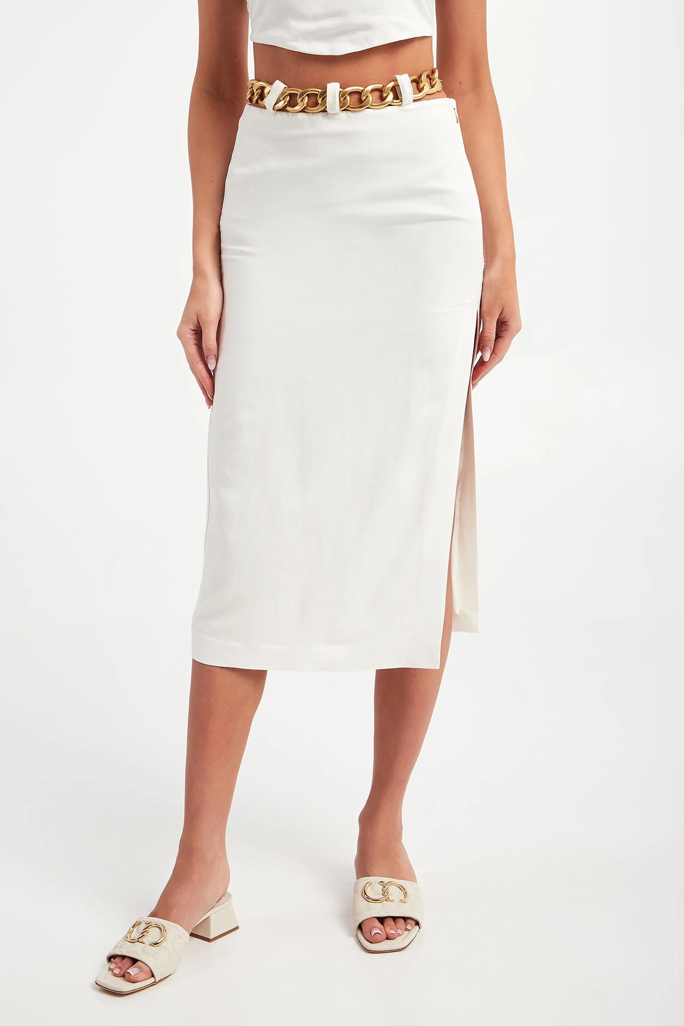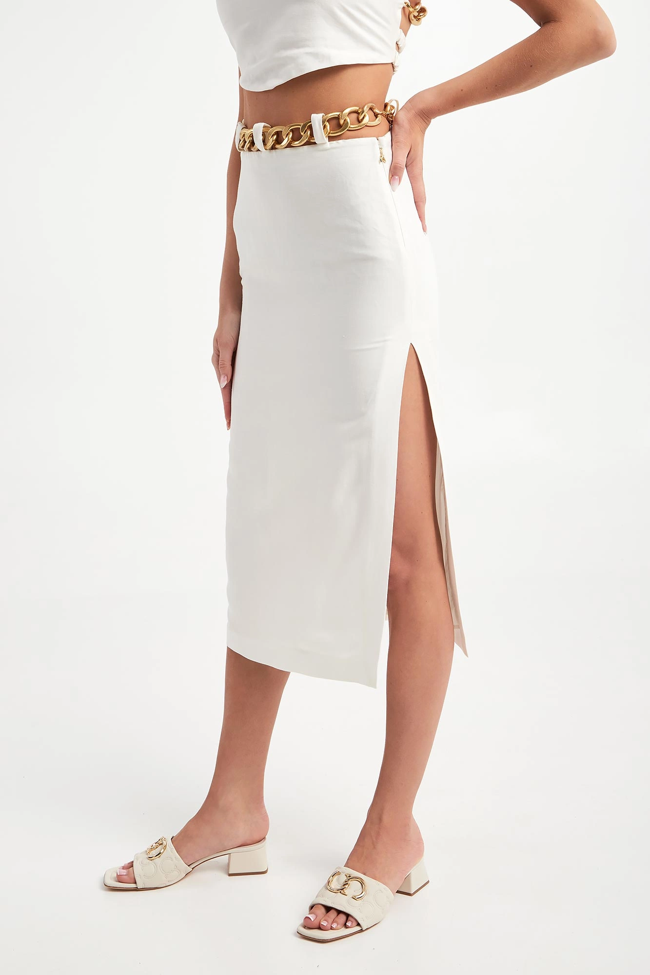 Spódnica marki Patrizia Pepe w białym kolorze. Fason typu slim fit o długości midi. W talii szlufki. W zestawie gruby pasek w formie złotego łańcucha. Z boku zapinana na kryty zamek z metalową zawieszką w postaci logo marki oraz rozcięcie. Wykonana z materiału z mieszanki lnu z wiskozą.