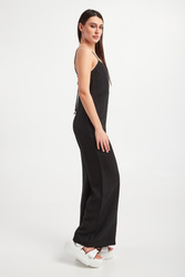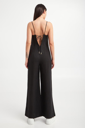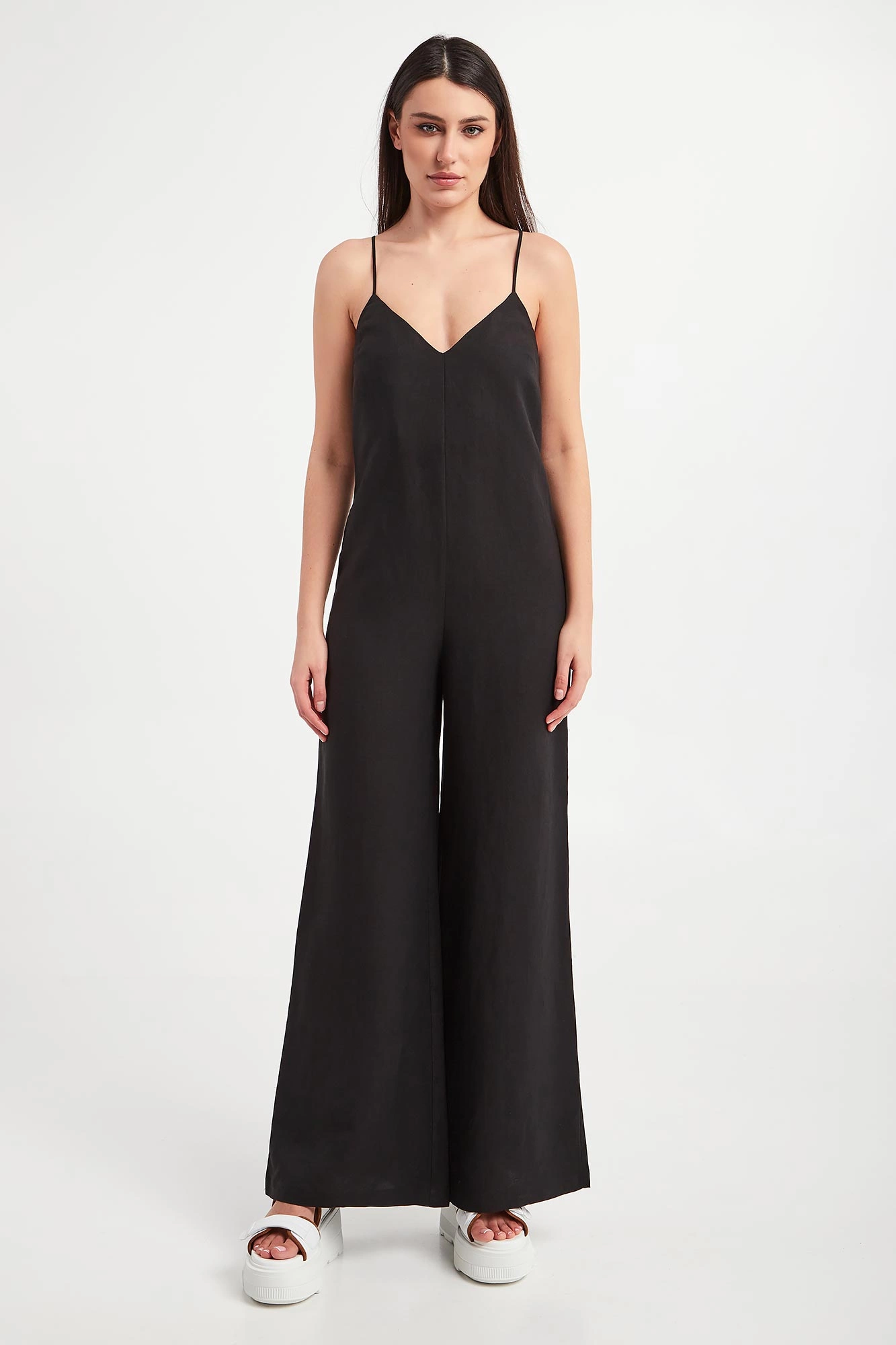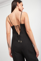 Lniany kombinezon marki Patrizia Pepe w czarnym kolorze. Fason regular. Z tyłu wiązany za pomocą troczków zakończonych metalowym, złotym logo marki. Rozszerzane nogawki typu palazzo. Dekolt typu v-neck. Wykonany z mieszanki lnu z wiskozą. Idealny zarówno do letnich jak i eleganckich stylizacji.