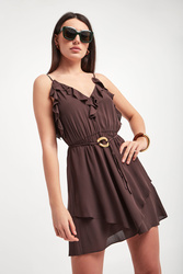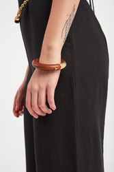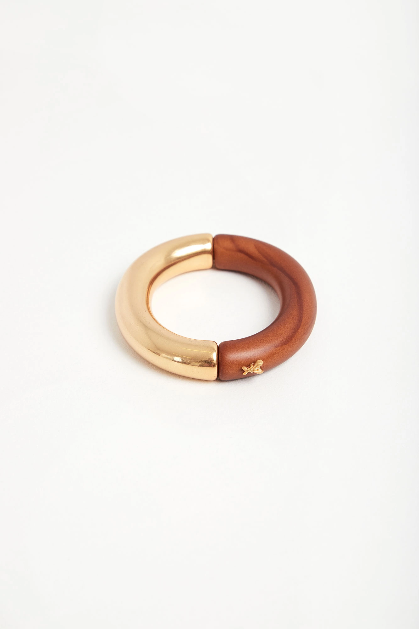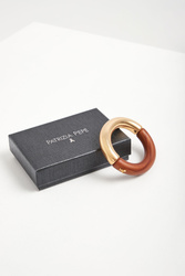 Bransoletka marki Patrizia Pepe w złoto-brązowym kolorze. Połowa metalowa, połowa drewniana. Przy magnetycznym zapięciu złota zawieszka w kształcie charakterystycznego, owadziego logo. Utrzymana w estetce plemiennej oraz egzotycznej.