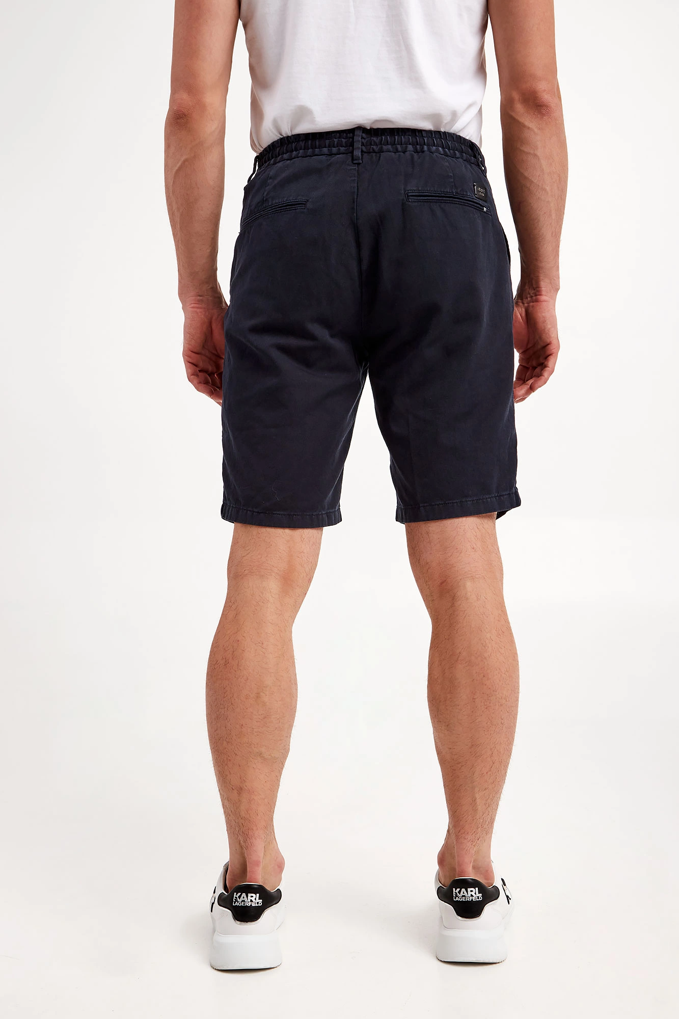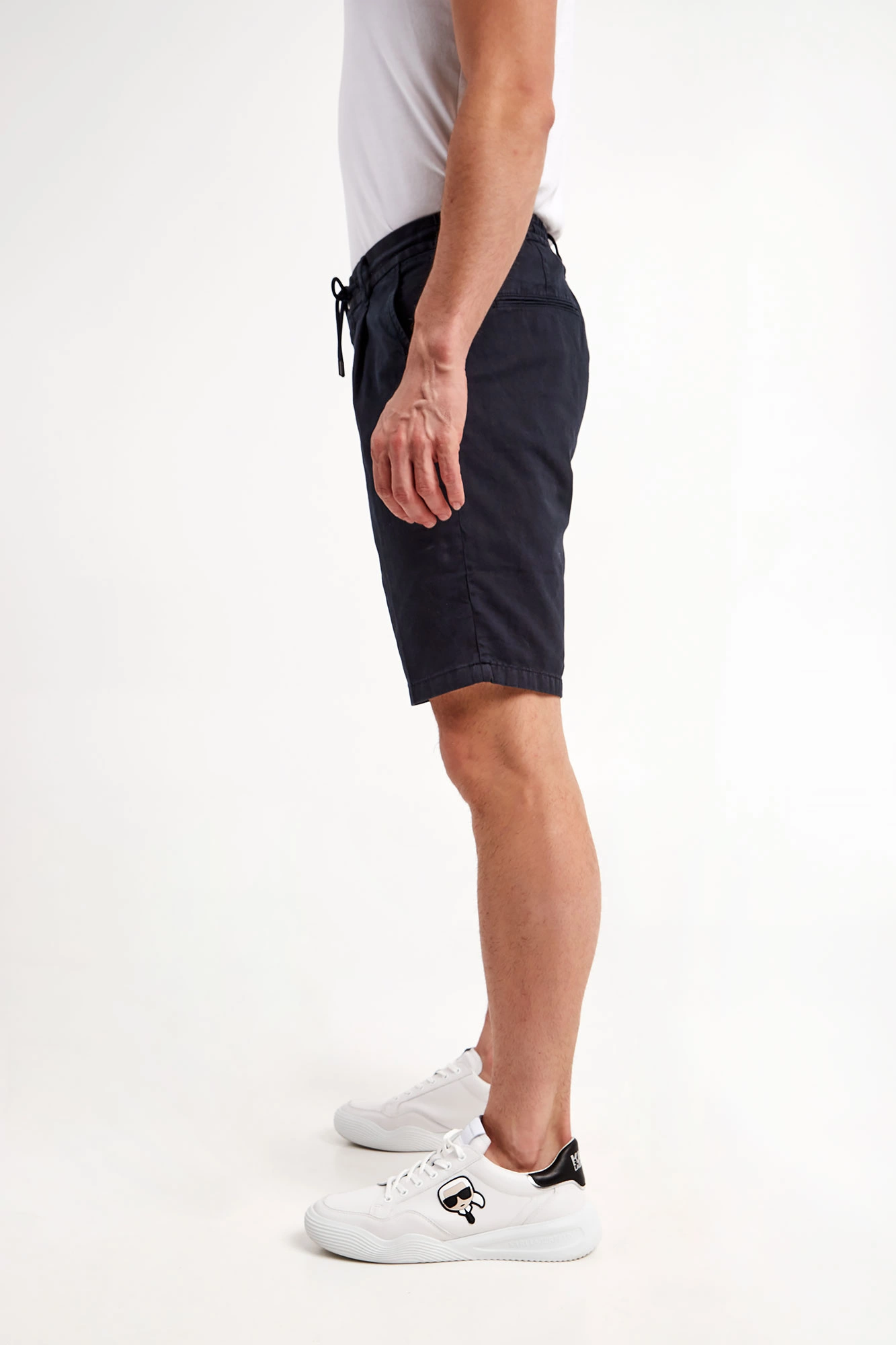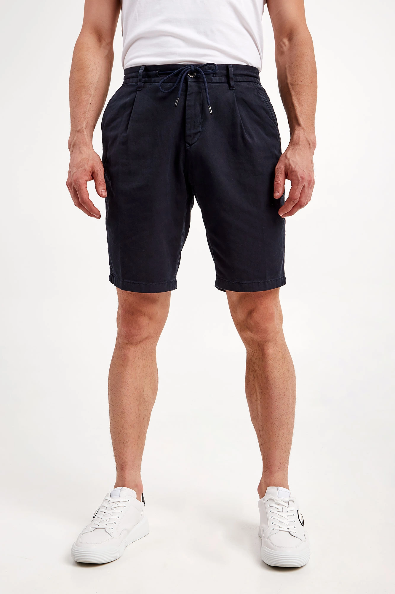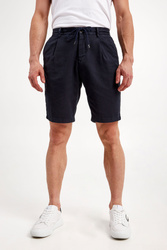 Bermudy marki Joop! Jeans w granatowym kolorze. Fason regular fit. Zapinane za pomocą zamka i sygnowanego guzika. W pasie szlufki oraz granatowe troczki z logowanymi stoperami. Model z dwiema kieszeniami. Z tyłu patki imitujące kieszenie. Nogawki zakończone lamówką. Wykonane z mieszkanki lnu oraz bawełny, z dodatkiem elastanu.