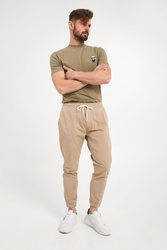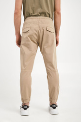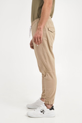 Spodnie marki Ice Play w beżowym kolorze. Fason jogger. Pas elastyczny, regulowany za pomocą sygnowanych troczków. Z przodu dwie niezapinane kieszenie. Lewa z białym nadrukiem logo marki. Z tyłu dwie kieszenie z patką. Nogawki wykończone elastycznym ściągaczem. Spodnie wykonane z bawełny z dodatkiem elastanu. Spodnie typu jogger w stylu streetwear.