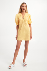 Sukienka marki Patrizia Pepe w żółtym kolorze. Wykonana z popelinowej, bawełnianej tkaniny. Fason slim. Dekolt typu V-neck wiązany za pomocą troczków zakończonych metalowym, złotym logo marki. Bufiaste rękawki wykończone lamówką. Z boku kryty zamek.