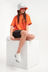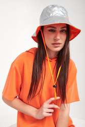 Dwustronny kapelusz typu bucket hat marki Armani Exchange. Jedna strona połyskująca w srebrnym kolorze. Z przodu pomarańczowy, neonowy nadruk z nazwą marki. Druga strona matowa, w pomarańczowym kolorze. W zestawie odpinany, regulowany za pomocą stopera troczek.
