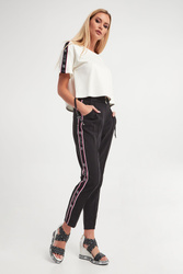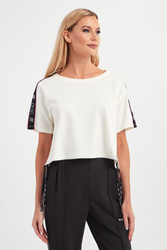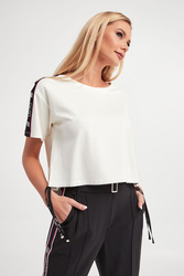 Bluzka marki Liu Jo Sport w kolorze złamanej bieli. Fason typu cropped. Krótkie rękawy wykończone lampasem z połyskującymi cyrkoniami w srebrnym kolorze. Dół wykończony ściągaczem regulowanym i wiązanym za pomocą sygnowanych troczków. Na dole ozdobne rozcięcia. Dekolt typu o-neck wykończony ściągaczem. Wykonana z elastycznej wiskozy.