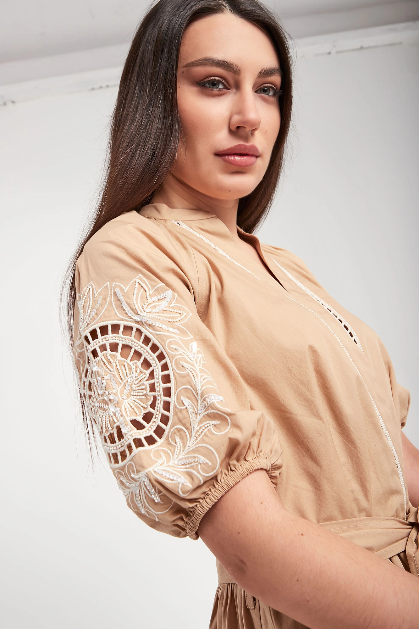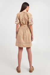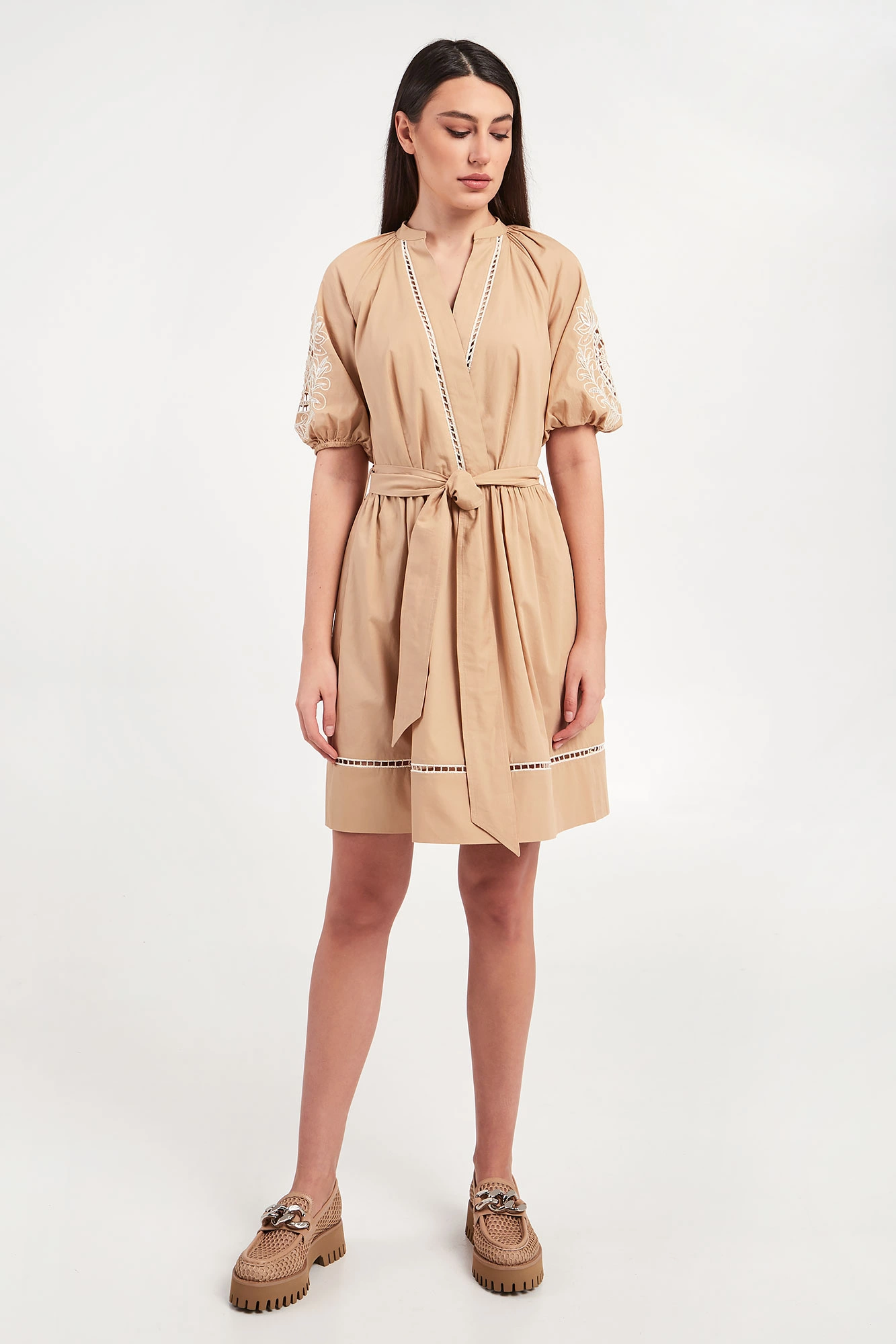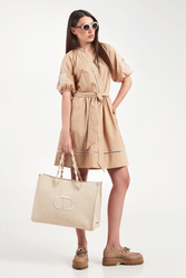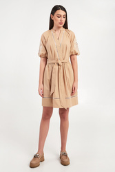 Sukienka marki Twinset w beżowym kolorze. Fason typu slim o długości mini. Dekolt typu v-neck wykończony stójką i lamówką. W talii odcięcie i marszczenie. Dekolt, dół i krótkie rękawy wykończone koronką i ozdobnymi perełkami. Na linii karku metalowa aplikacja w kształcie logo marki w złotym kolorze. W talii szlufki i materiałowy pasek. Wykonana z bawełnianej popeliny.