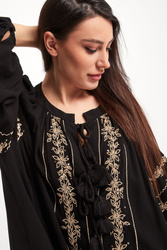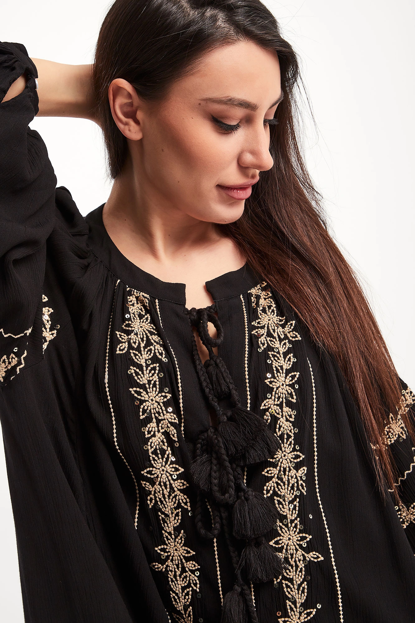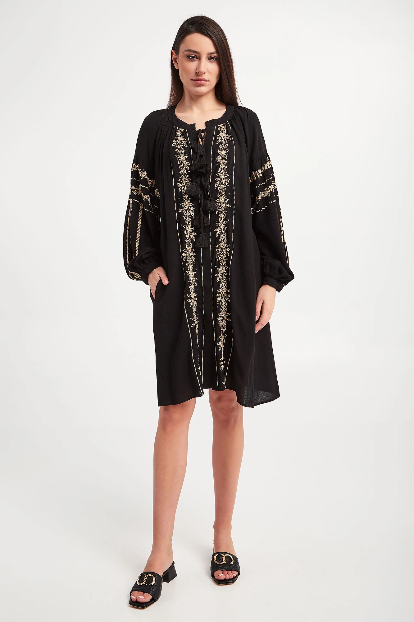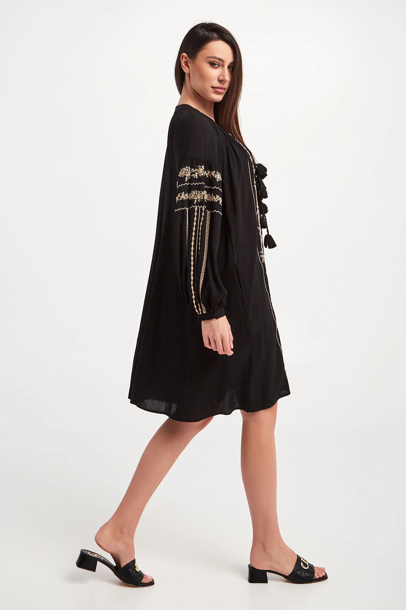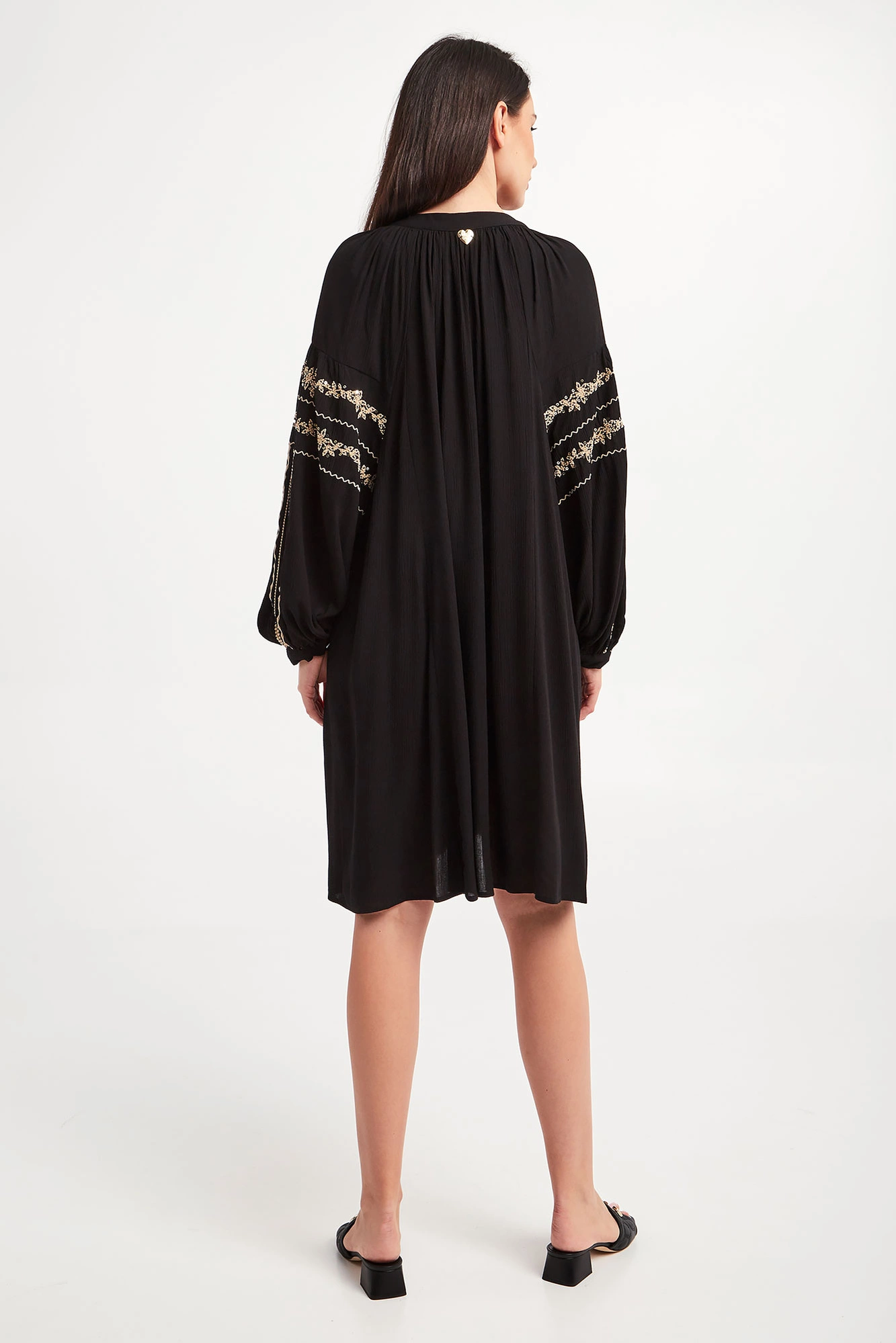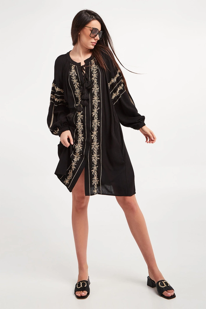 Sukienka marki Twinset U&B w czarnym kolorze. Fason relaxed fit, długość mini. Na całości beżowy, haftowany wzór z roślinnym motywem oraz złote, połyskujące cekiny. Zapinana za pomocą krytych nap. Dekolt typu v-neck wiązany za pomocą białych troczków. Długie, delikatnie bufiaste rękawy zakończone zapinanymi mankietami. Na linii karku sygnowana zawieszka. Wykonana z czystej wiskozy.
