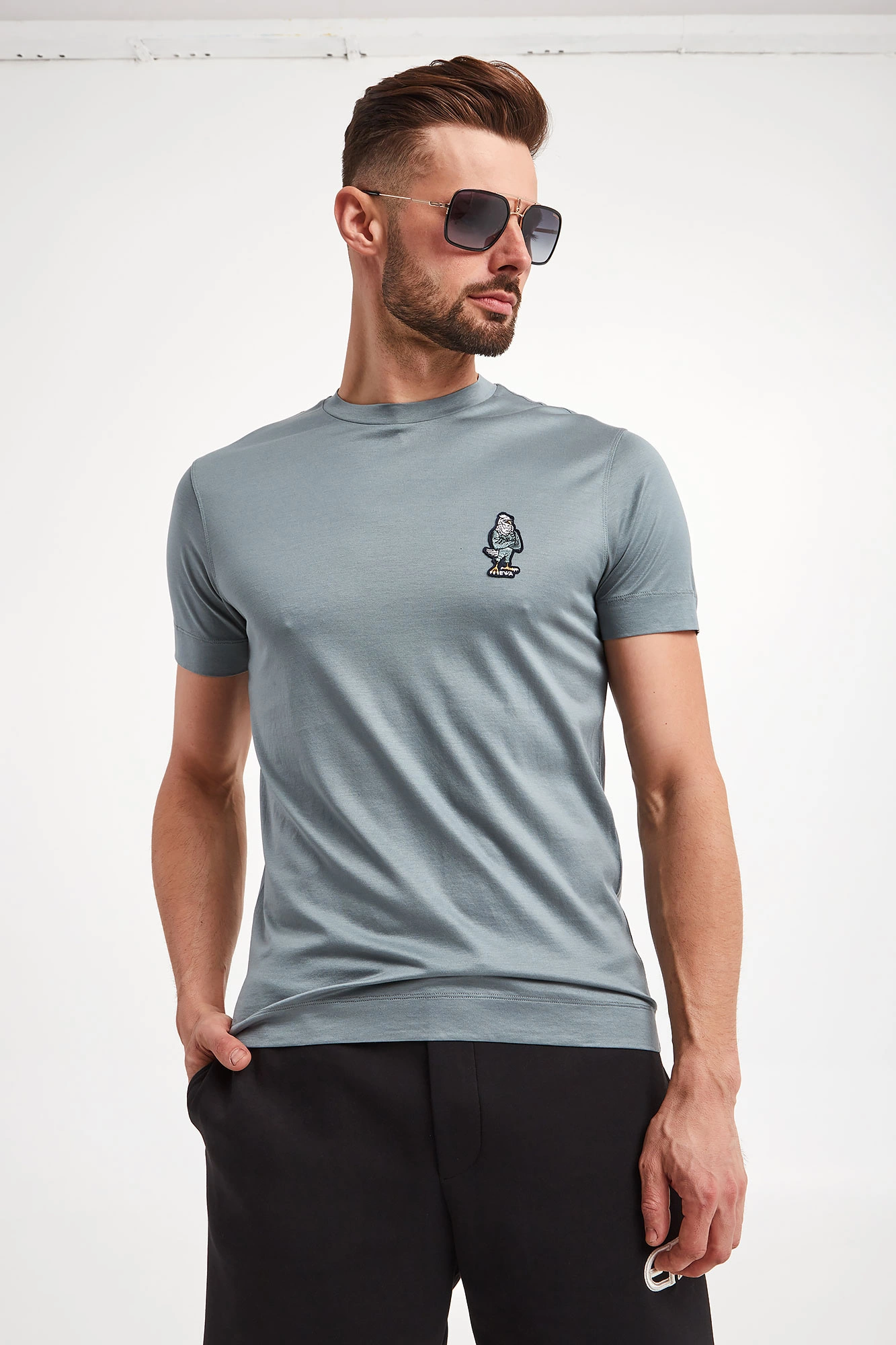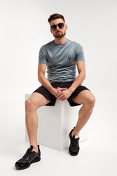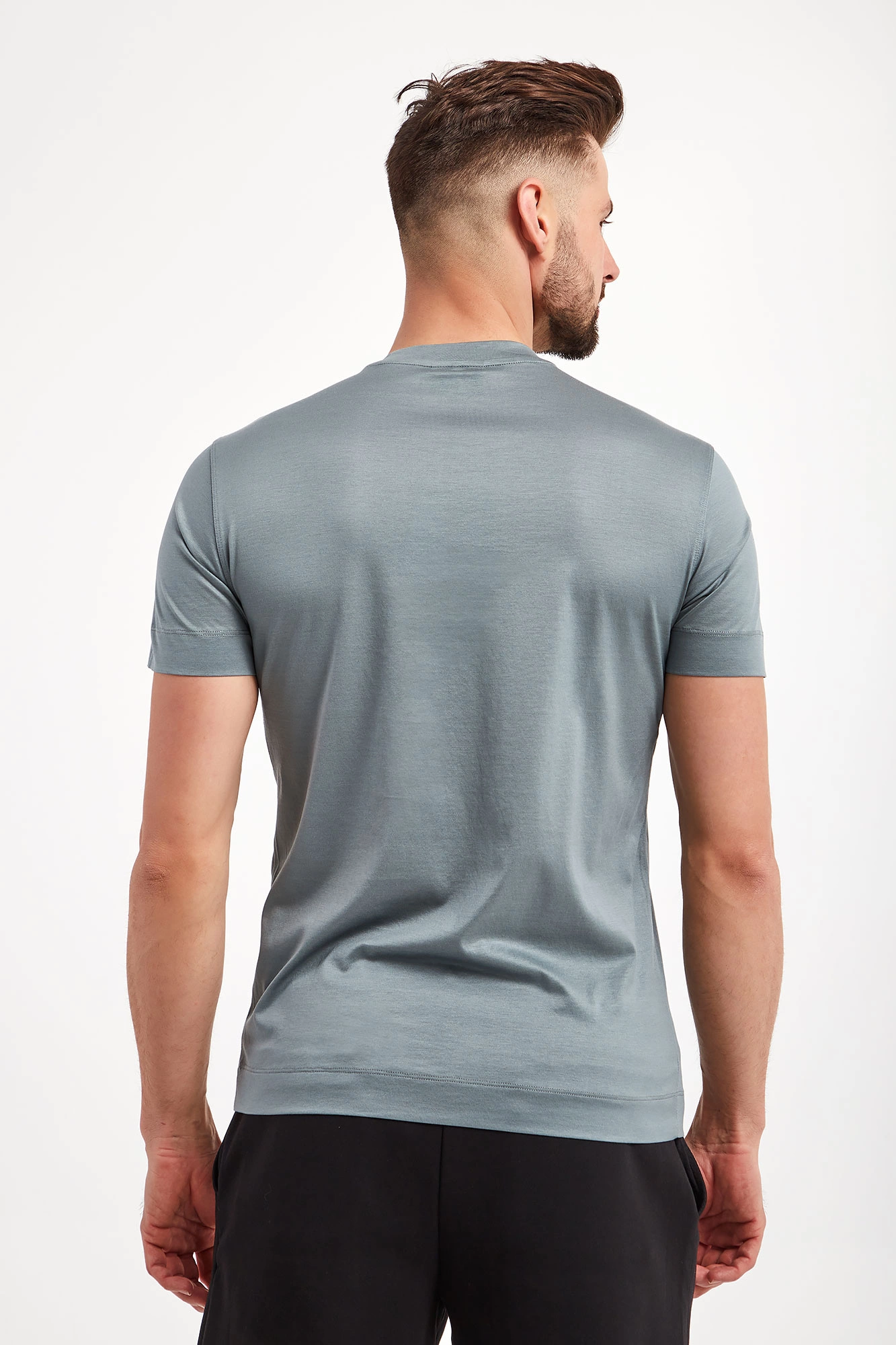 T-shirt marki Emporio Armani w ciemnoseledynowym kolorze. Fason typu regular fit. Dekolt typu o-neck wykończony lamówką. Z przodu naszywka z motywem orła i logo marki. Krótkie rękawy i dół wykończone lamówką. Wykonany z mieszanki lyocellu i bawełny.