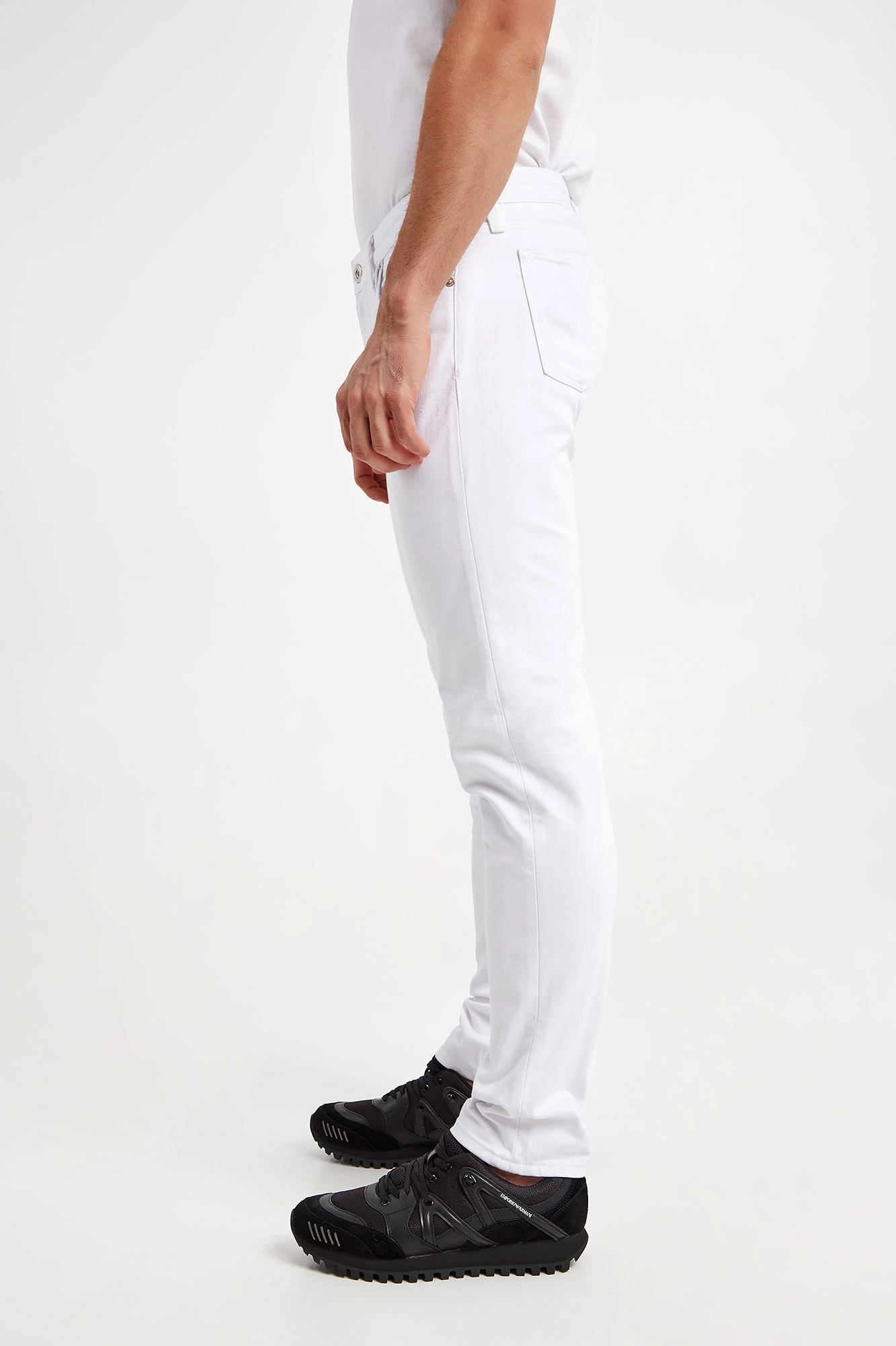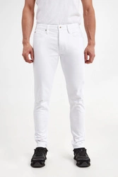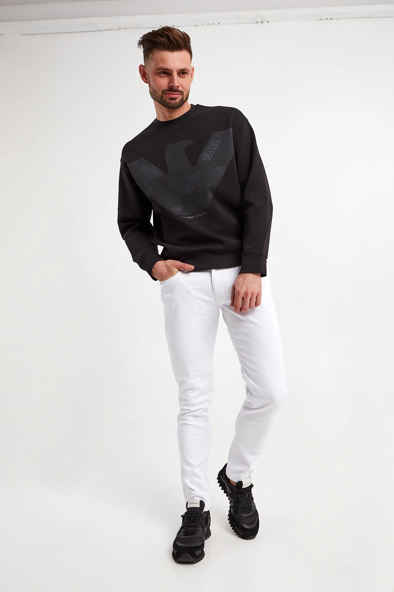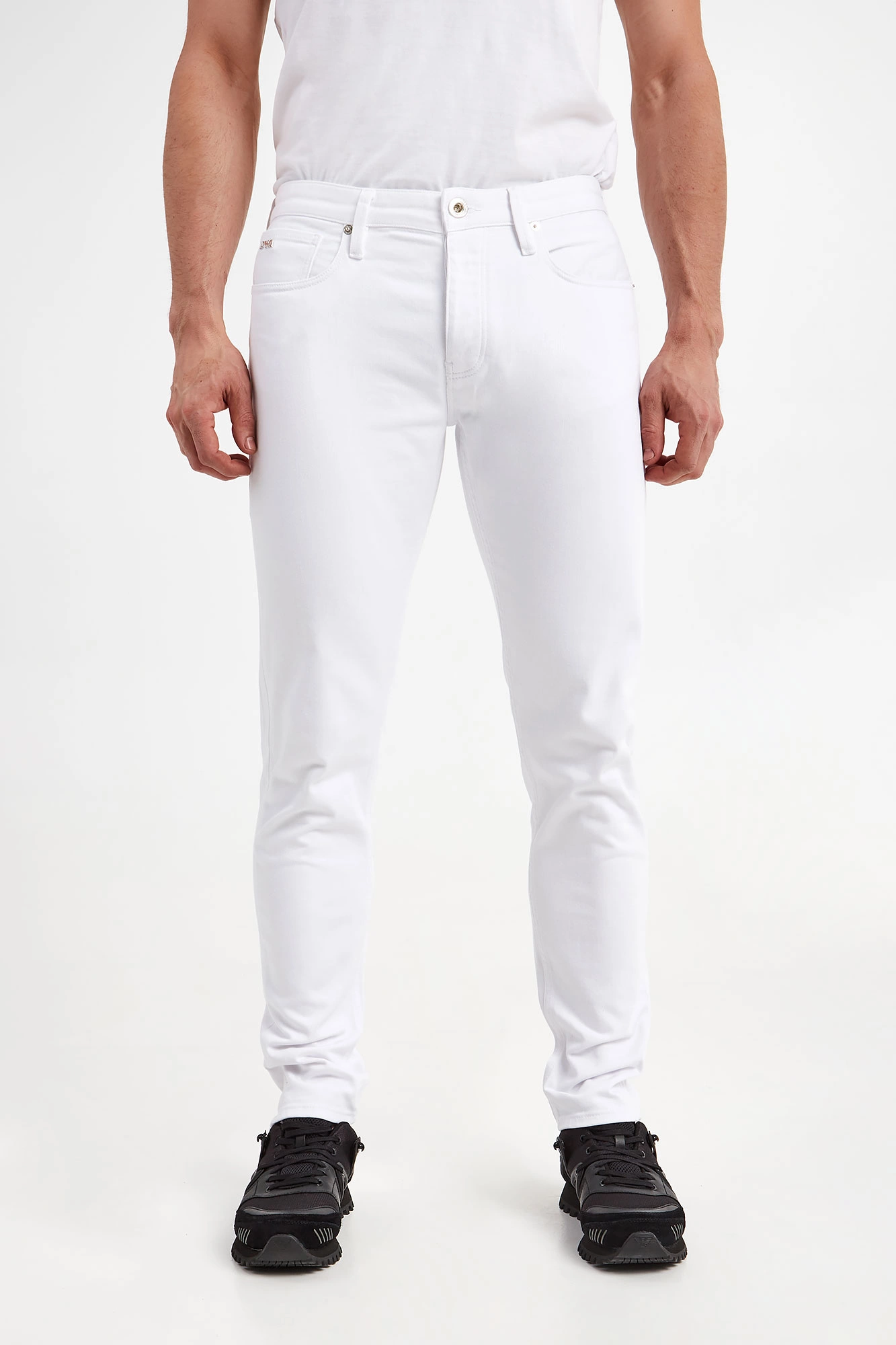 Jeansy marki Emporio Armani w białym kolorze. Fason typu slim fit. Model z pięcioma kieszeniami. Z przodu metalowa aplikacja z logo marki w srebrnym kolorze. W pasie szlufki. Zapinane za pomocą zamka błyskawicznego i sygnowanego guzika. Wykonane z bawełny.