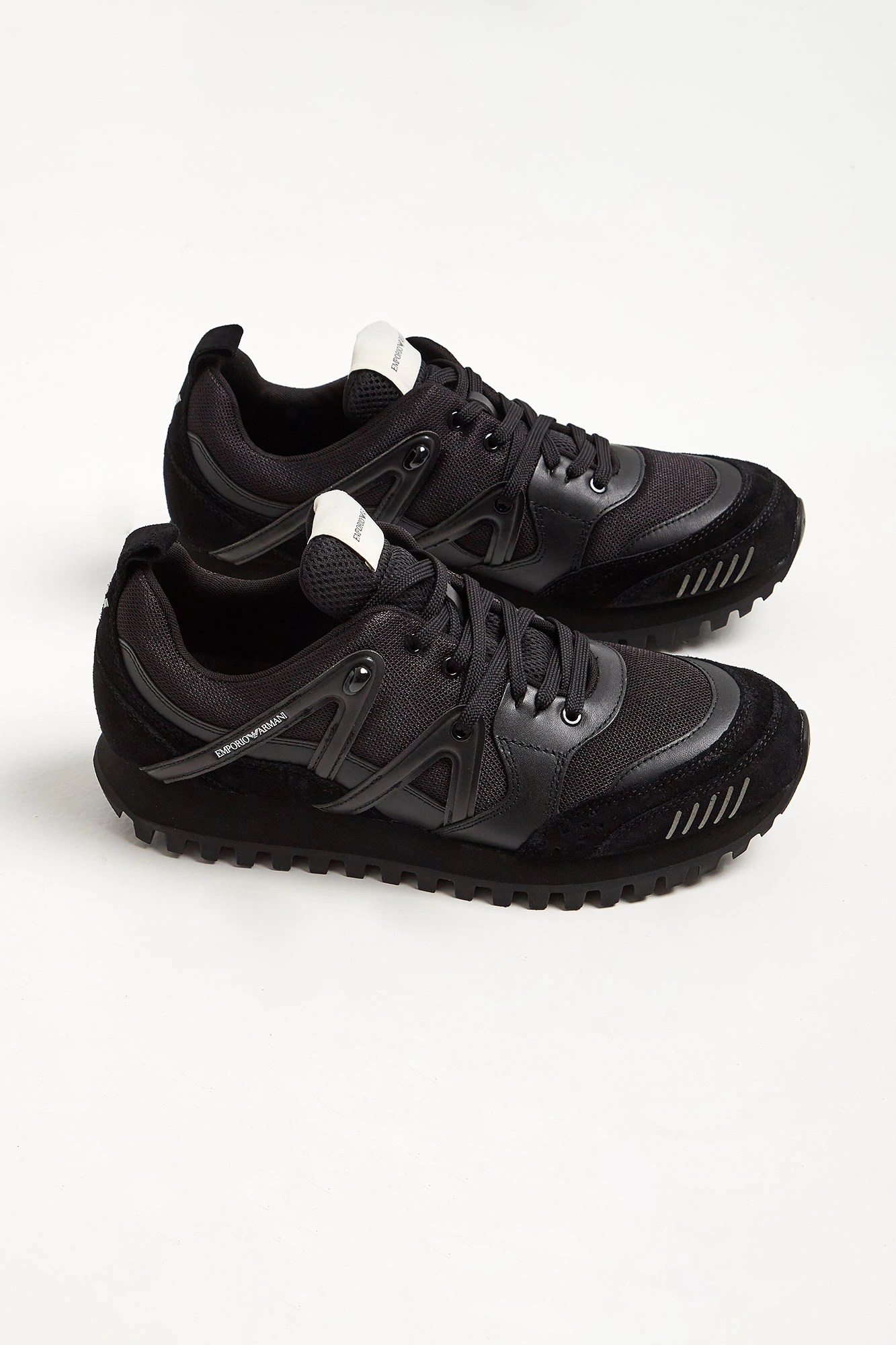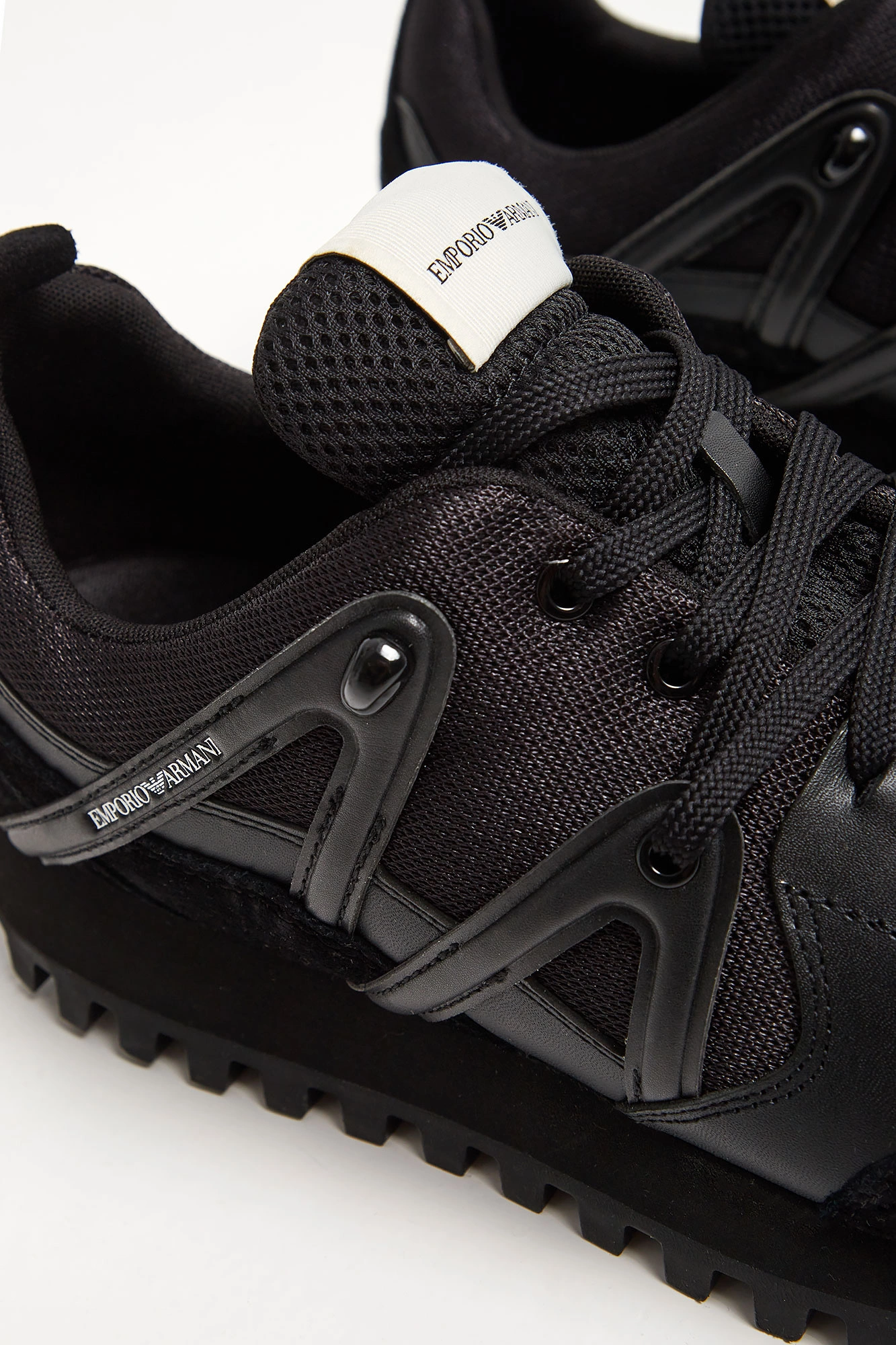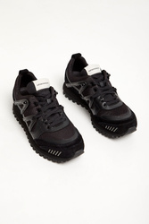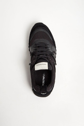 Sneakersy marki Armani Exchange w czarnym kolorze. Z zaokrąglonym noskiem. Z przodu i z tyłu wstawki zamszowego materiału. Na całości liczne przeszycia. Na zewnętrznych bokach delikatny nadruk w postaci nazwy marki w białym kolorze. Na języku naszywka z czarnym nadrukiem w postaci nazwy marki. Z tyłu monogram marki w białym kolorze. Sygnowana, gumowa podeszwa w czarnym kolorze.