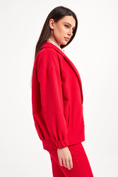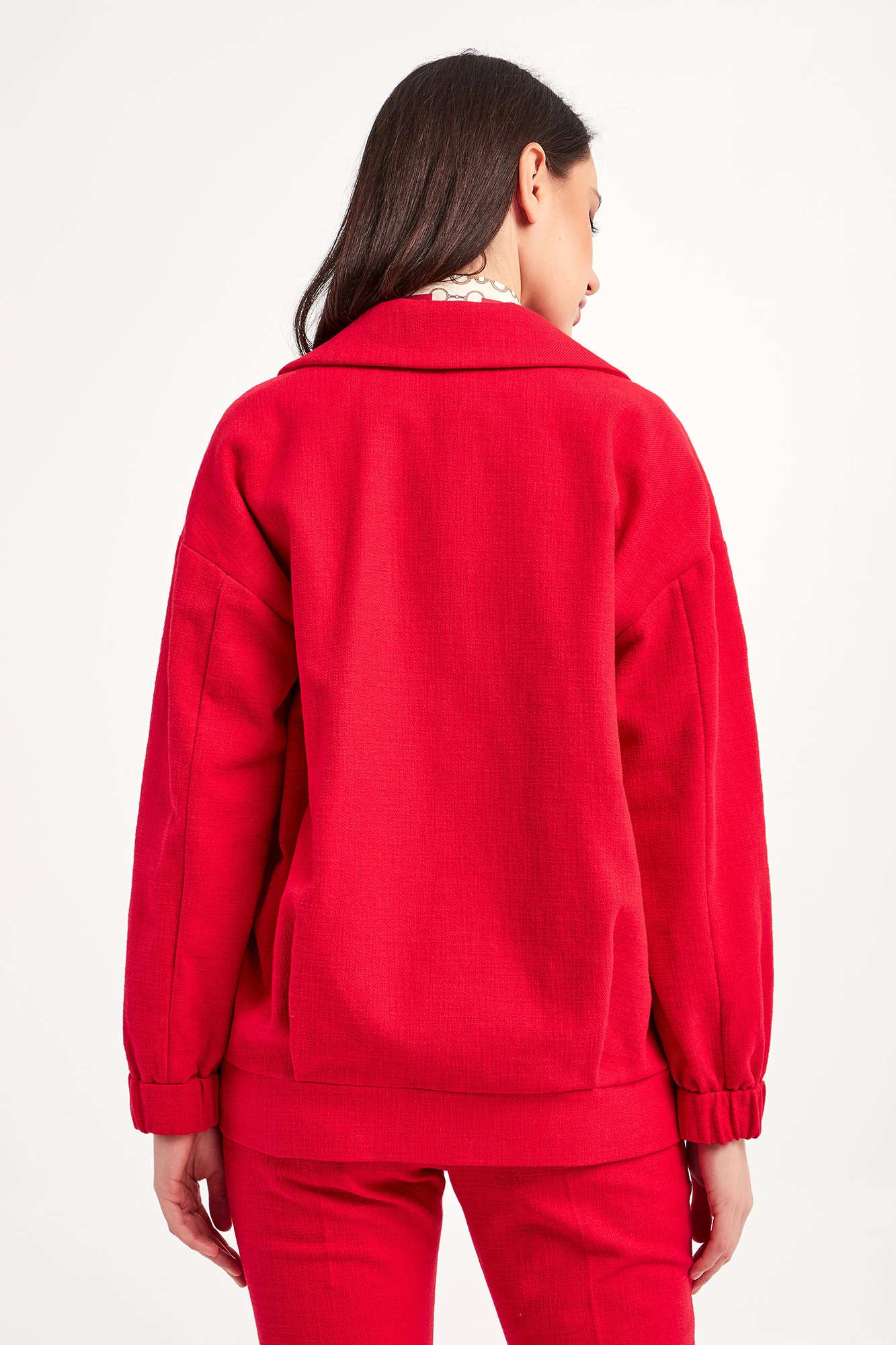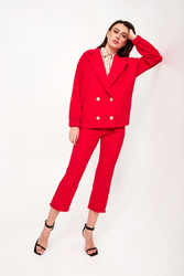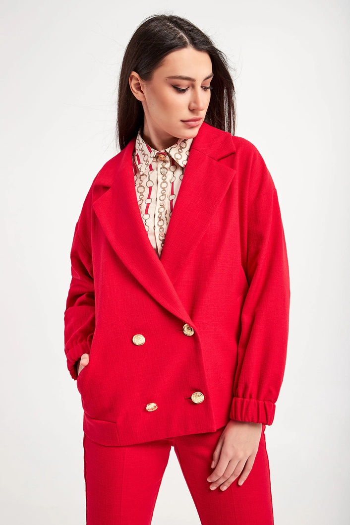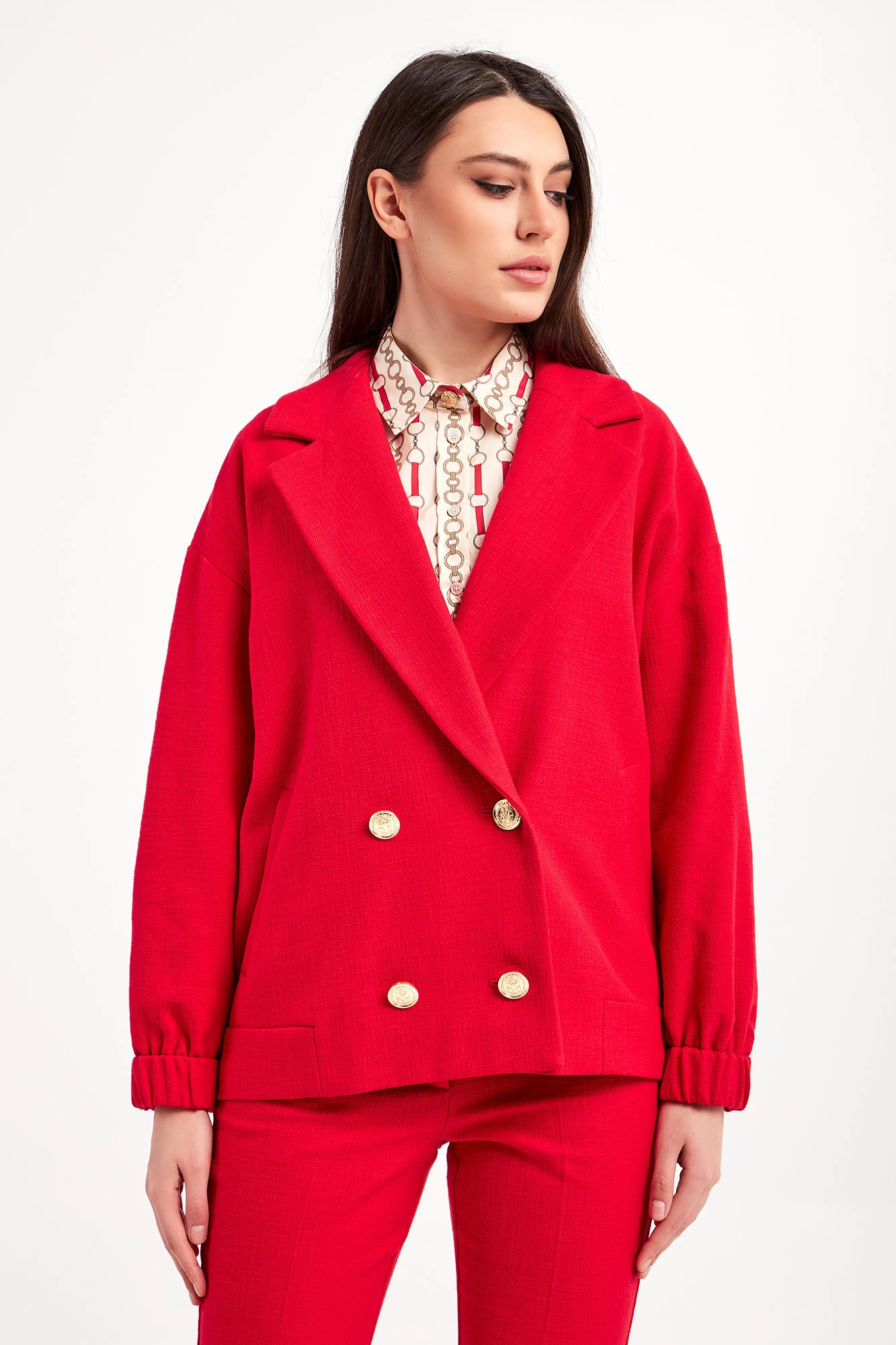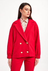 Płaszcz marki Marella w czerwonym kolorze typu żakietowego. Fason relaxed. Dekolt wykończony kołnierzykiem. Model z dwiema kieszeniami. Z przodu zapinany na złote dekoracyjne guziki. Długie rękawy wykończone elastycznym ściągaczem. Z tyłu dwie zakładki.
