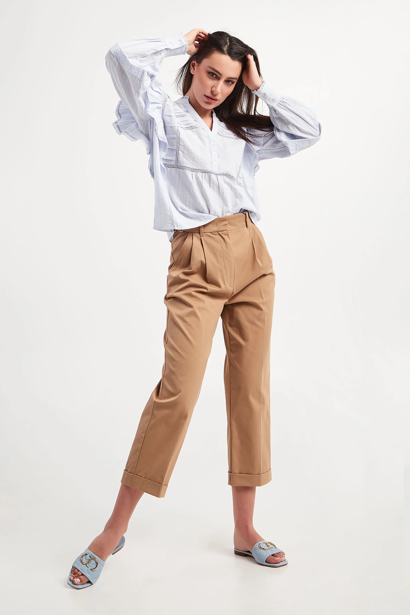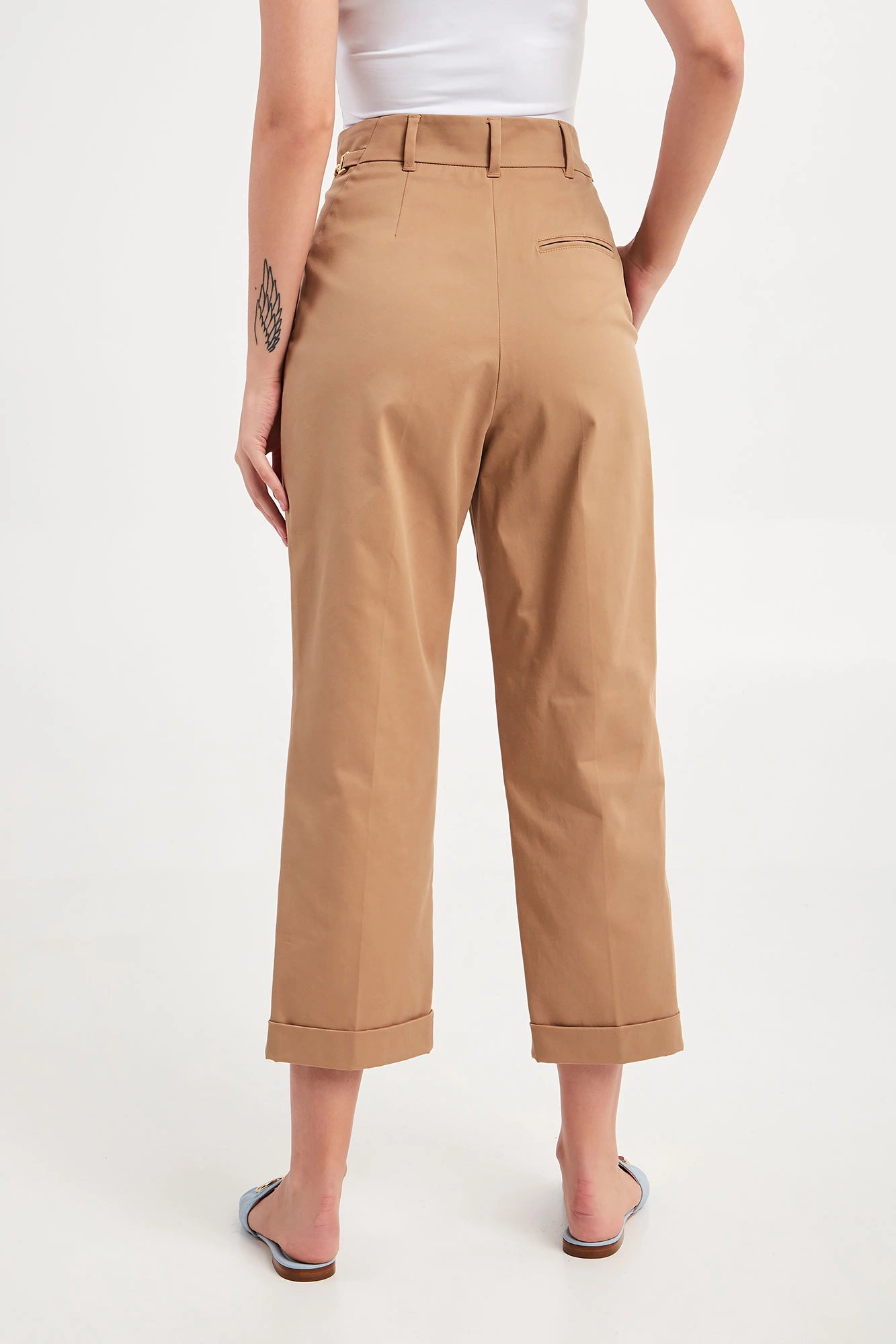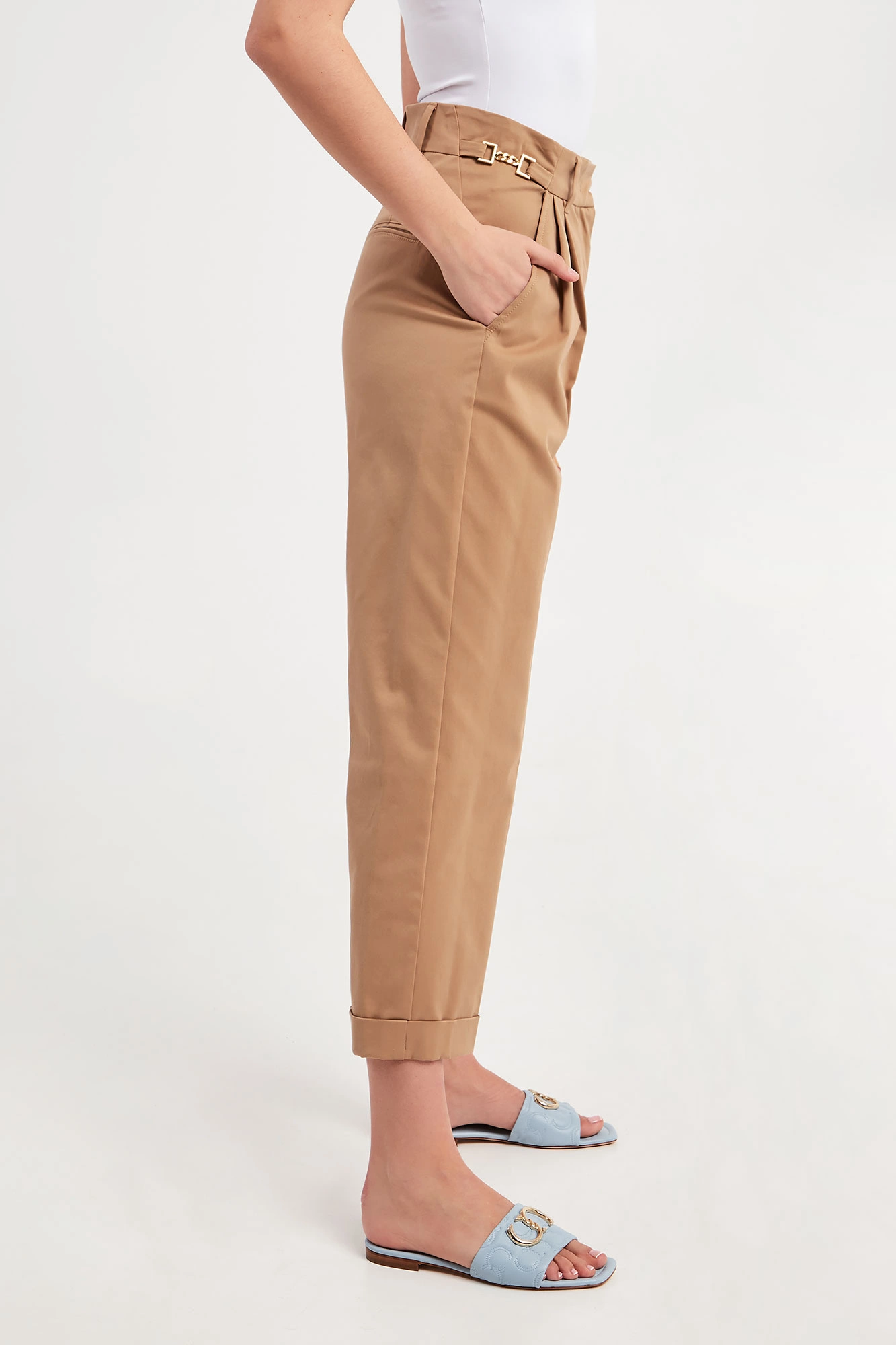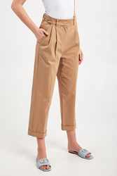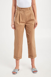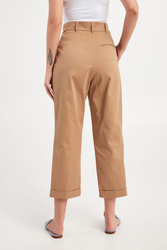 Spodnie marki Marella w kamelowym kolorze. Fason regular fit. Zapinane za pomocą zamka oraz krytej haftki. W pasie złote, biżuteryjne łańcuszki i szlufki. Dwie boczne, wpuszczane kieszenie. Pod pasem zakładki. Proste nogawki zakończone podwijaną lamówką. Z tyłu patka imitująca kieszeń. Wykonane z bawełnianej tkaniny pozyskiwanej od sieci dostawców zaangażowanych w rolnictwo o niskim wpływie.