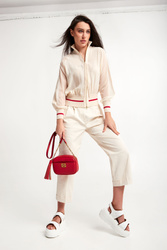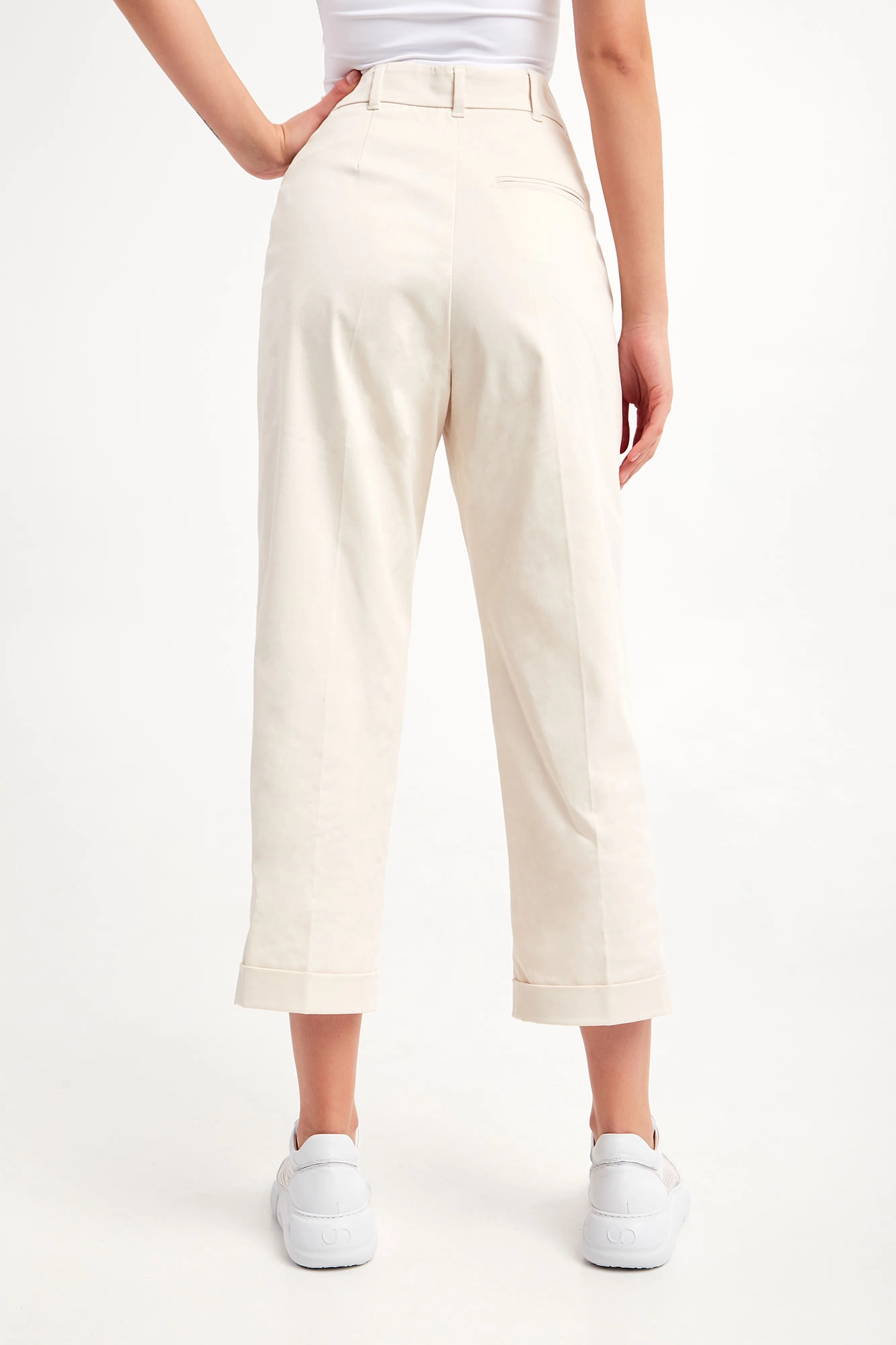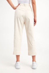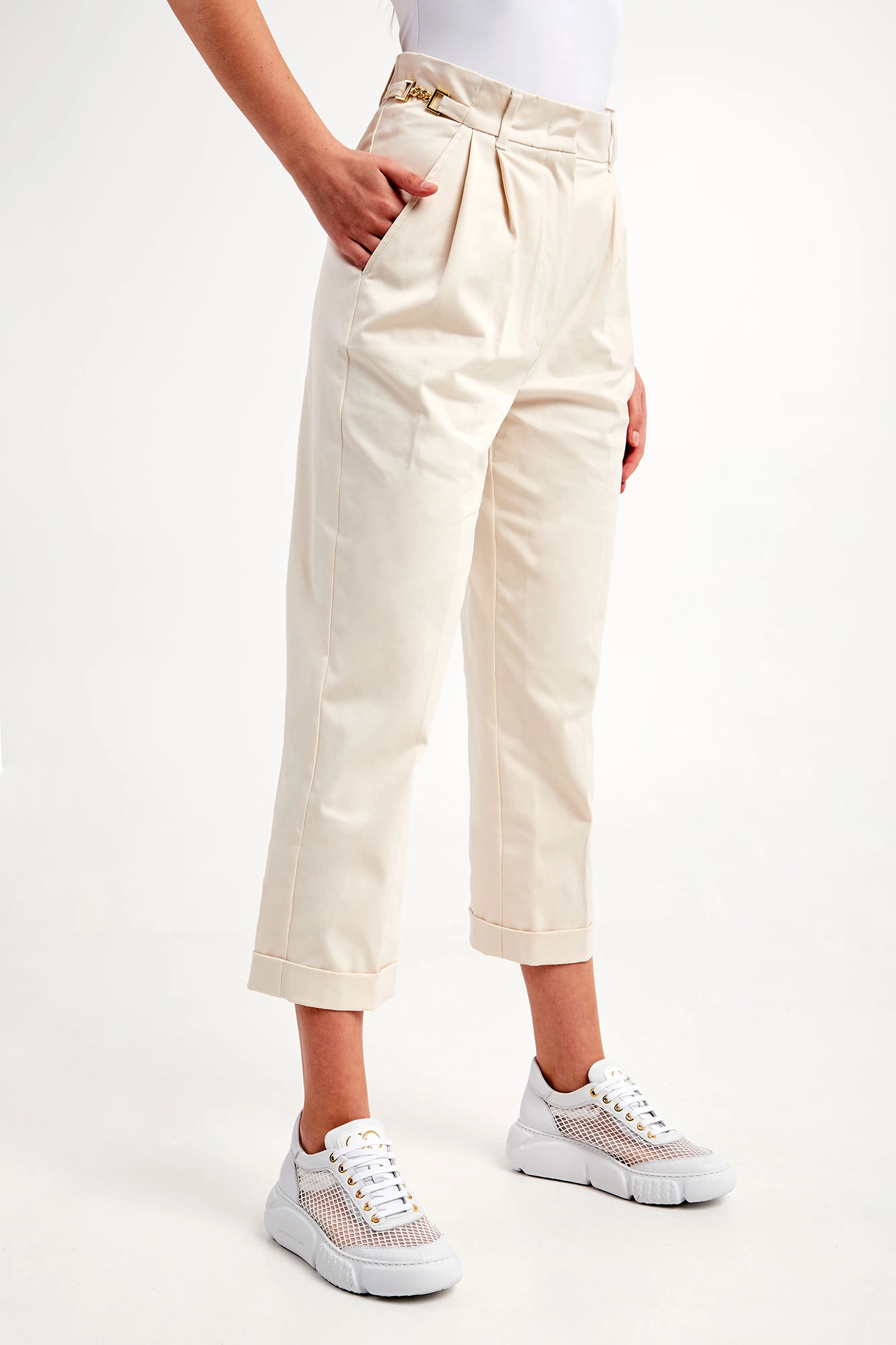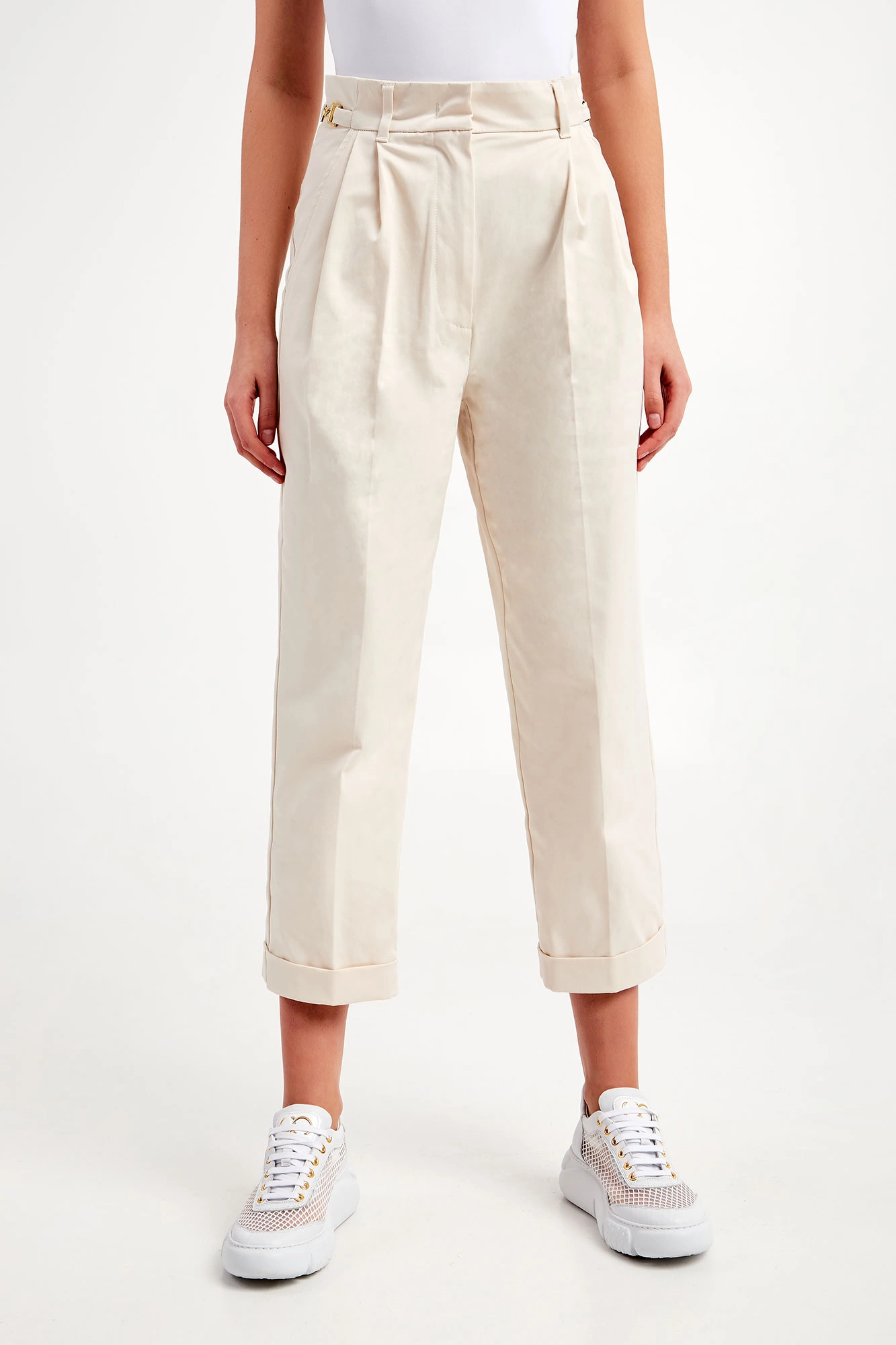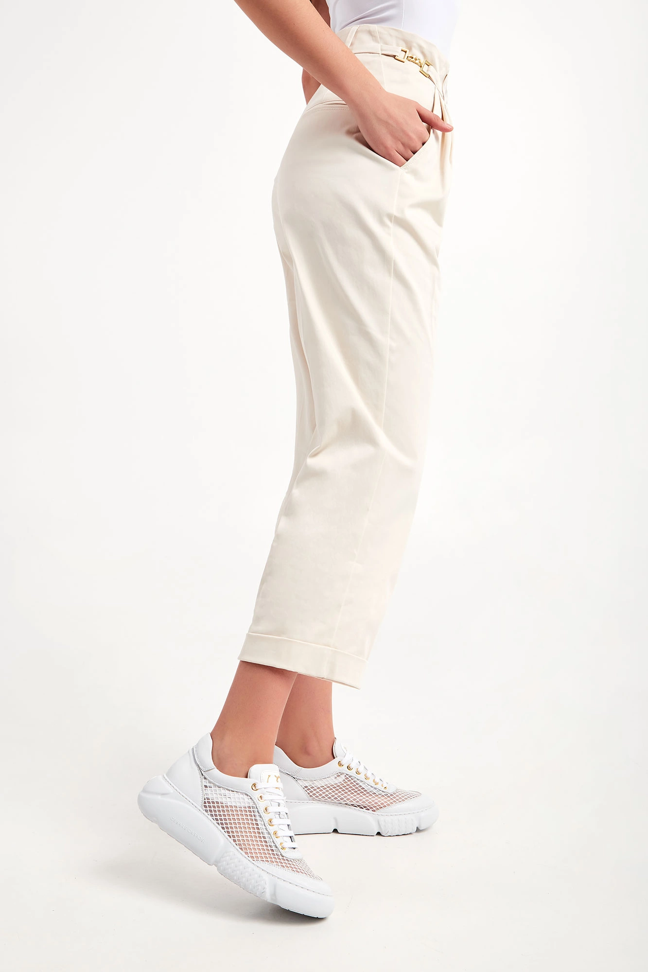 Spodnie marki Marella w kolorze ecru. Fason regular fit. Zapinane za pomocą zamka oraz krytej haftki. W pasie złote, biżuteryjne łańcuszki i szlufki. Dwie boczne, wpuszczane kieszenie. Pod pasem zakładki. Proste nogawki zakończone podwijaną lamówką. Z tyłu patka imitująca kieszeń. Wykonane z bawełnianej tkaniny pozyskiwanej od sieci dostawców zaangażowanych w rolnictwo o niskim wpływie.