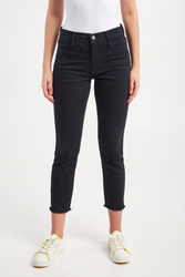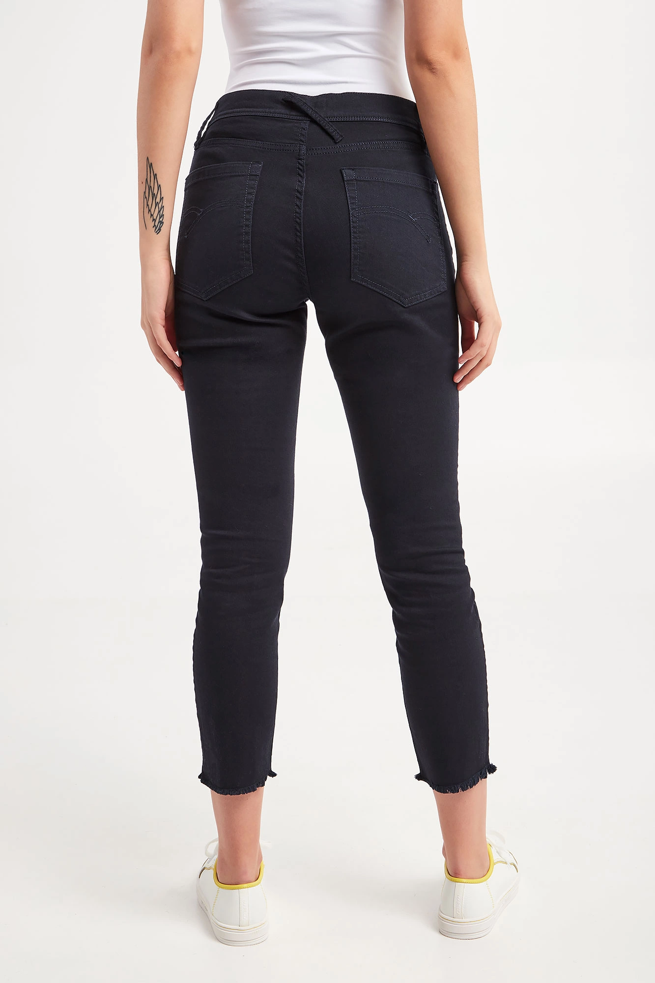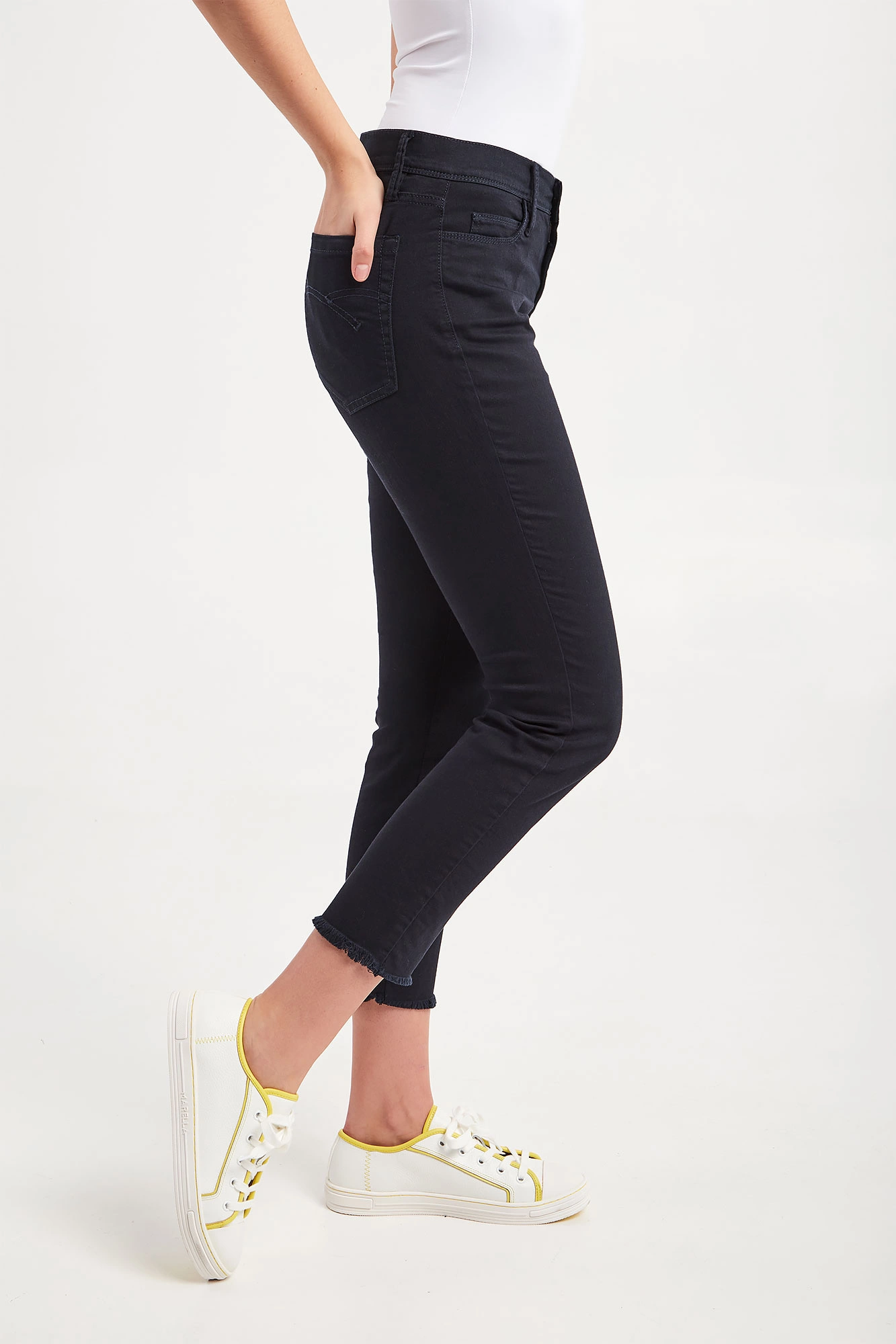 Spodnie marki Marella Sport w granatowym kolorze. Fason slim fit. Zapinane za pomocą zamka oraz sygnowanego guzika. Model z pięcioma kieszeniami. W pasie szlufki. Jedna z nich dłuższa, wszyta ozdobnie, pod ukosem. Na tylnych kieszeniach przeszycia. Nogawki zakończone strzępieniem. Wykonane z bawełnianej tkaniny.