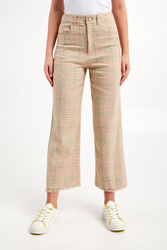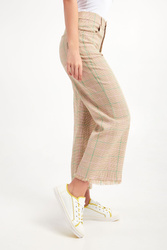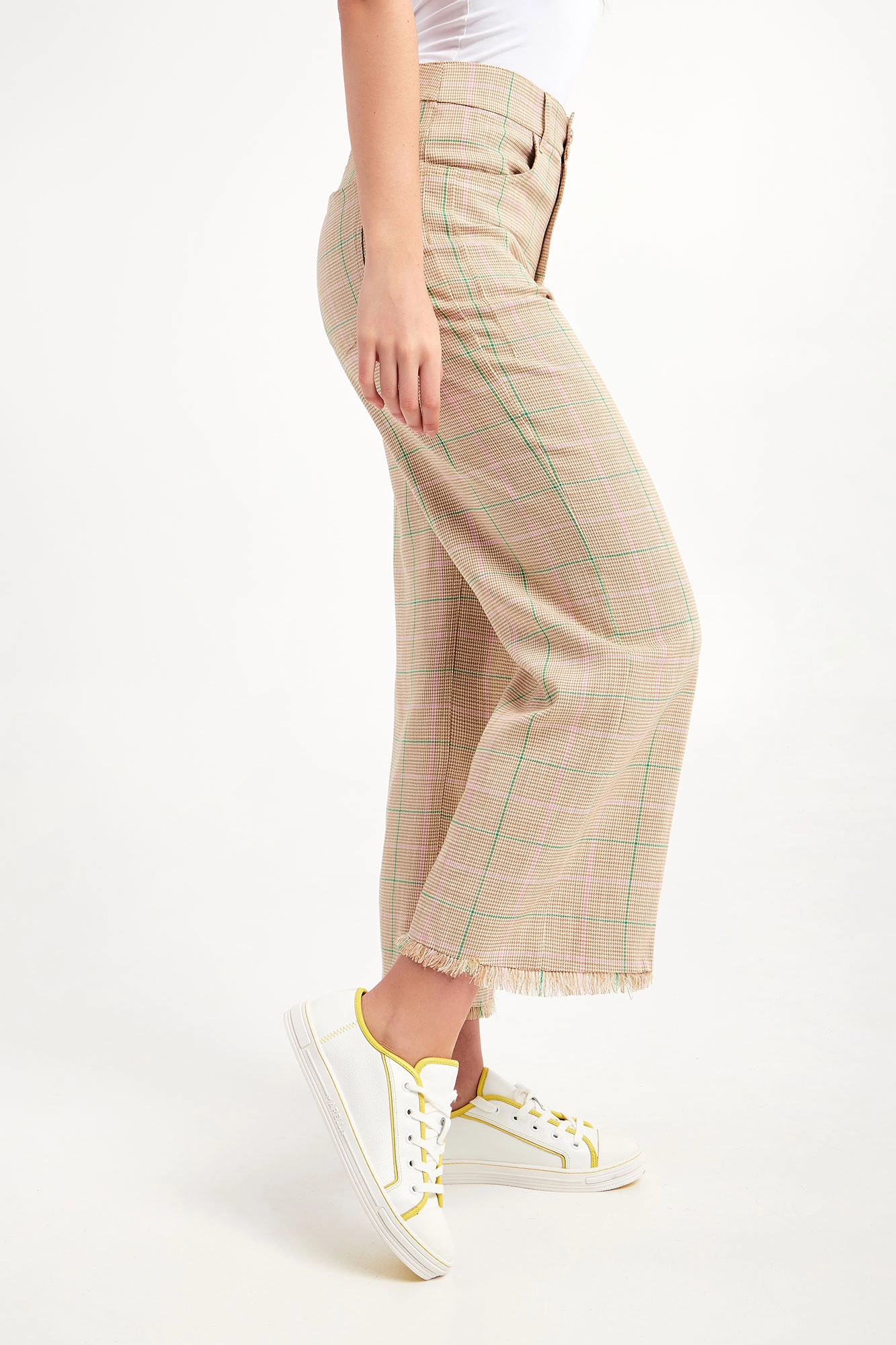 Spodnie marki Marella. Na całości biało-beżowa pepitka i różowo-zielona kratka. Fason typu cullote. Zapiane za pomocą zamka oraz biżuteryjnego, złotego guzika. Model z czterema kieszeniami. W pasie szlufki. Na zakończonych strzępieniem nogawkach kant. Wykonane z wiskozowej tkaniny z dodatkiem elastycznych włókien.