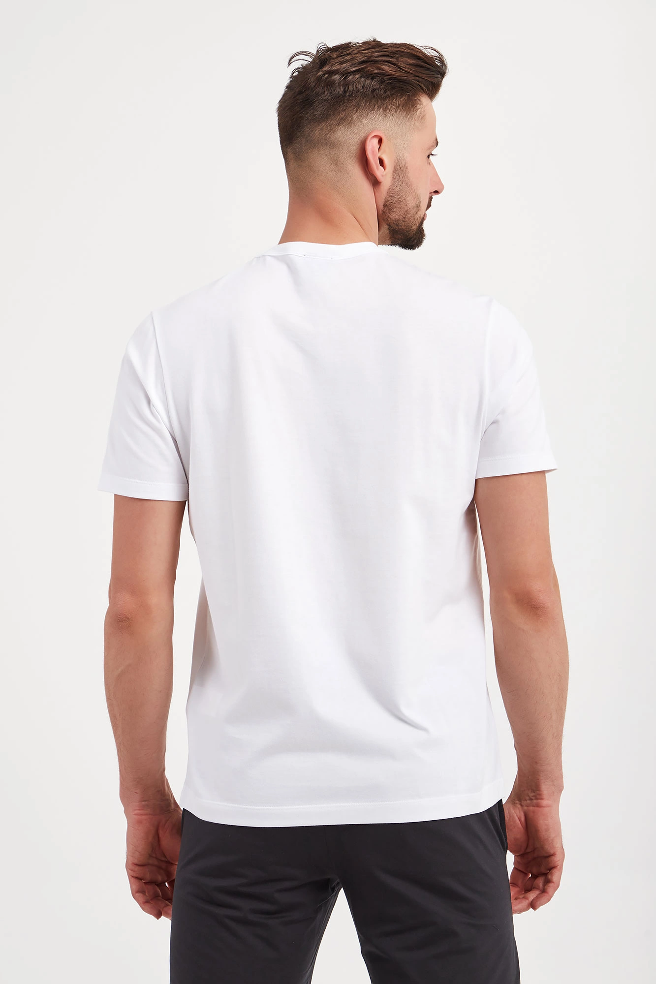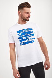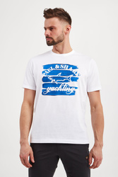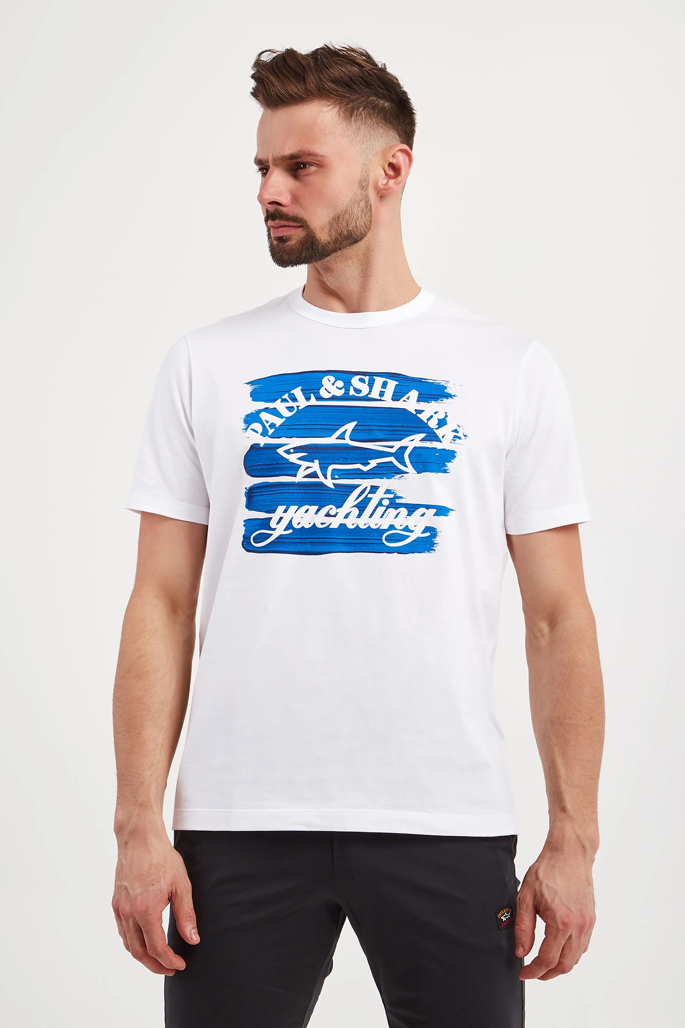 T-shirt marki Paul&Shark w białym kolorze. Fason slim fit. Na froncie biało-niebieski nadruk z logo marki. Dekolt typu o-neck zakończony ściągaczem. Krótkie rękawy i dół wykończone lamówką. Wykonany z mięsistej bawełny organicznej.
