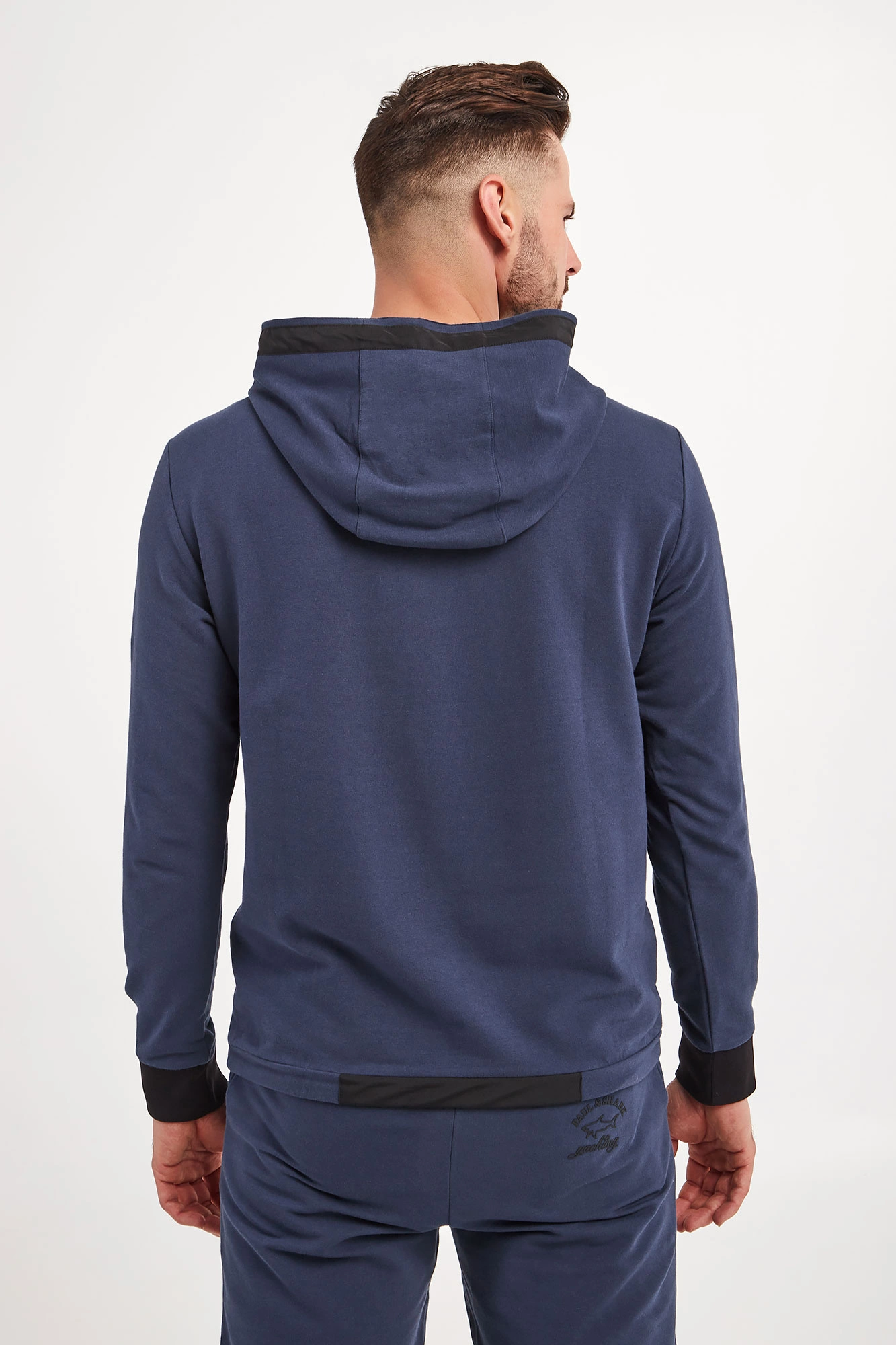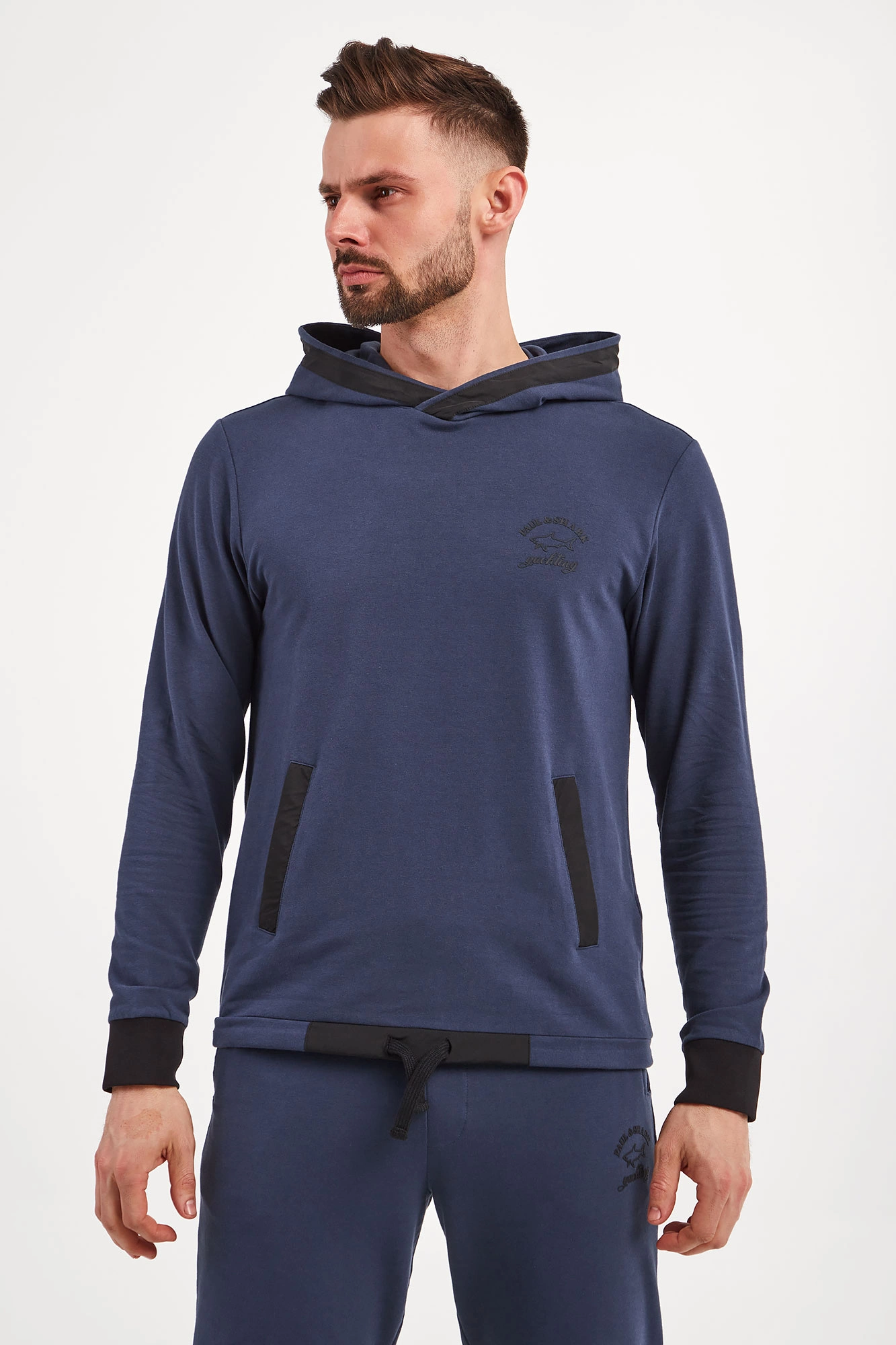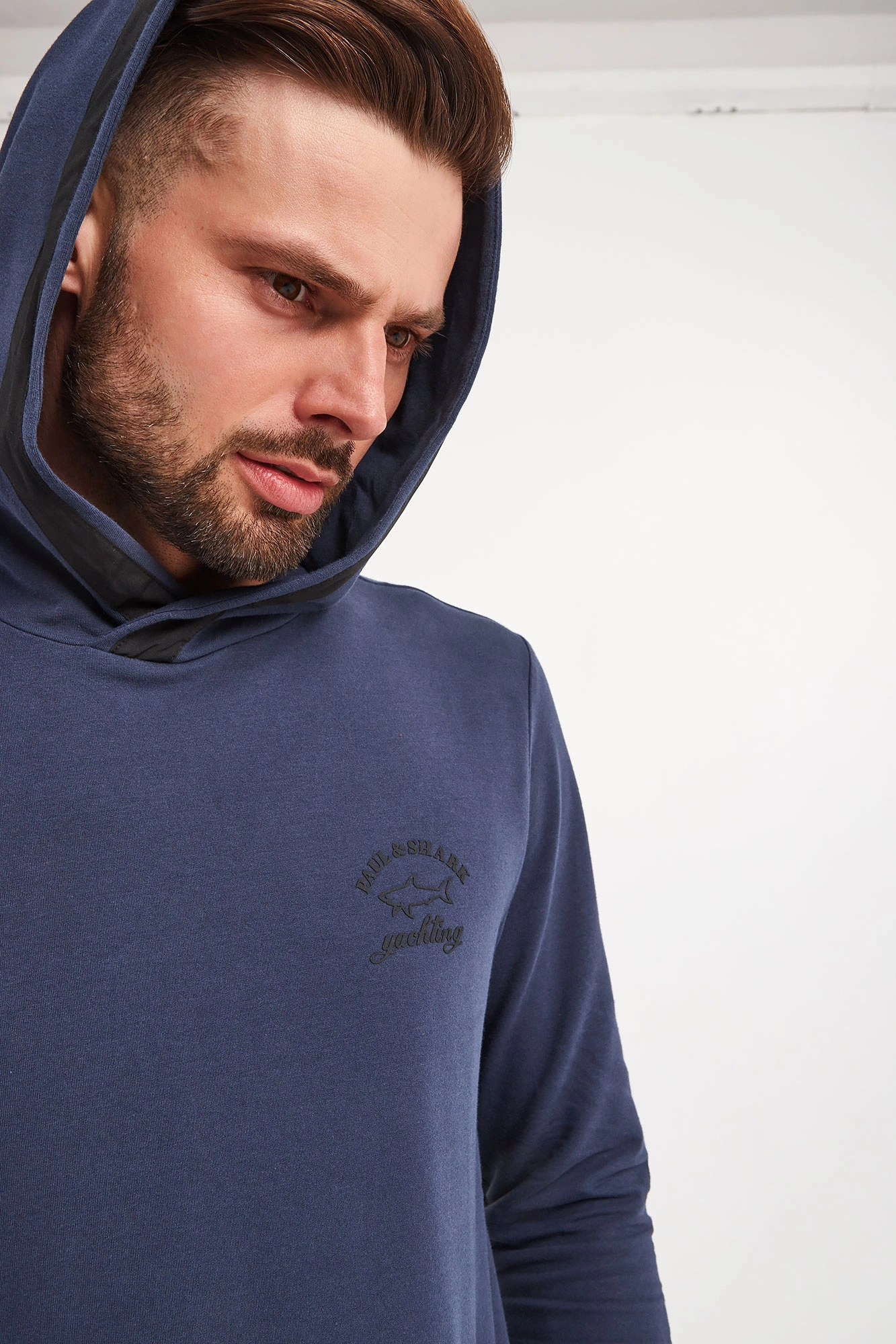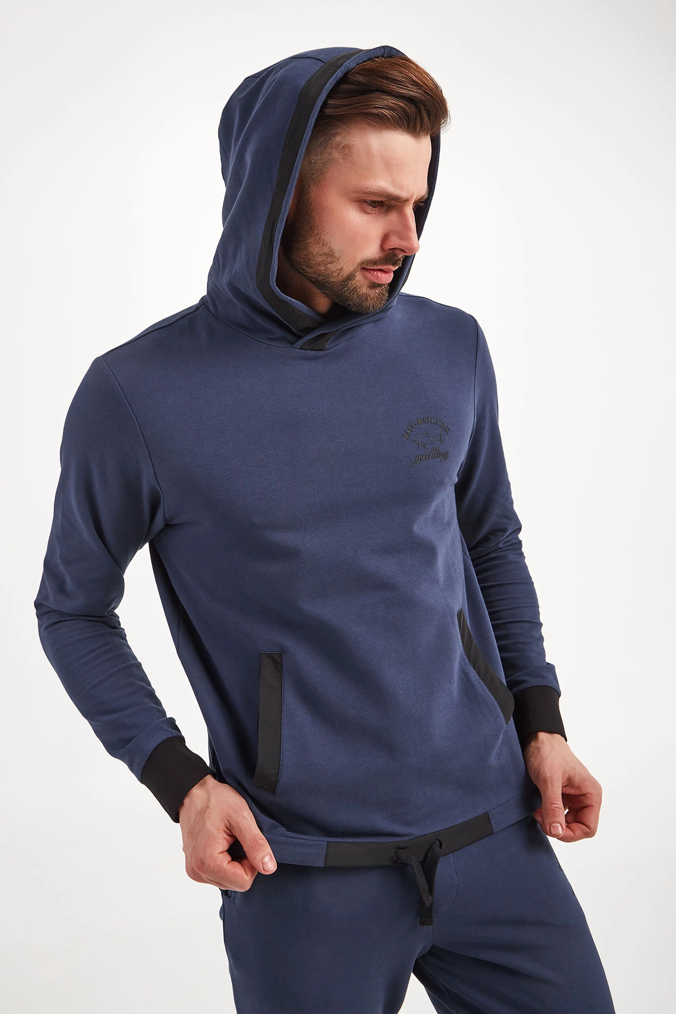 Bluza z kapturem marki Paul&Shark w granatowym kolorze. Fason regular fit. Z boku czarny, gumowany nadruk z logo. Boczne, wpuszczane kieszenie i kaptur wykończone czarną lamówką. Długie rękawy zakończone ściągaczami. U dołu ściągacz regulowany za pomocą troczków. Wykonana z bawełnianej tkaniny z dodatkiem elastycznych włókien.