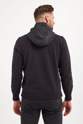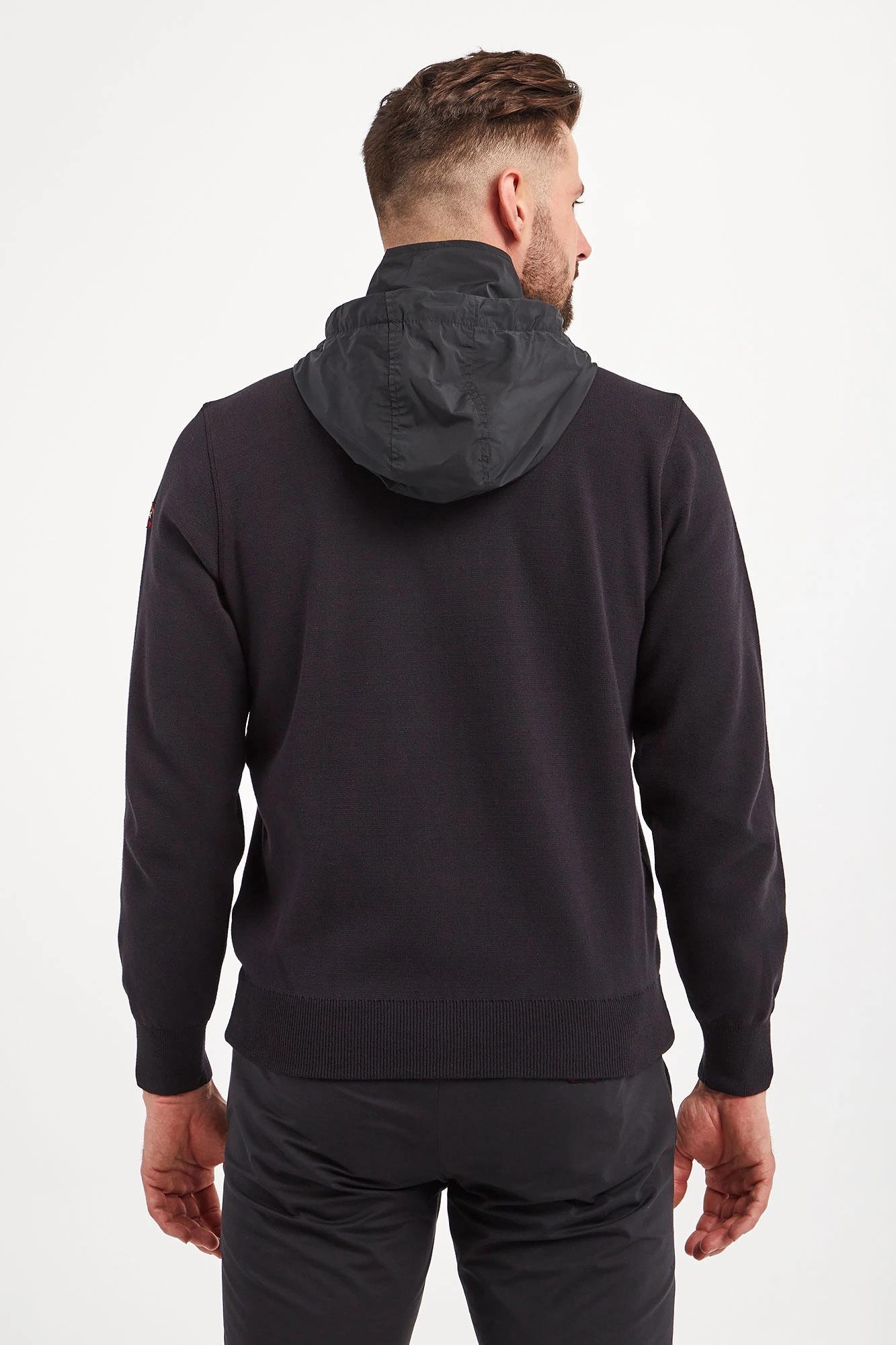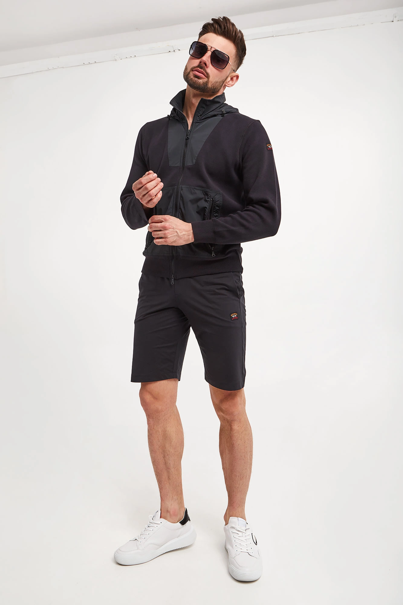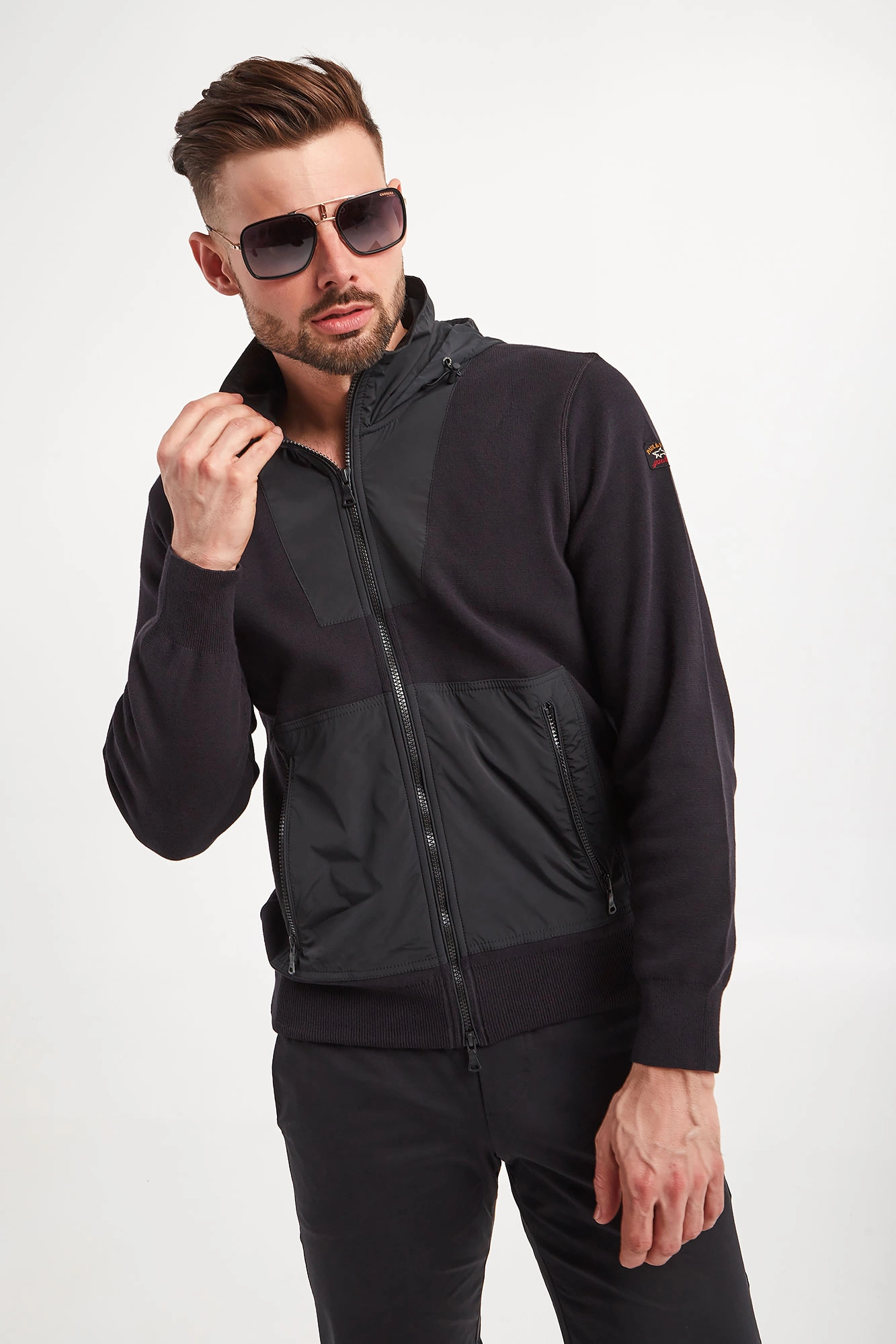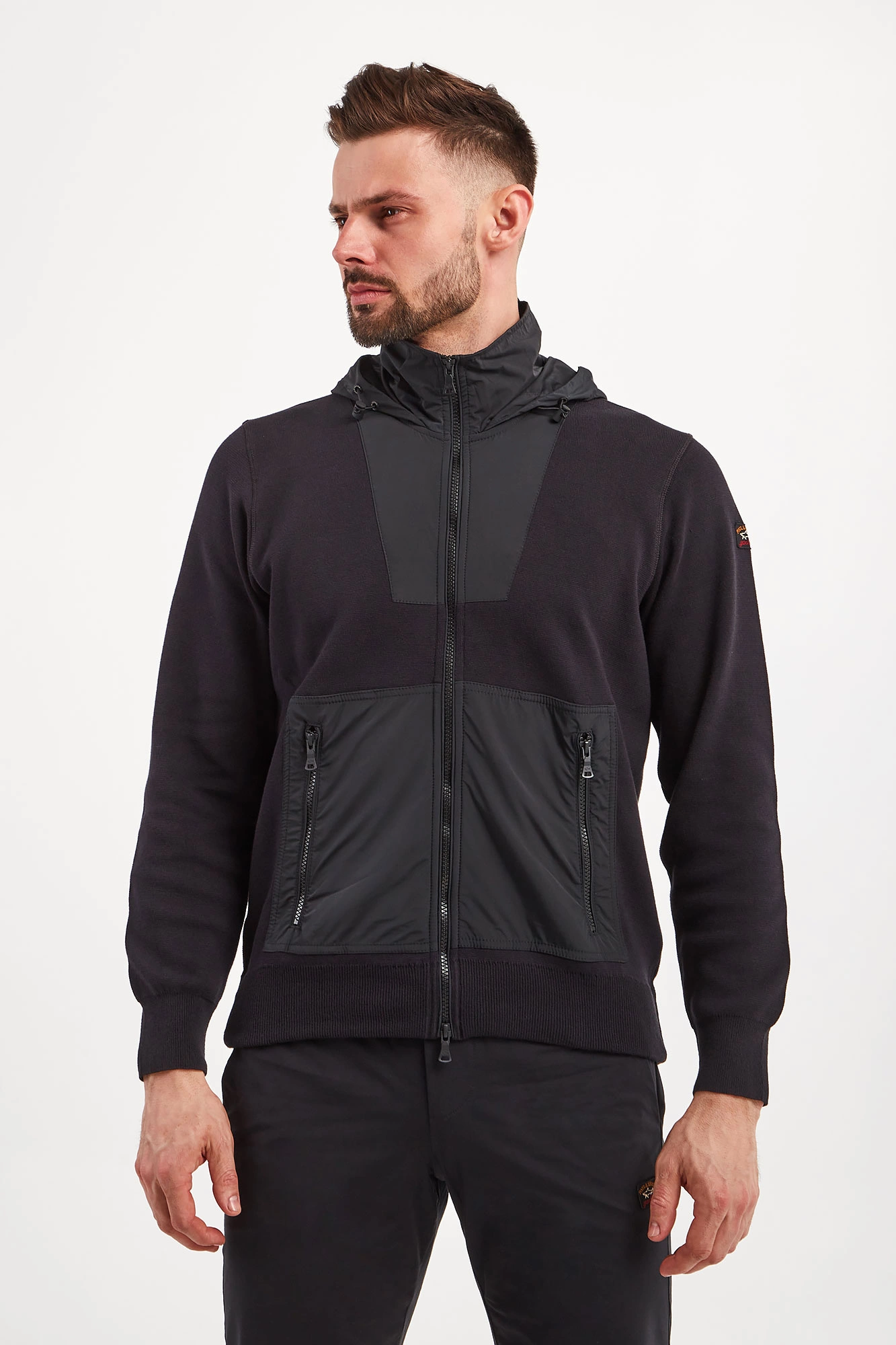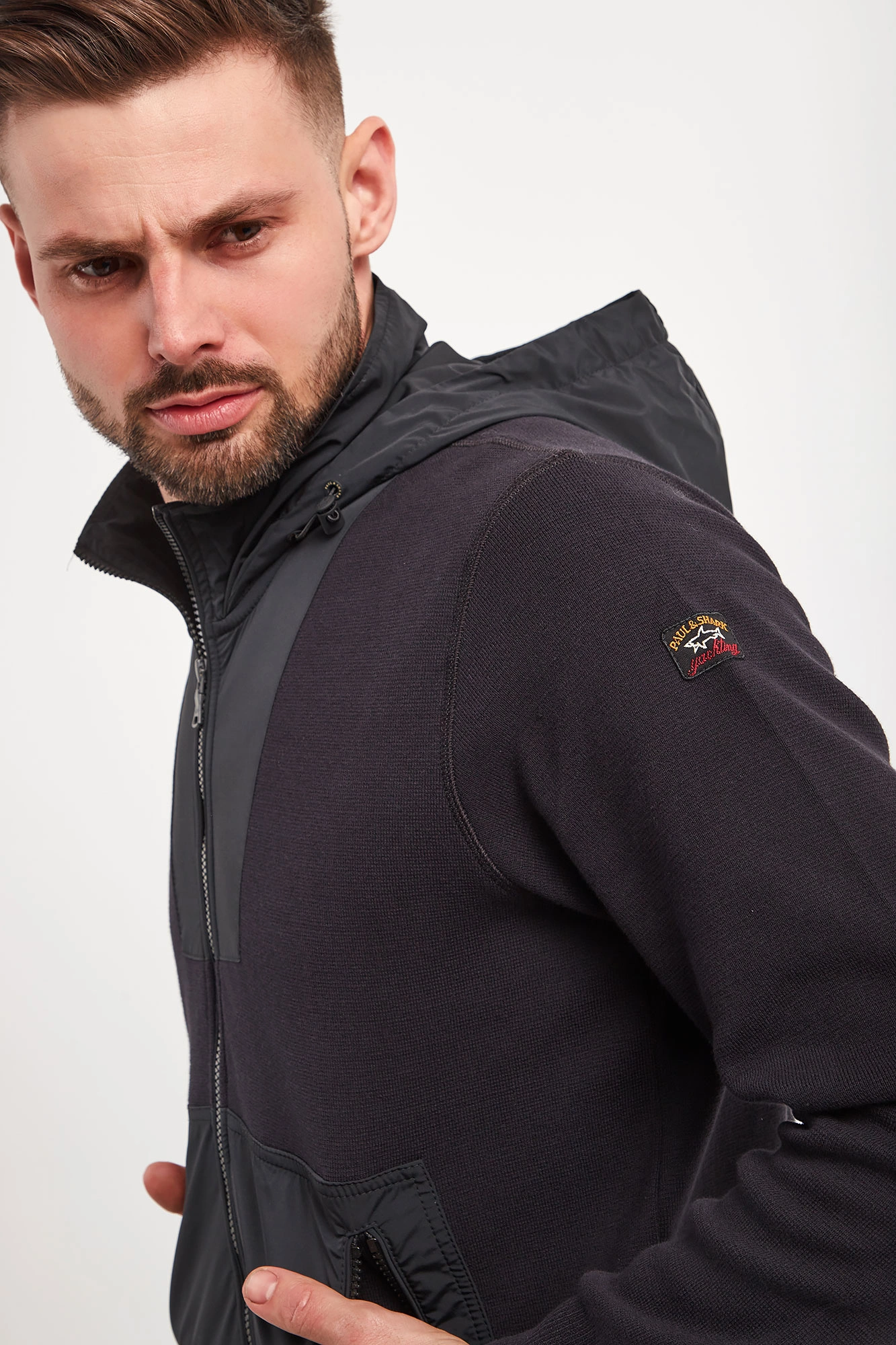 Sweter z kapturem marki Paul&Shark w czarnym kolorze. Fason regular fit. Zapinany za pomocą dwustronnego zamka z sygnowanymi zawieszkami. Na rękawie logowana naszywka. Dwie boczne, zamykane kieszenie. Regulowany kaptur, kołnierz i kieszenie wykonane z kontrastującego materiału. Rękawy i dół zakończone ściągaczami. Wykonany z organicznej, bawełnianej tkaniny.