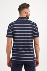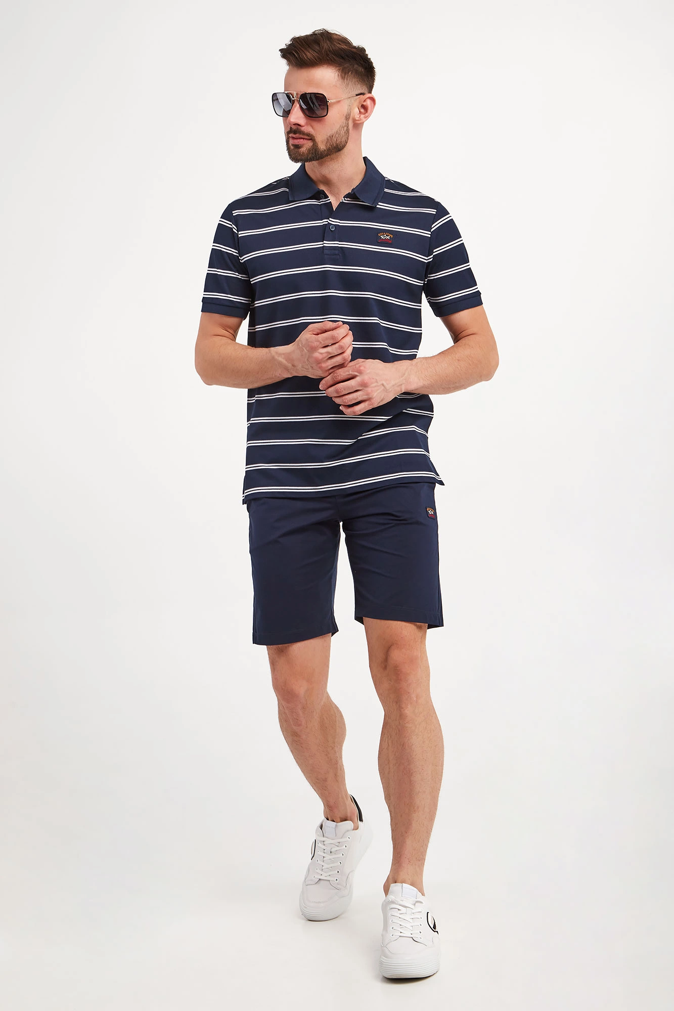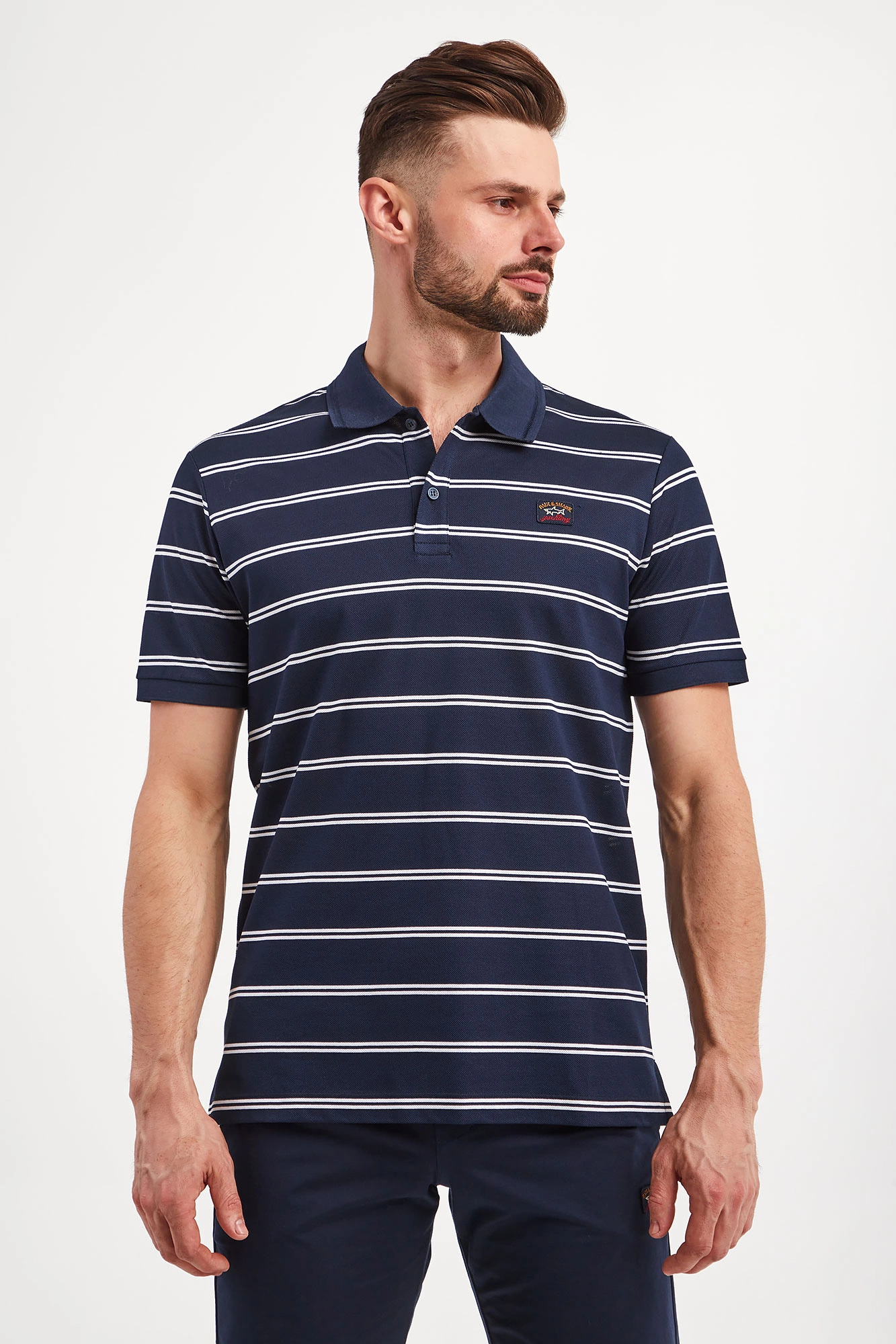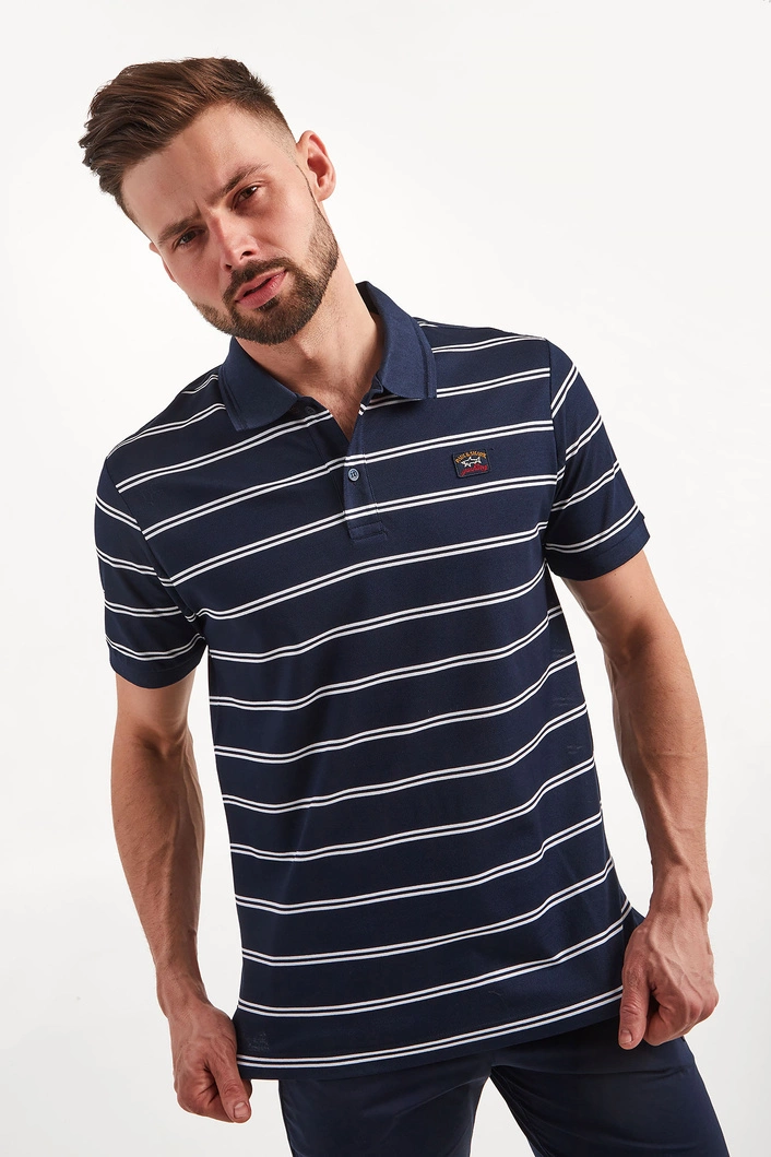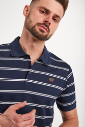 Polo marki Paul&Shark w granatowym kolorze. Na całości białe, poziome paski. Fason slim fit. Z boku niewielka naszywka z haftowanym logo. Klasyczny kołnierz zapinany za pomocą sygnowanych, granatowych guzików. Krótkie rękawy zakończone ściągaczami. Po bokach rozcięcia. Dół wykończony lamówką. Wykonana z czystej, merceryzowanej bawełny.