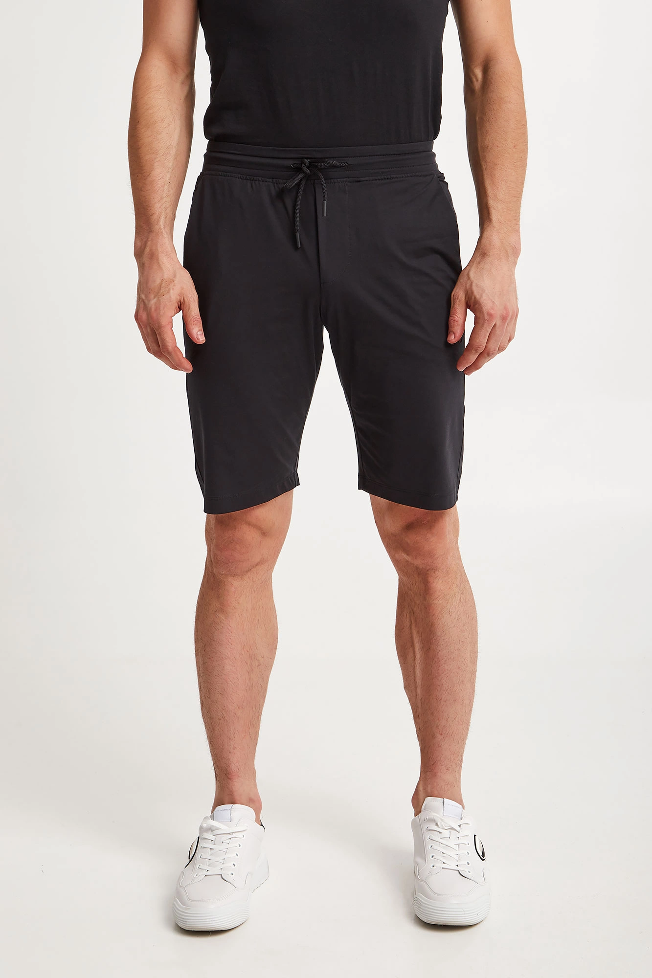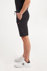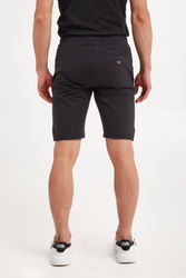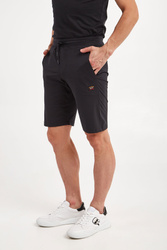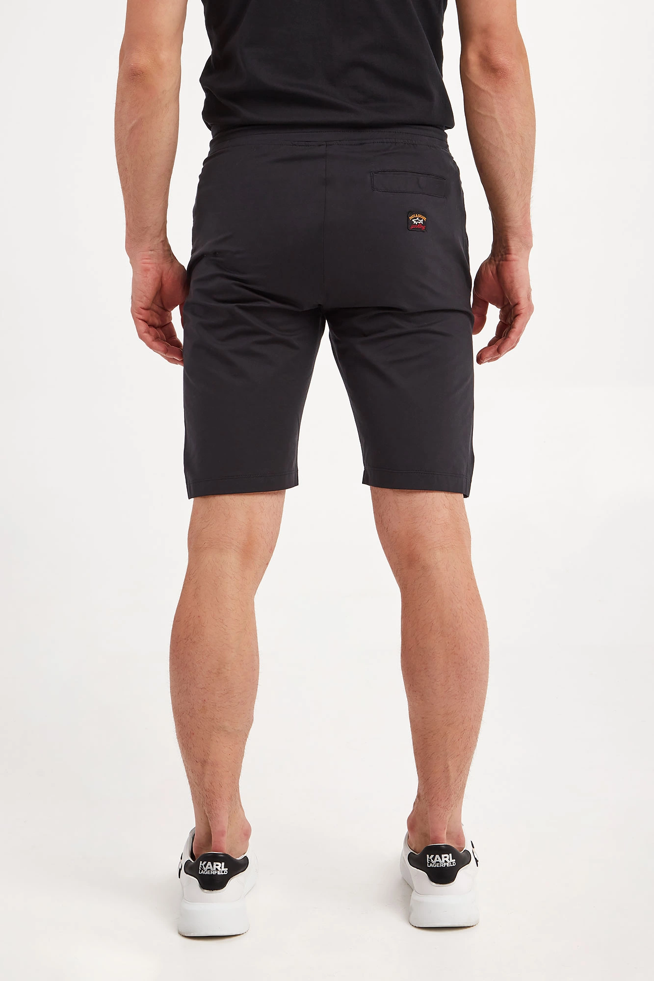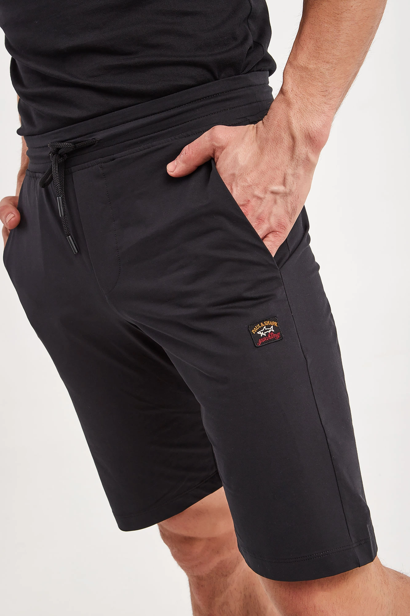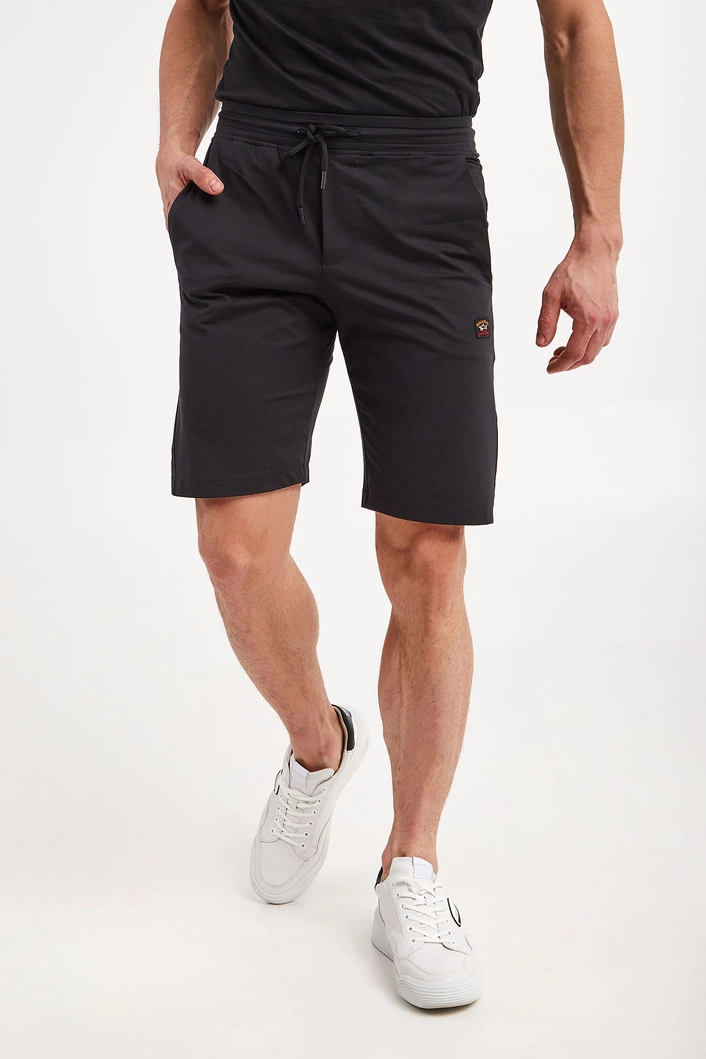 Spodenki marki Paul&Shark w czarnym kolorze. Fason regular fit. Z boku i z tyłu naszywki z kolorowym, haftowanym logo marki. W pasie ściągacz regulowany za pomocą troczków z sygnowanymi stoperami. Dwie boczne, wpuszczane kieszenie i jedna zamykana z tyłu. Nogawki zakończone lamówką. Wykonane z mieszanki bawełny oraz elastanu.