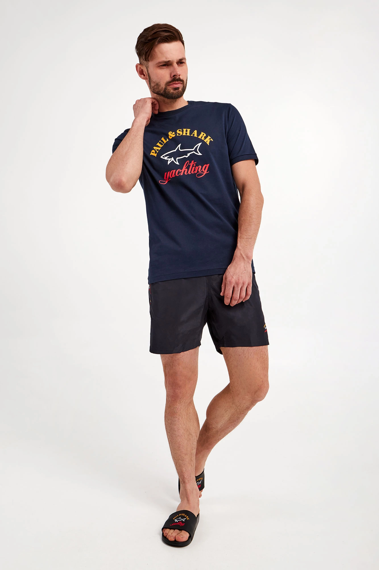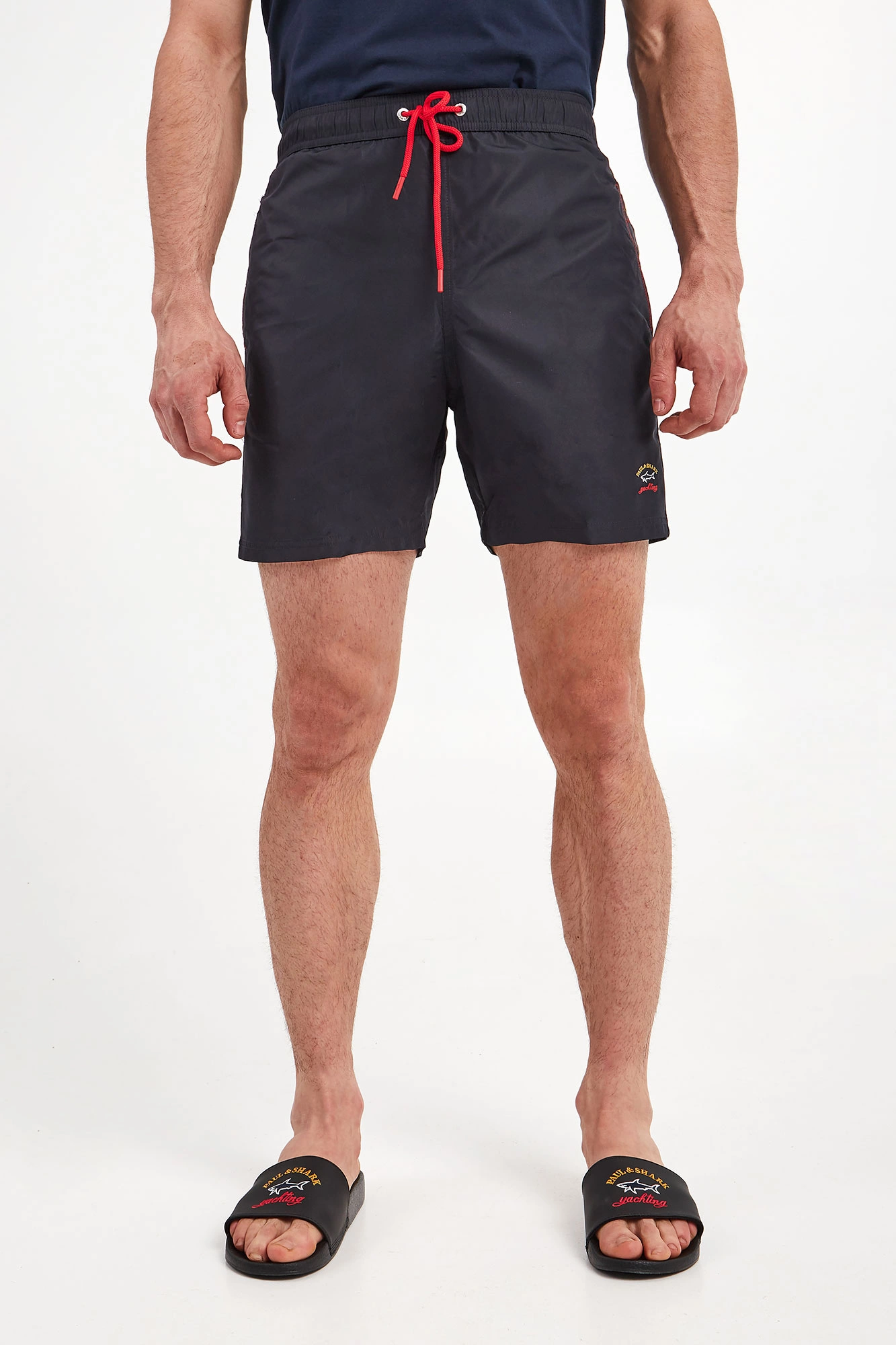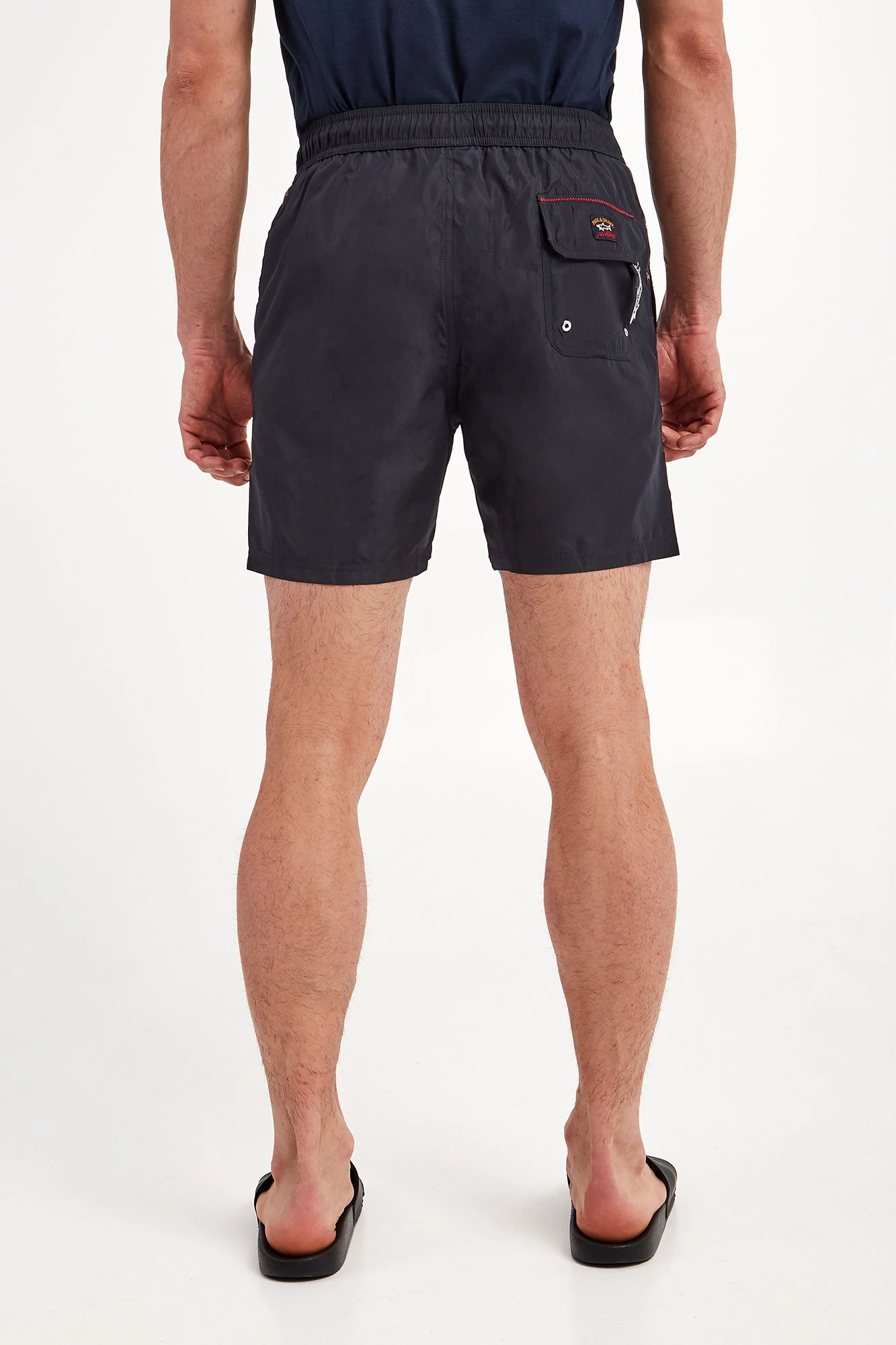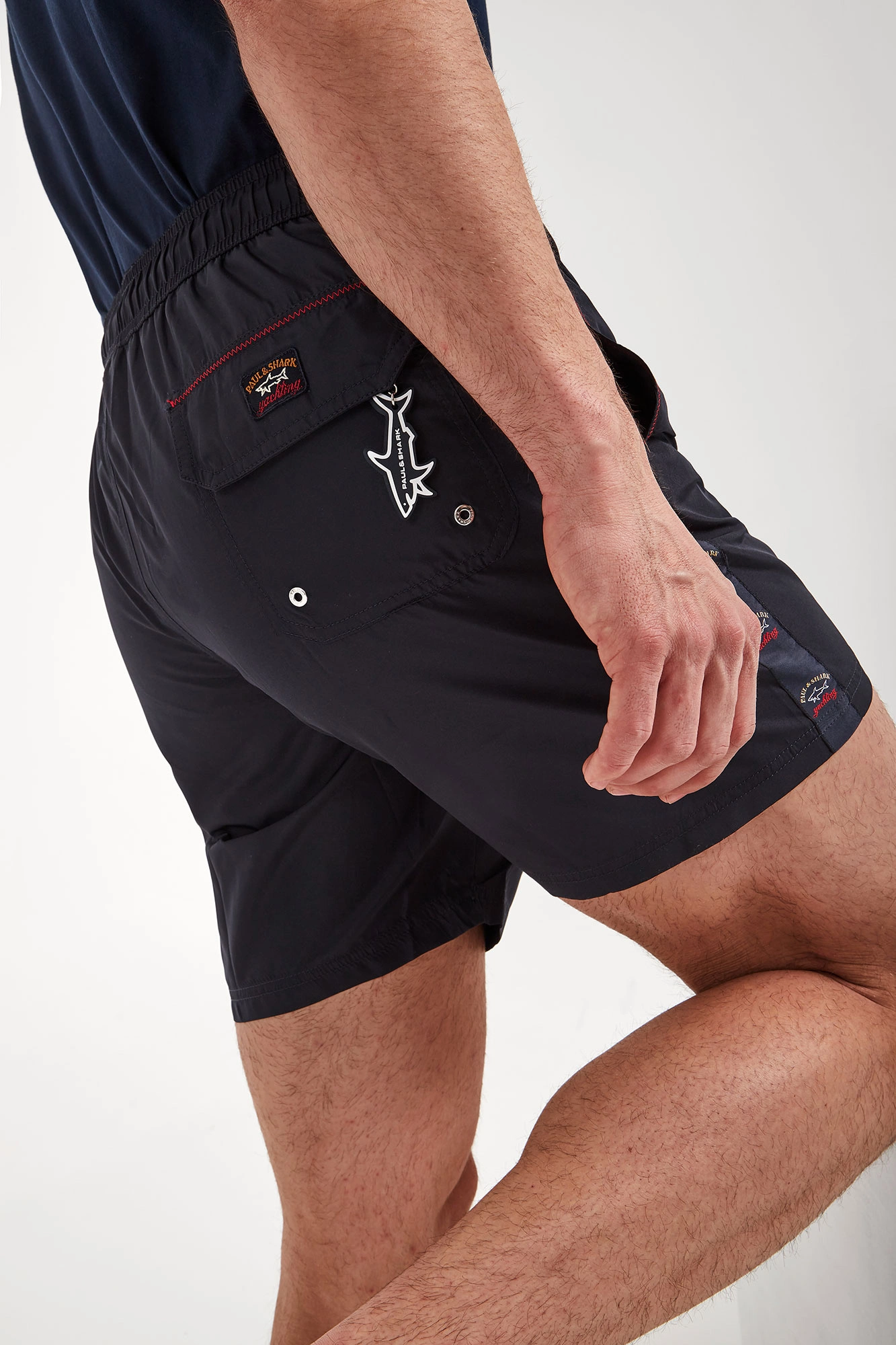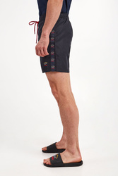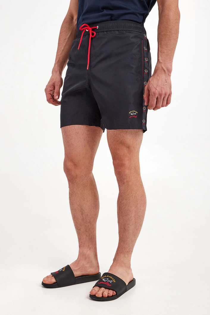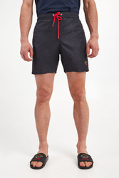Szorty kąpielowe w granatowym kolorze. W pasie elastyczny ściągacz, regulowany za pomocą troczków w czerwonym kolorze. Po bokach lampasy granatowe z nadrukiem w postaci logo marki w kolorze szortów. Na jednej z nogawek wielokolorowa naszywka w postaci logo i nazwy marki. Po bokach dwie kieszenie. z tyłu kieszonka z naszywką i brelokiem w postaci logo i nazwy marki. Wykonane z poliestru z recyklingu wspierając stabilne funkcjonowanie mórz i oceanów. Przewiewne i wygodne.