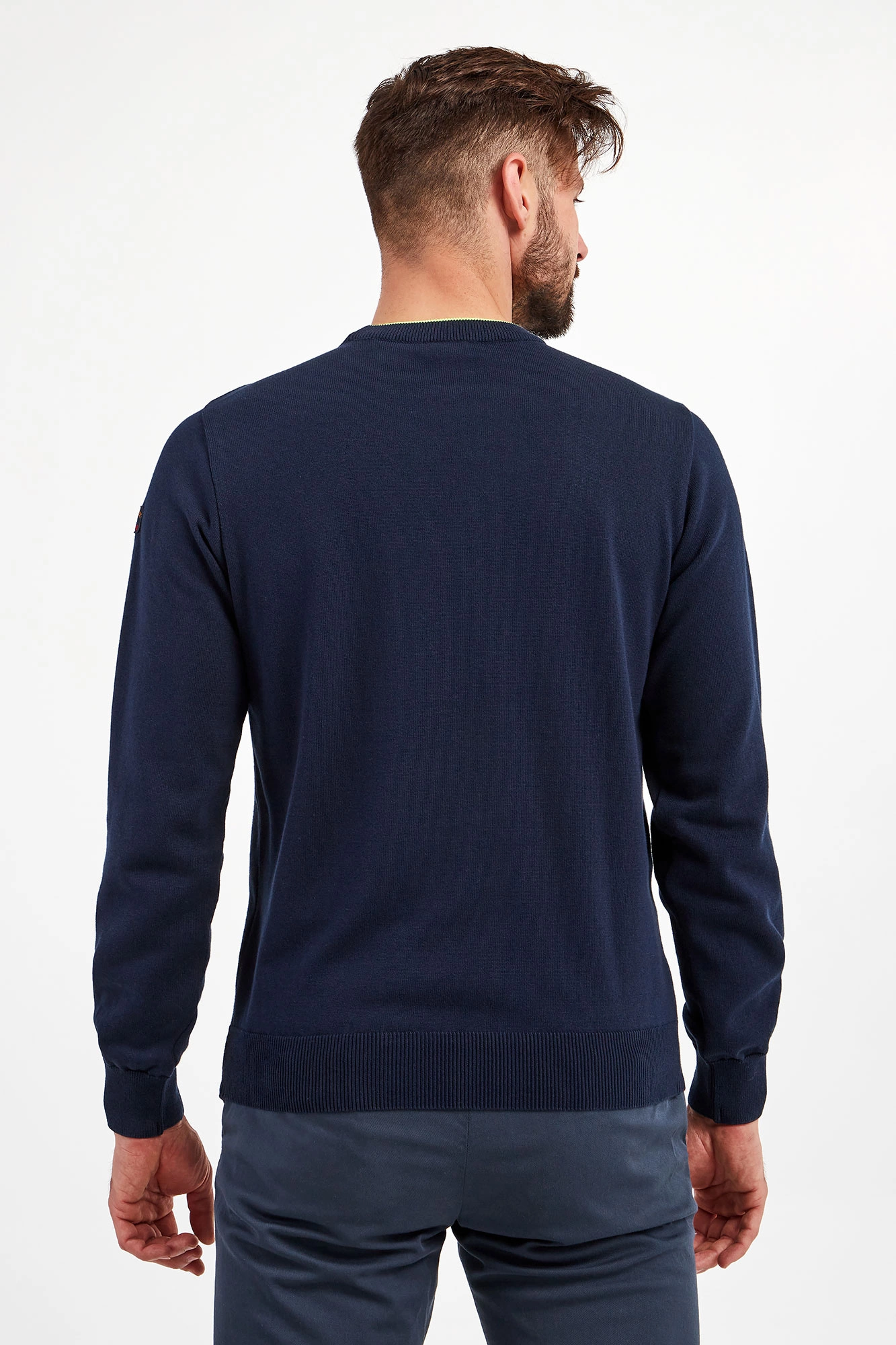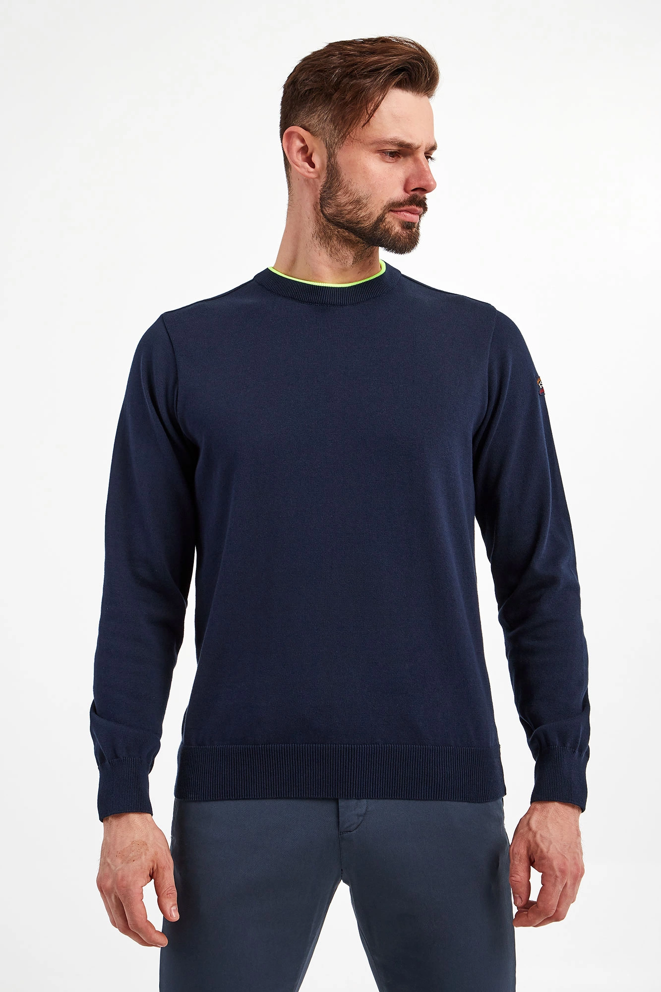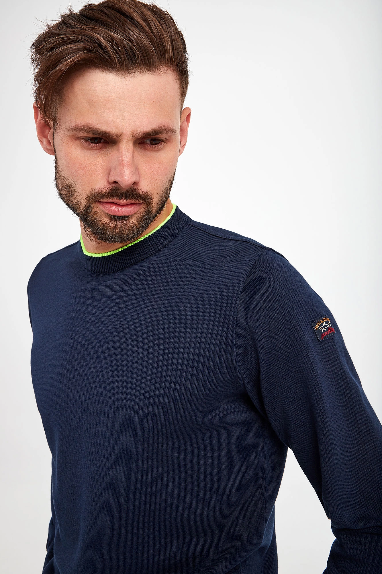 Sweter marki Paul&Shark w granatowym kolorze. Fason regular fit. Dół, dekolt i rękawy wykończone ściągaczami. Przy dekolcie delikatny pasek w kolorze neonowym żółtym. Na lewym rękawie naszywka w postaci logo i nazwy marki. Wykonany z czystej bawełny.