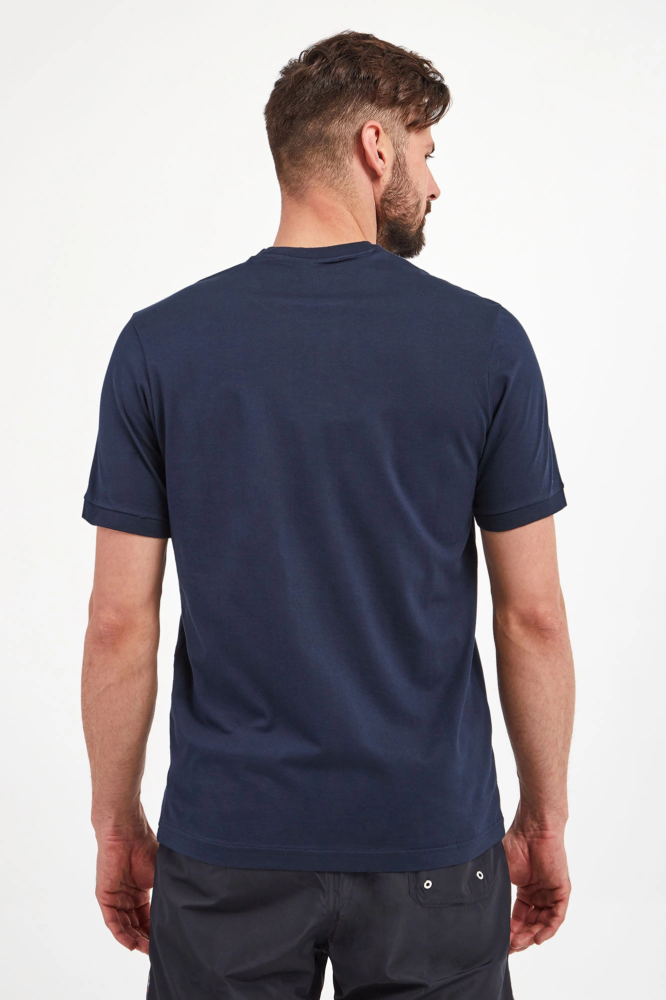 T-shirt marki Paul&Shark w granatowym kolorze. Fason regular fit. Na froncie wielokolorowy nadruk z logo i z nazwą marki. Dekolt typu o-neck i rękawy wykończone ściągaczem. Dół wykończony lamówką. Wykonany z mięsistej bawełnianej tkaniny.