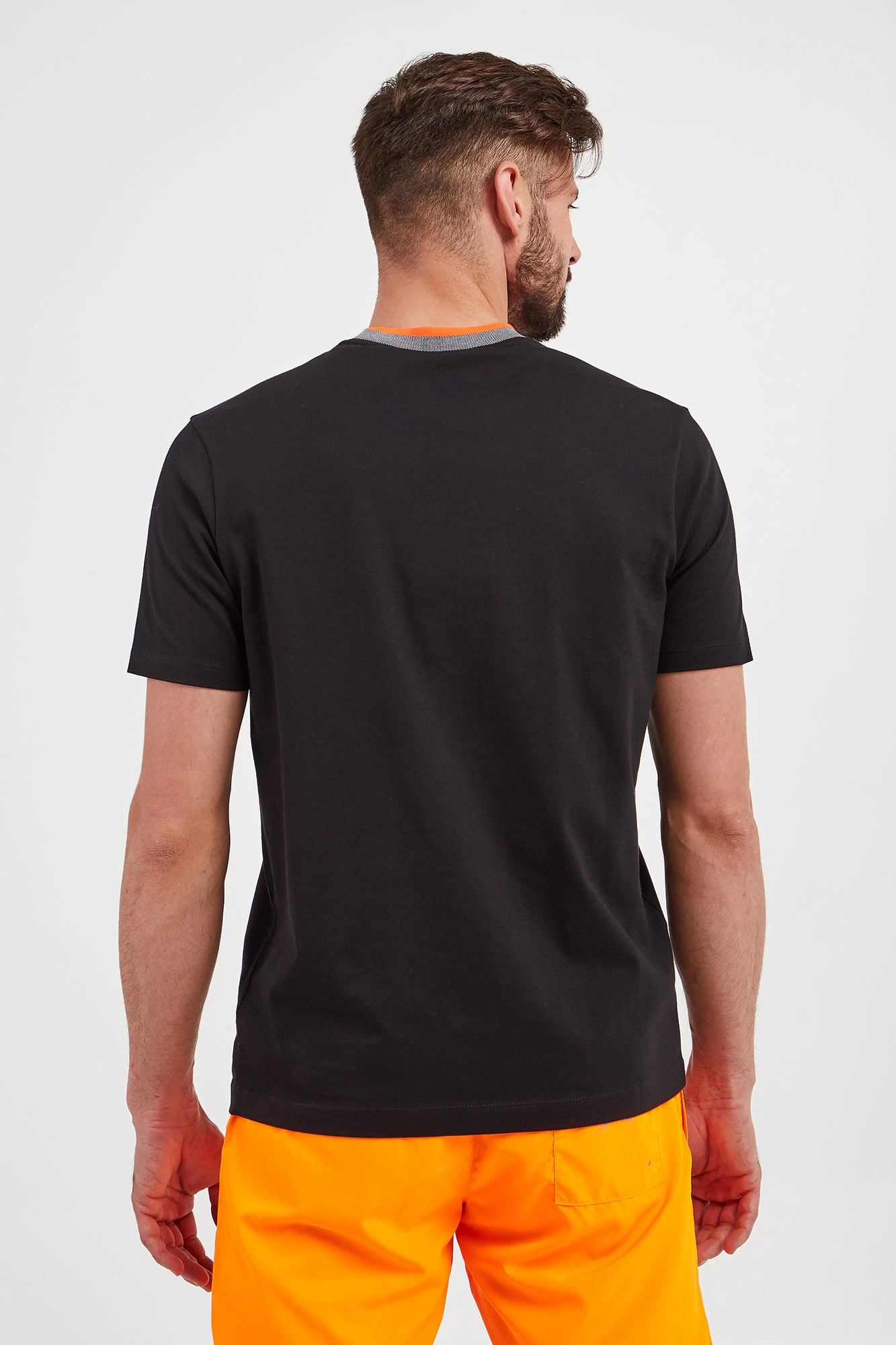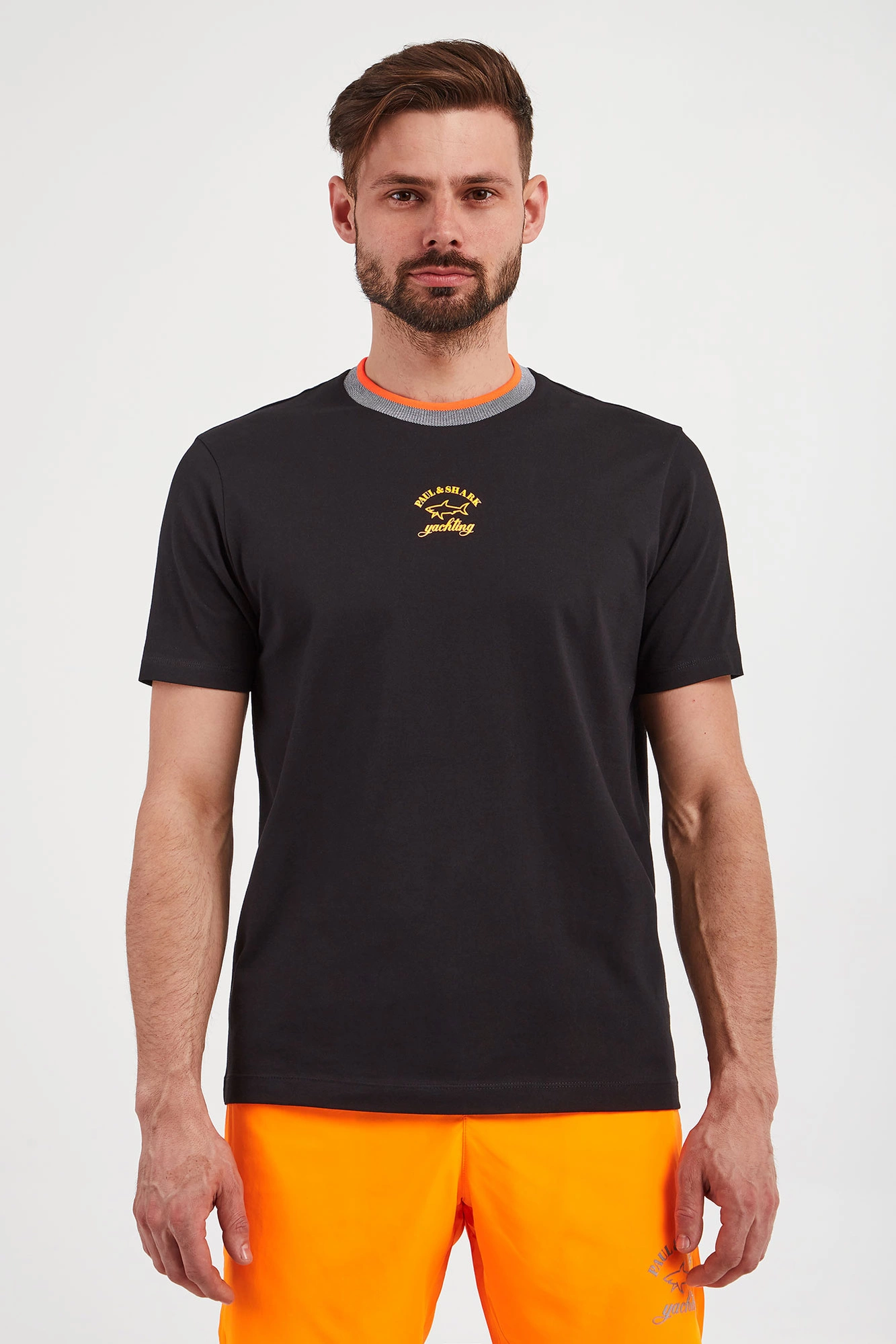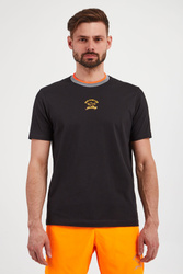 T-shirt marki Paul&Shark w czarnym kolorze. Fason regular fit. Na froncie nadruk z logo i z nazwą marki w neonowym pomarańczowym kolorze. Dekolt typu o-neck i rękawy wykończone ściągaczem. Ściągacz przy dekolcie w kolorze szarym i neonowym pomarańczowym. Dół wykończony lamówką. Wykonany z mięsistej bawełnianej tkaniny.