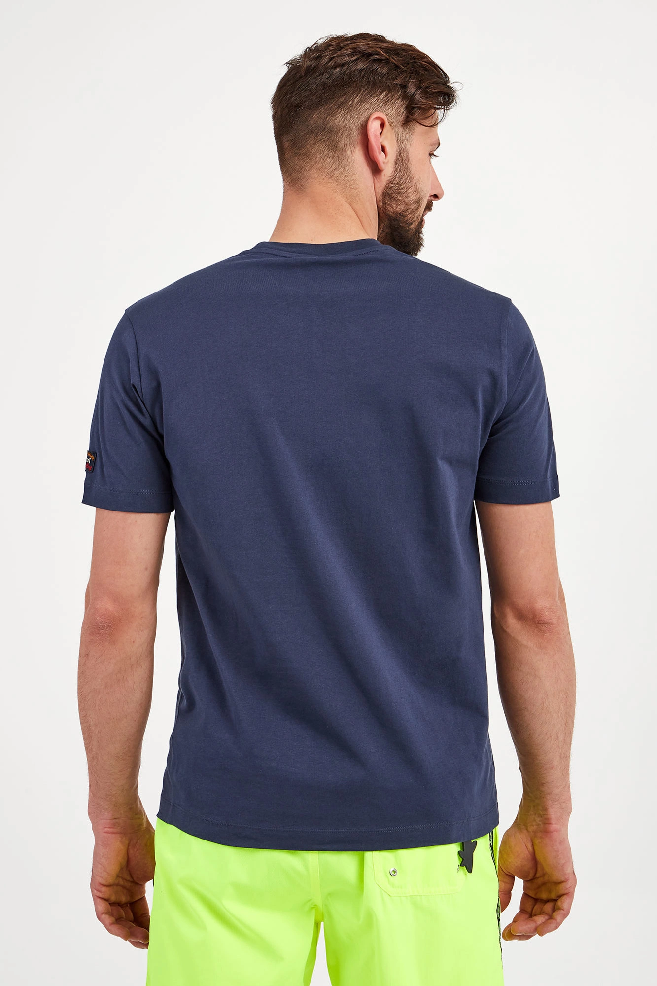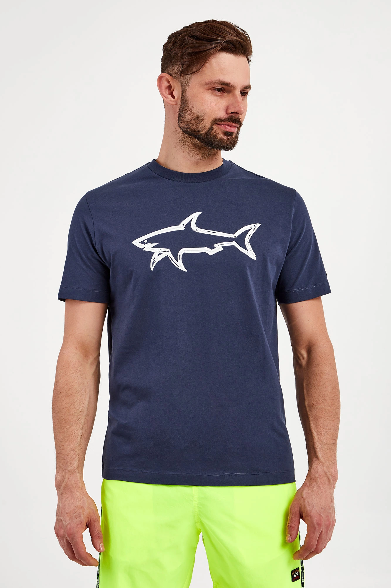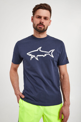 T-shirt marki Paul&Shark w granatowym kolorze. Fason regular fit. Z przodu strukturalny nadruk z logo w białym kolorze. Na lewym rękawku naszywka w postaci logo i nazwy marki. Dekolt typu o-neck zakończony ściągaczem. Krótkie rękawy i dół wykończone lamówką. Wykonany z mięsistej bawełnianej tkaniny.