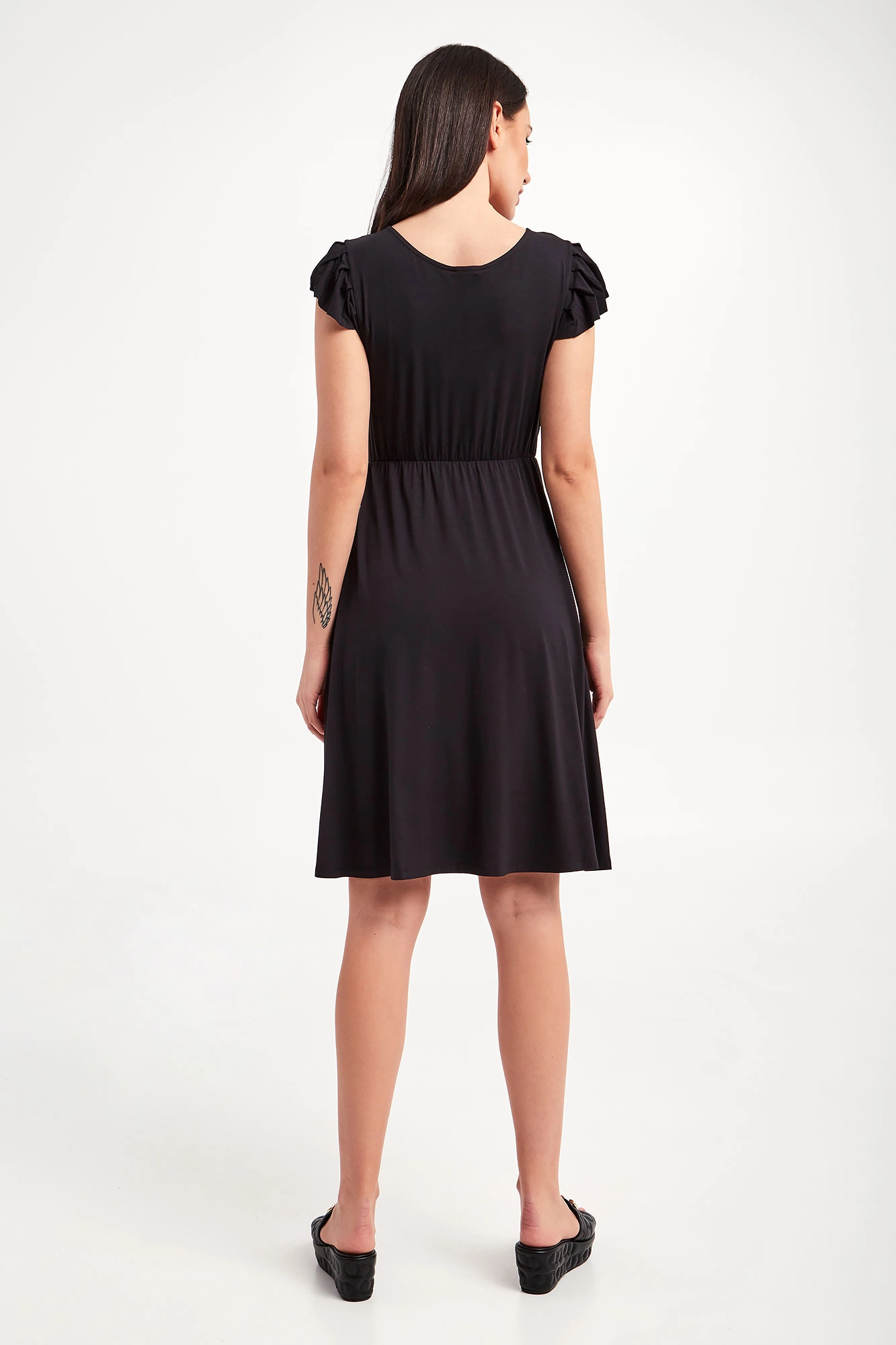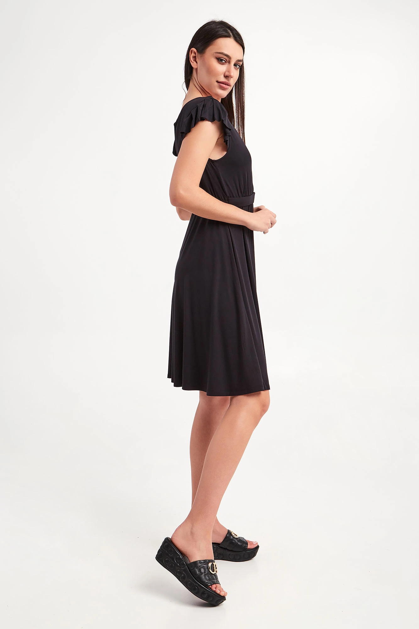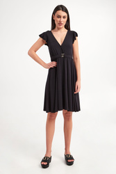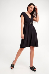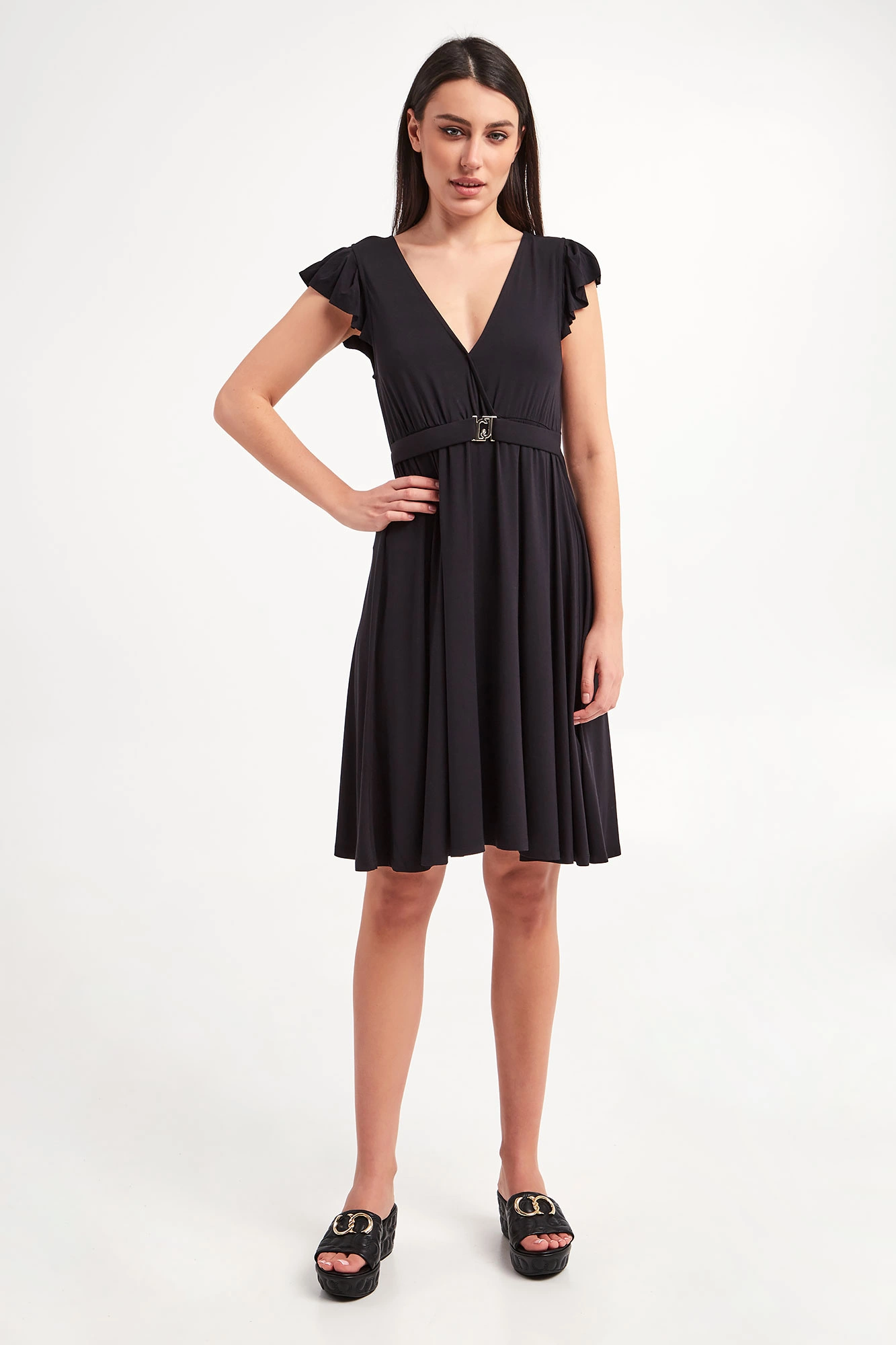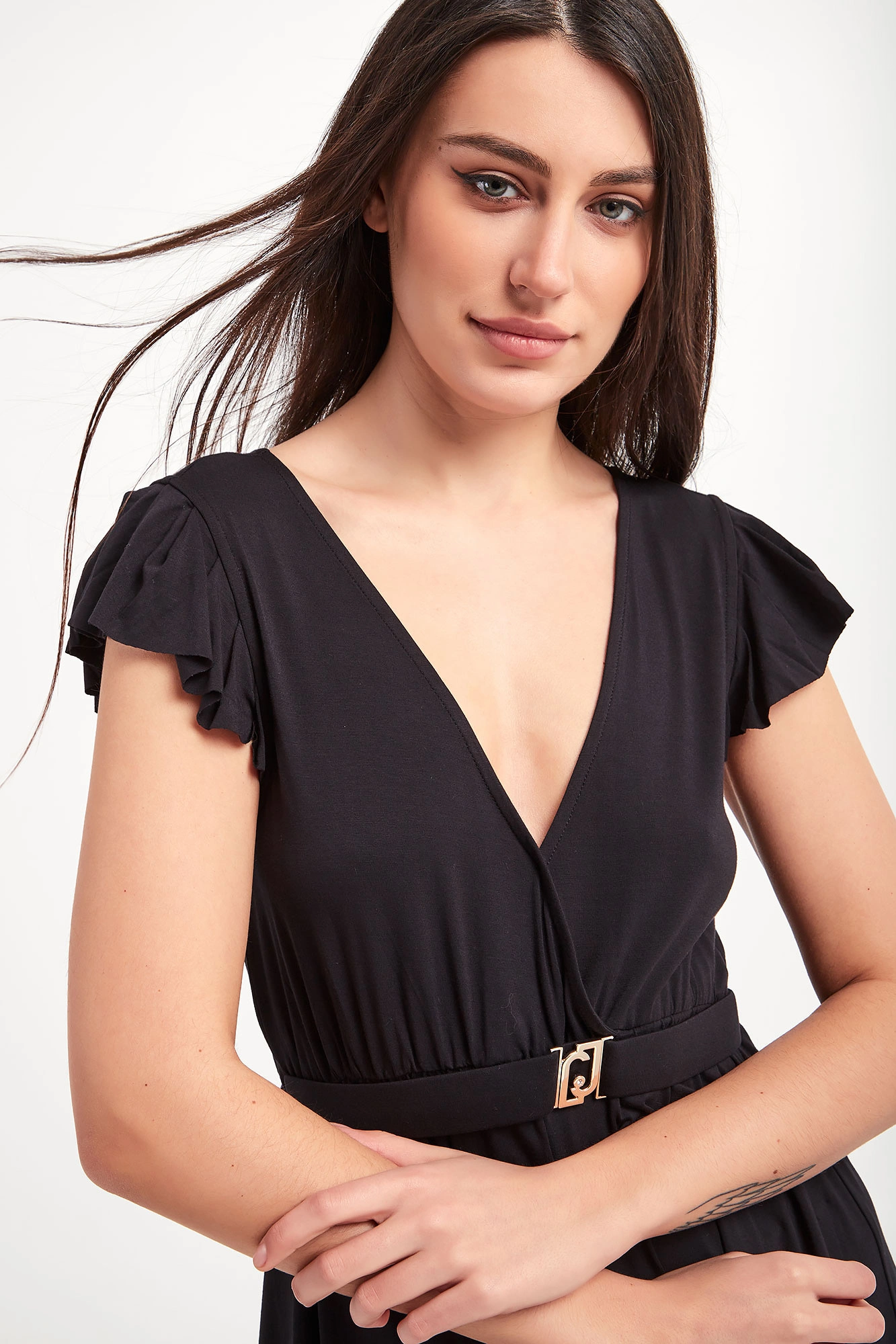 Sukienka marki Liu Jo w czarnym kolorze. Fason typu regular fit, o długości mini. Z przodu w pasie ozdobny, materiałowy pasek z metalową aplikacją w kształcie monogramu marki. Dekolt typu v-neck wykończony przeszyciem. Krótkie kawy ozdobione falbanami. Wykonana z elastycznej wiskozy.