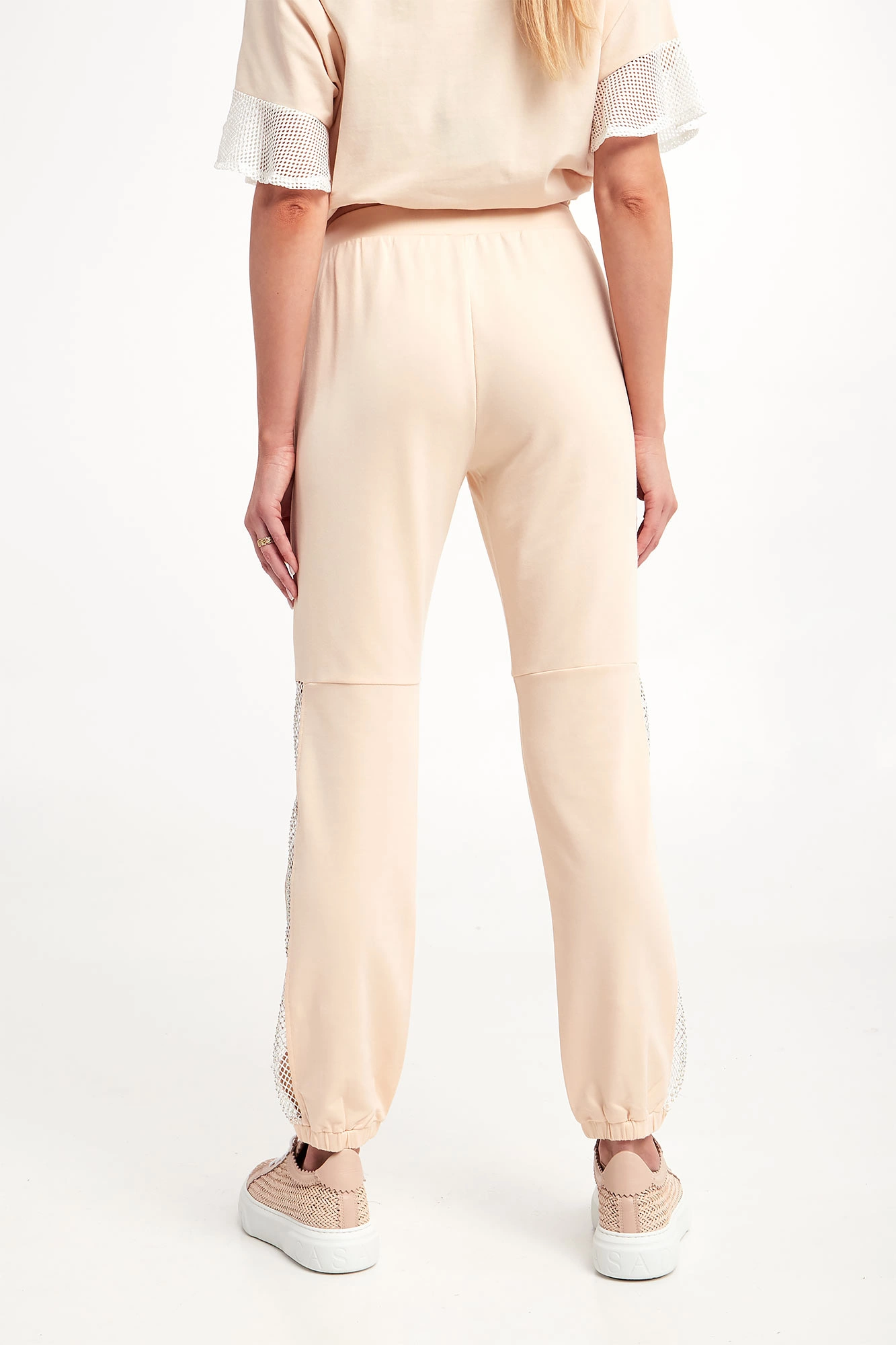 Spodnie dresowe marki Liu Jo Sport w beżowym kolorze. W pasie elastyczny ściągacz regulowany za pomocą materiałowych troczków. Model z dwoma kieszeniami. Na jednej z kieszeni srebrna aplikacja w postaci nazwy marki. Nogawki wykończone elastycznym ściągaczem. Po bokach, część nogawki pokryta elastyczną siatką w białym kolorze z hologramowymi kryształkami.