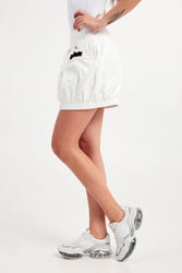 Spódnica marki Armani Exchange w białym kolorze. Fason regular fit. Zapinana z tyłu na kryty zamek. Po bokach kieszenie. Na dole elastyczny ściągacz. Z przodu czarna aplikacja i nadruk w postaci logo i nazwy marki. Spódnica wykonana z gniecionej tkaniny. Długość mini.