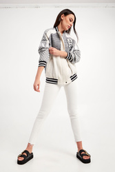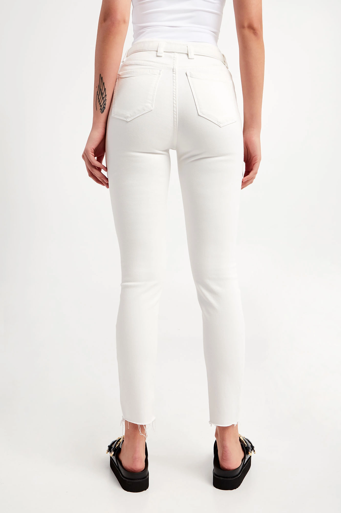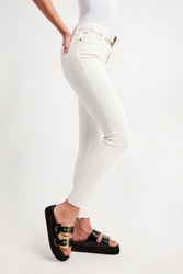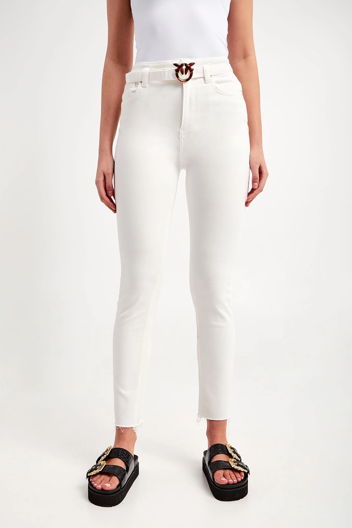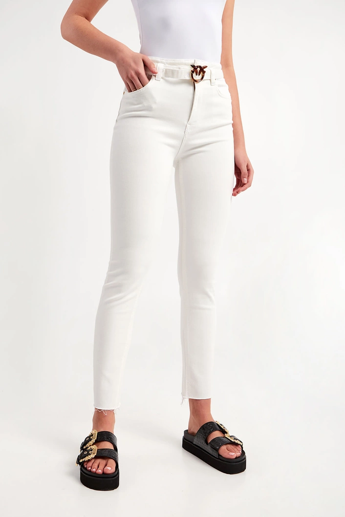 Jeansy marki Pinko w białym kolorze. Dopasowany krój slim fit. Zapinane za pomocą zamka oraz haftki. Model z pięcioma kieszeniami. W zestawie pasek z klamrą z charakterystycznym logo "Love Birds" w brązowo-złotym kolorze. W pasie szlufki. Nogawki zakończone strzępieniem.