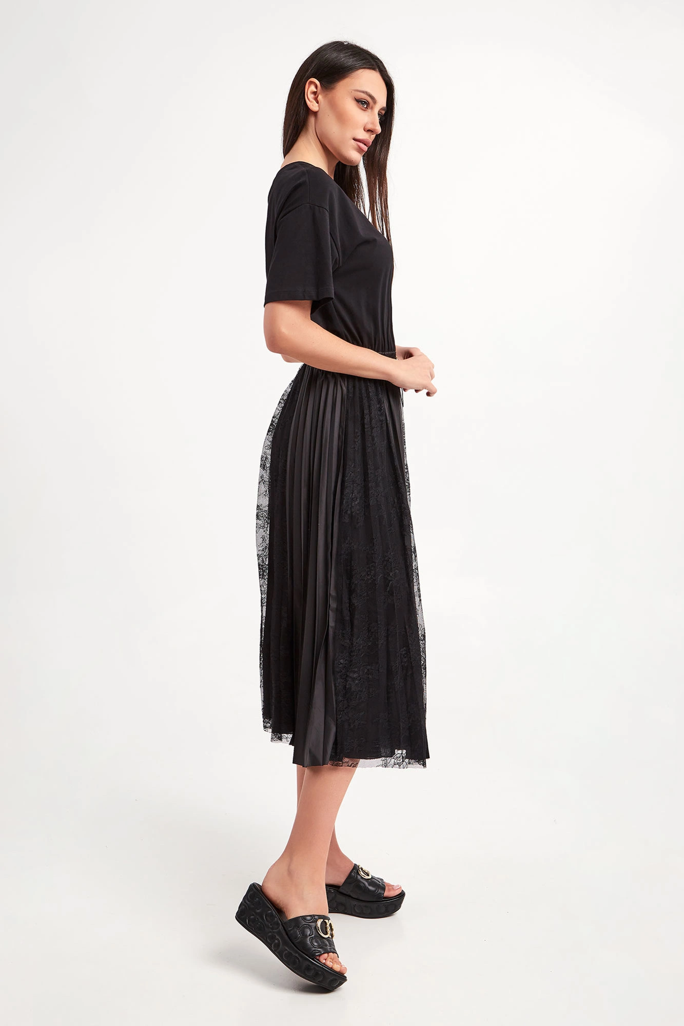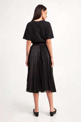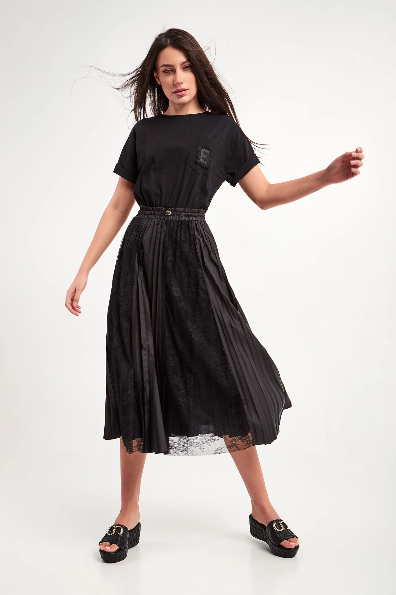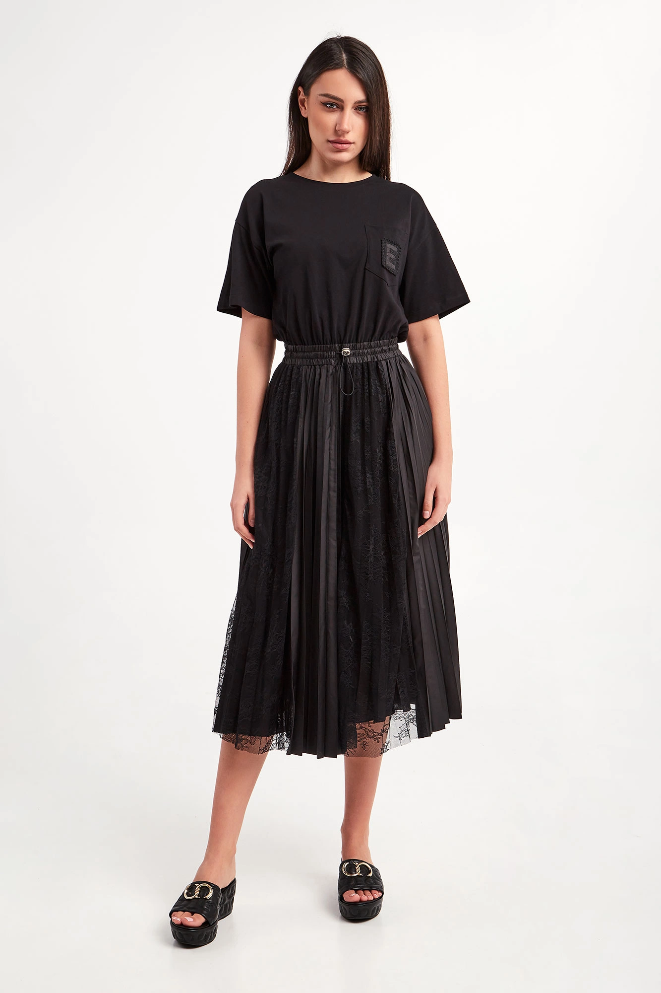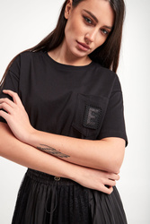 Sukienka marki Ermanno Firenze w czarnym kolorze. Fason regular fit, długość mini. Z boku kieszeń, a na niej haft z monogramem marki. Dekolt typu o-neck zakończony ściągaczem. Krótkie rękawy wykończone lamówką. W pasie ściągacz z regulacją. Dół plisowany, z koronkowymi, ażurowymi wstawkami.